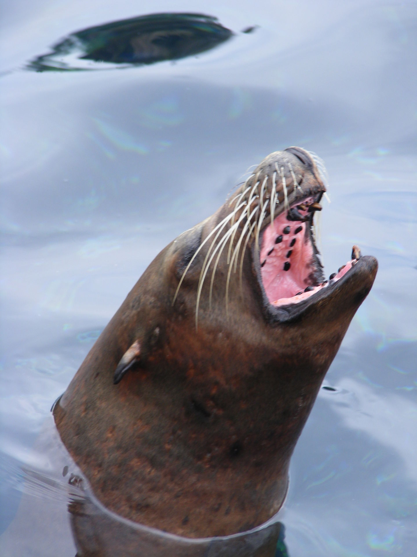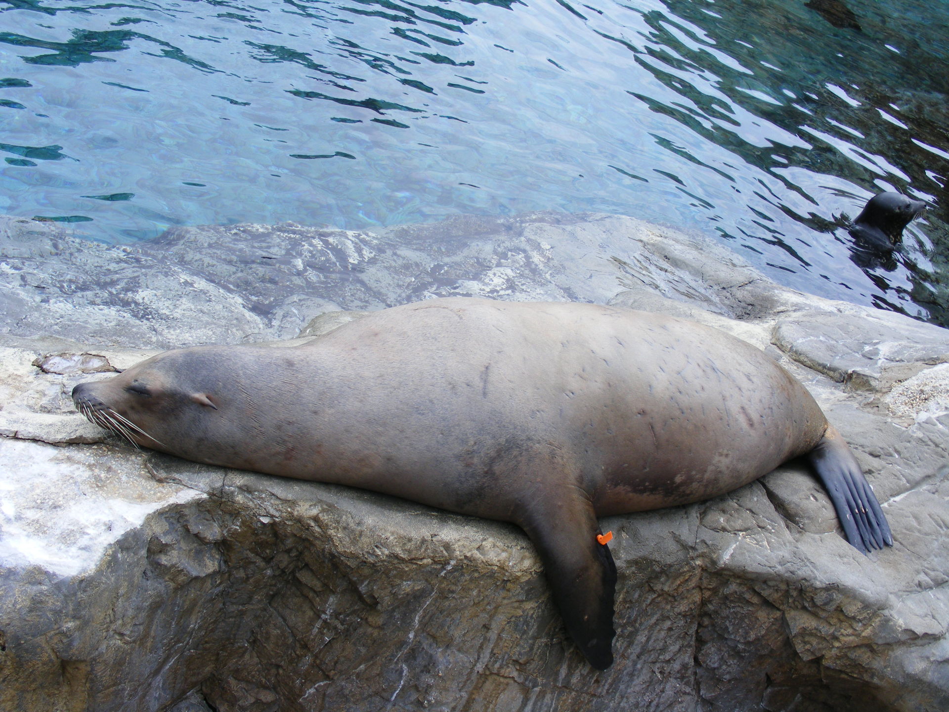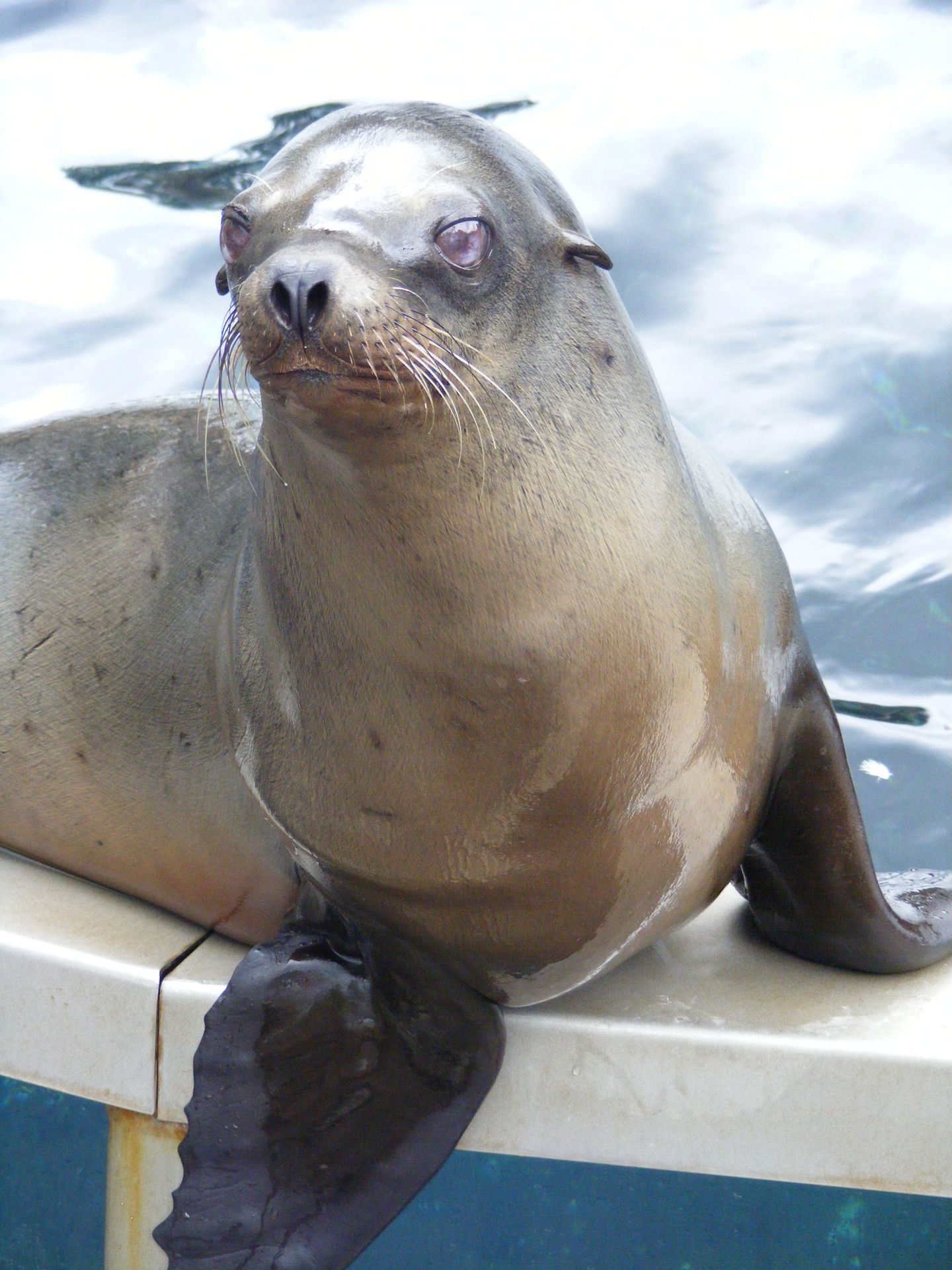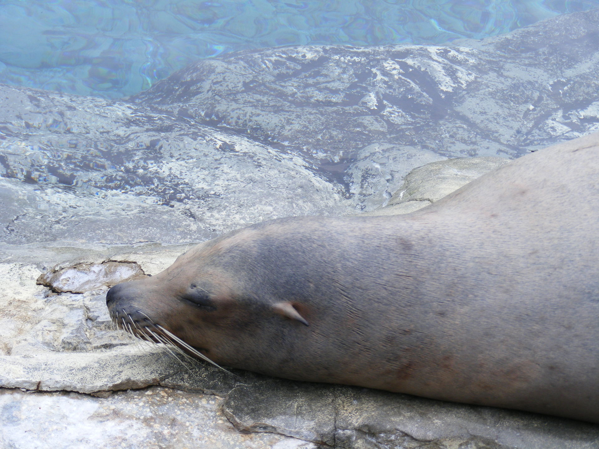 Etwas weiter in diesem Bereich hatten die Seelöwen ihr zu Hause, die schon mit großen Kulleraugen um Fisch bettelten. Natürlich konnte man 4 Minifischli zum Preis von 5 Dollar in einer Box erwerben,um die armen hungernden Seelöwen zu füttern, wenn denn nicht die "agressive birds" einem einen Strich durch die Rechnung machten. Die warteten nur darauf, bis ein Besucher einen Fisch Richtung Seelöwen warf, um dazwischenzugehen. Alternativ mopsten sie ihn auch direkt aus der Hand, wenn man in zu lange in der Hand hielt.