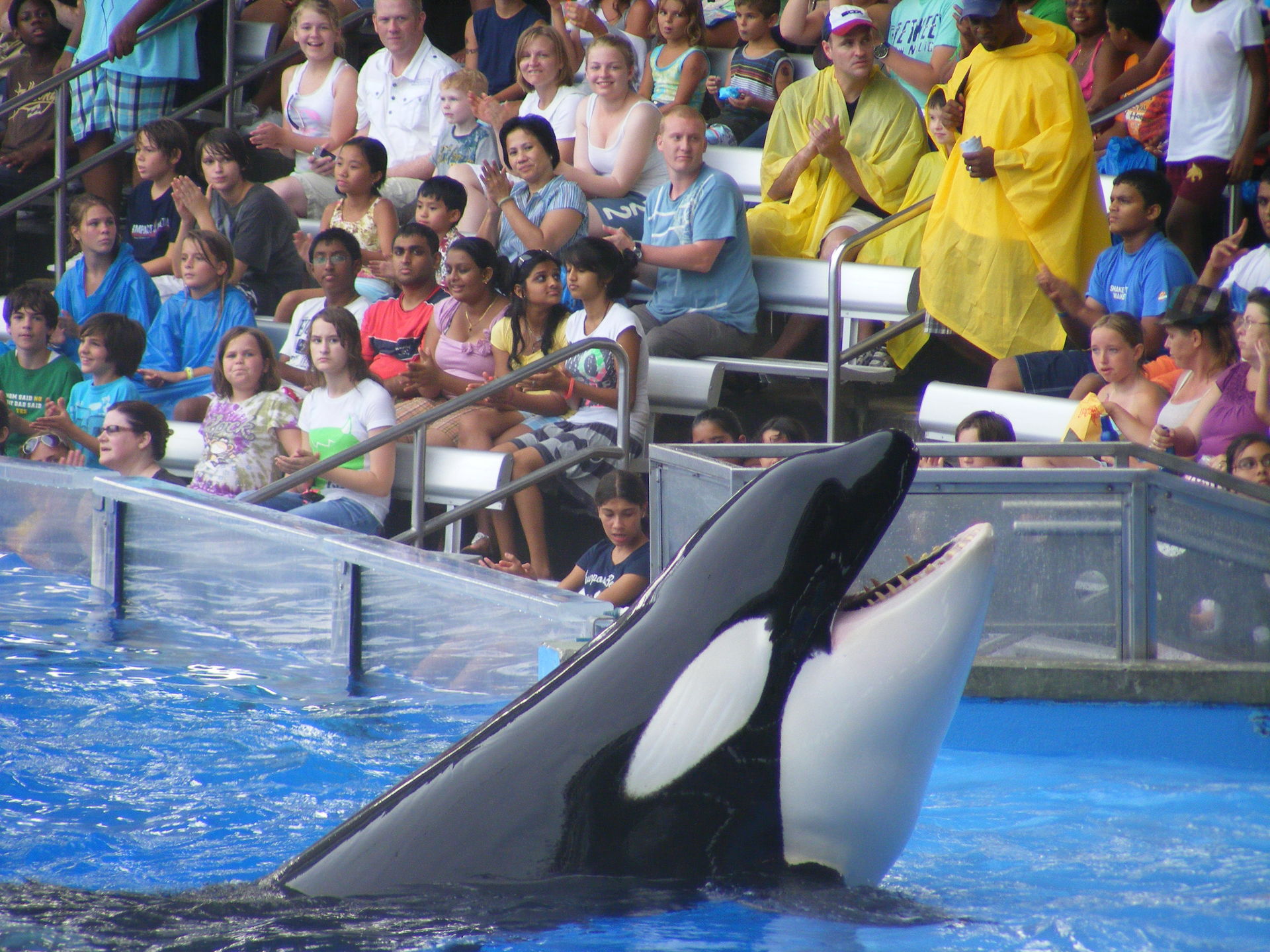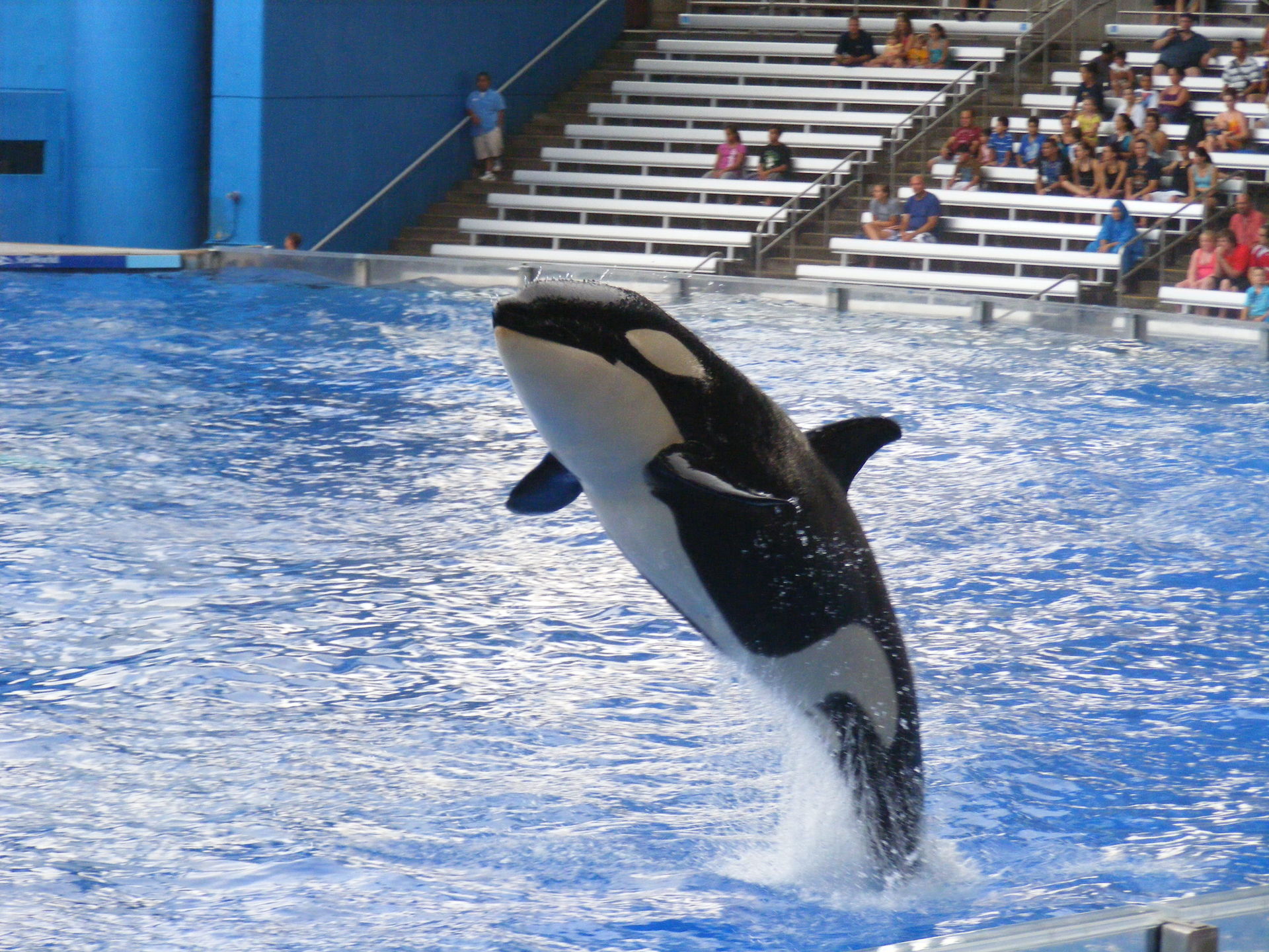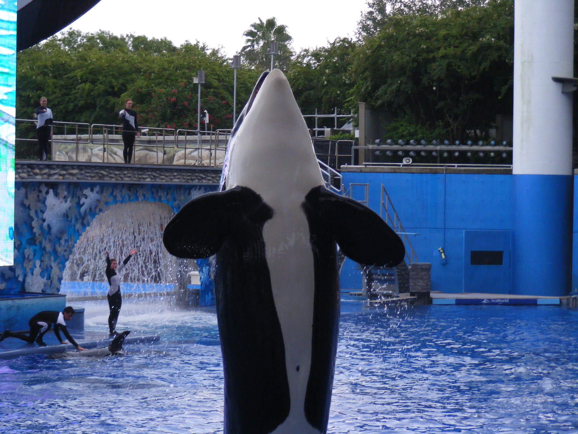 Dann mussten wir natürlich auch "das Highlight" des Parks kennenlernen, die große Shamu Show Believe. Oh my god! Erstens: Das Vieh sieht schon imposant aus. Zweitens: Die Show selber ist gleichermaßen mäßig wie unspektakulär, außer einmal Besucher nassmachen und ein paar Hüpfer durchs Wasser kam da nicht viel. Drittens: Die Preshow geht gar nicht! Zunächst wird einem ein Sea World Imagefilm vorgespielt, der so schlecht und aufgesetzt ist, dass man sich fast übergeben müsste. Da werden ausgewilderte Schildkröten gezeigt, Delfine und kleine Jungs, die am Strand herumtollen, während die Wale im Hintergrund im Meer im Sonnenuntergang vorbeiziehen. Dann kommt der Freggel auf die Bühne: "We believe! Believe in our troops fighting in afghanistan". Und unsere Freunde die Engländer. Und unsere Freunde die Deutschen, die alle ihr Leben riskieren für die Sicherheit Amerikas. Hallo? Nachdem er dann noch fragte, wer mal selbst in der Army war und sich Amerikaner mit beigem Cowboyhut, beigen kurzen Shorts und Socken in den ebenfalls beigen Sandalen erhoben und sich an die Brust griffen, alternativ sich selbst applaudierten, spätestens da dachte ich, ich bin im falschen Film. Hat man das Getöse überstanden folgt die Shamu Show, die wie gesagt nett, aber auch reichlich unspektakulär ist.