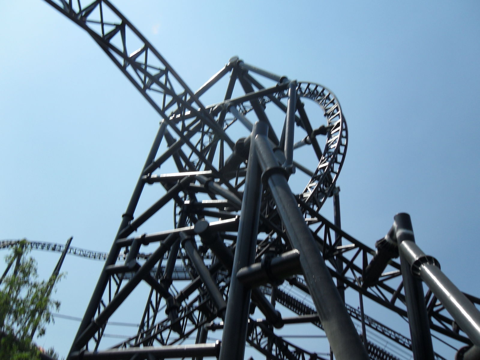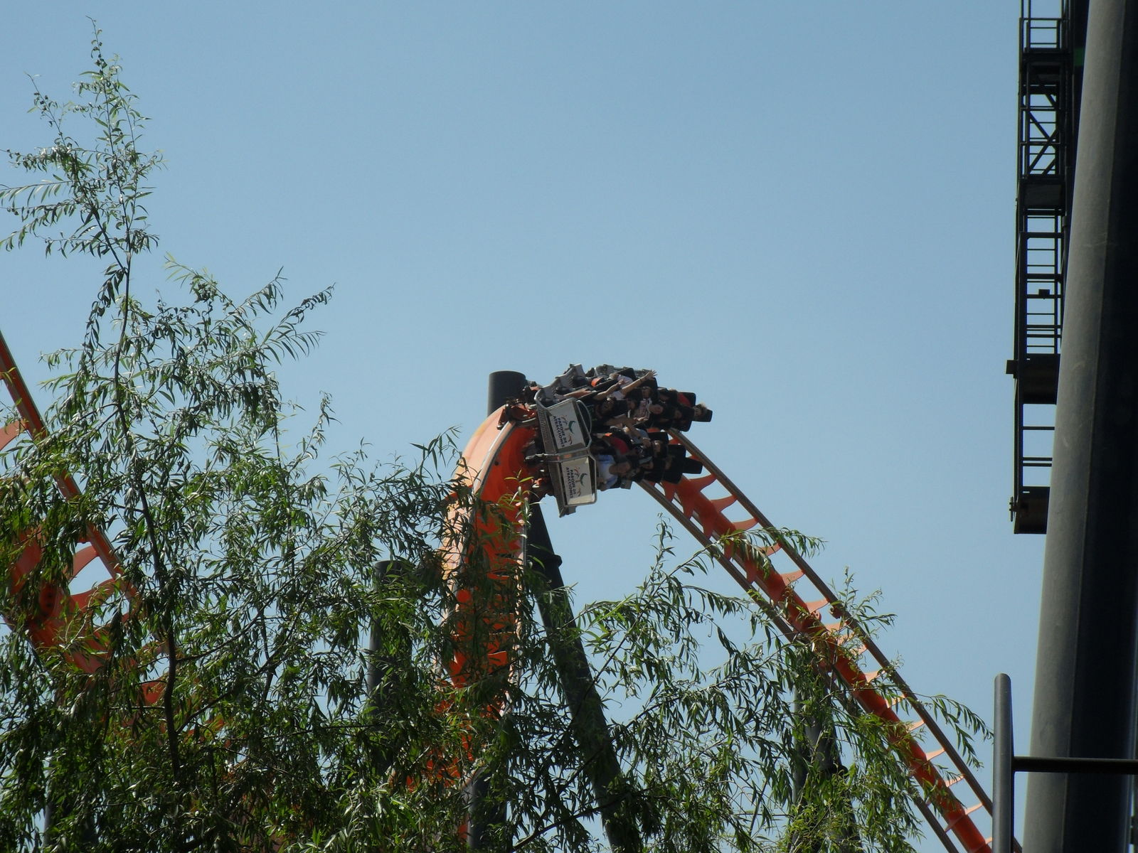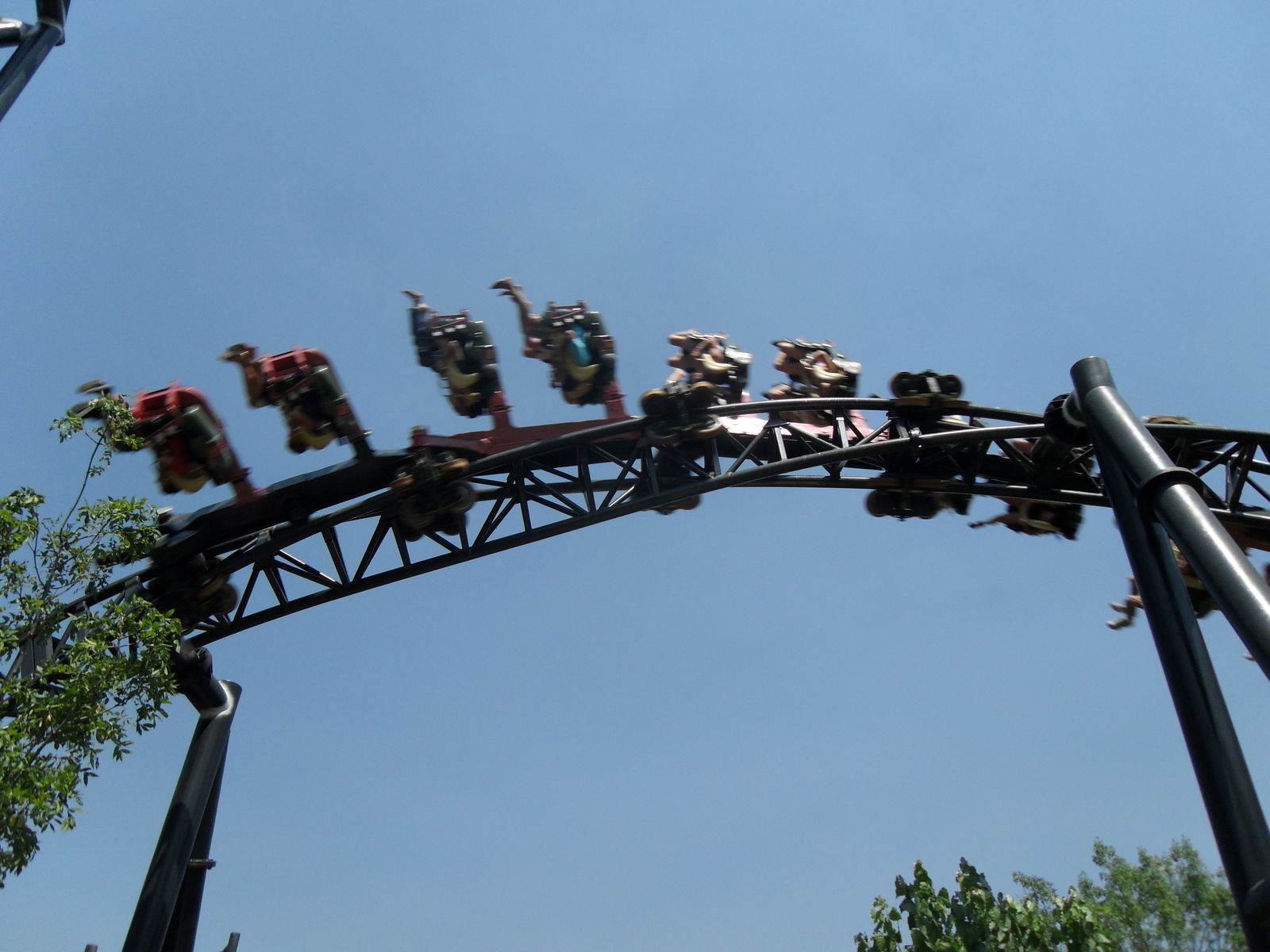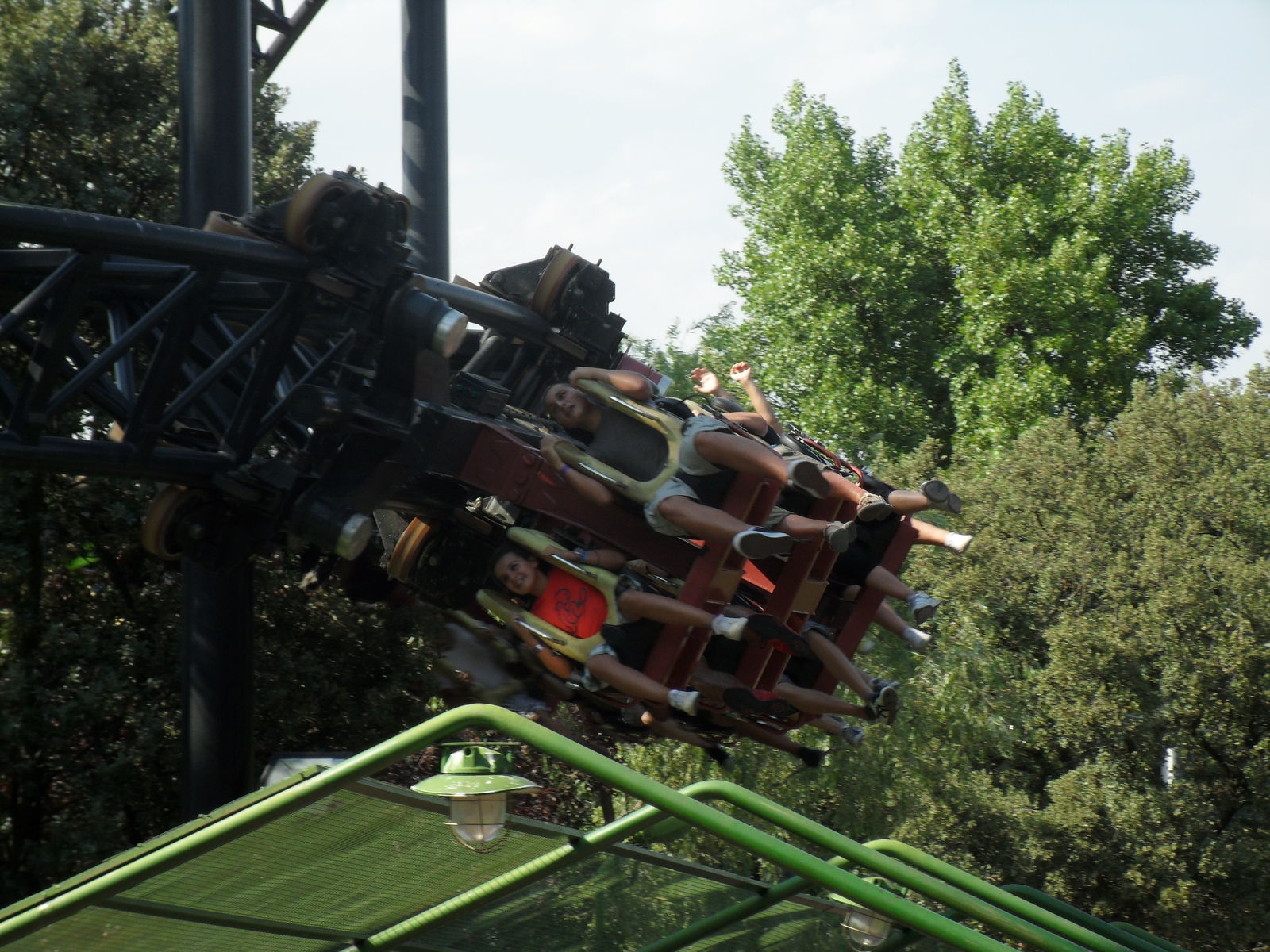 Was schon ein komisches Gefühl ist, da man ja nur einen Beckenbügel hat. Nach einige Sekunden ist man vom Lift frei und fährt in die Herzrolle man rast mit 105 km/h an der Station vorbei in einen Overback-Turn, anschließend folgt ein Airtimehügel wo man satte