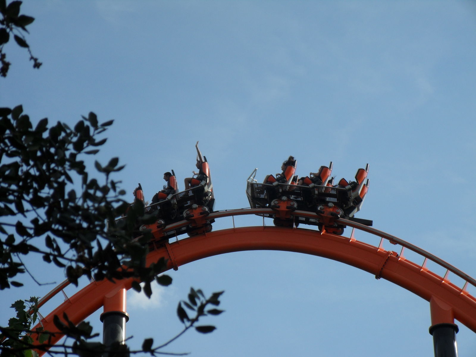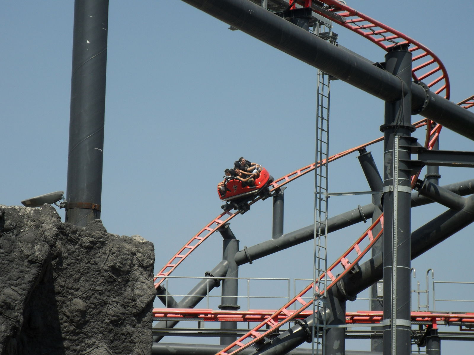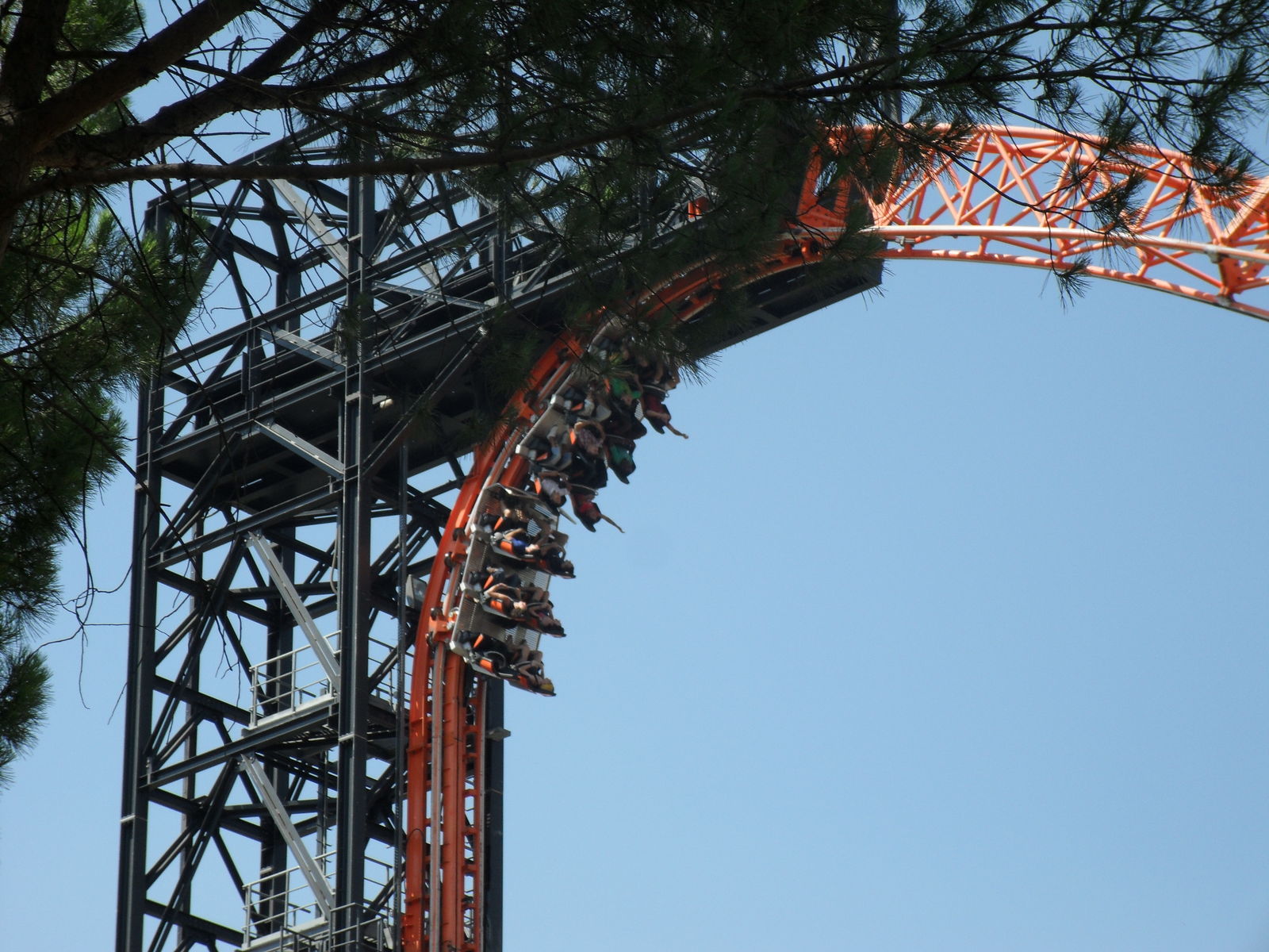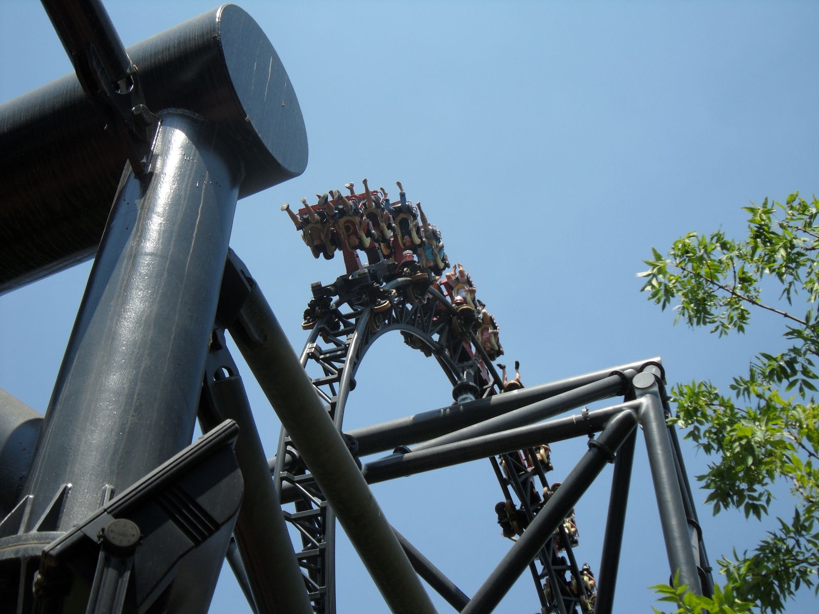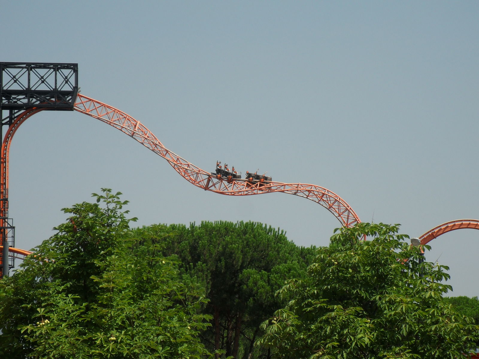 Was schon ein komisches Gefühl ist, da man ja nur einen Beckenbügel hat. Nach einige Sekunden ist man vom Lift frei und fährt in die Herzrolle man rast mit 105 km/h an der Station vorbei in einen Overback-Turn, anschließend folgt ein Airtimehügel wo man satte