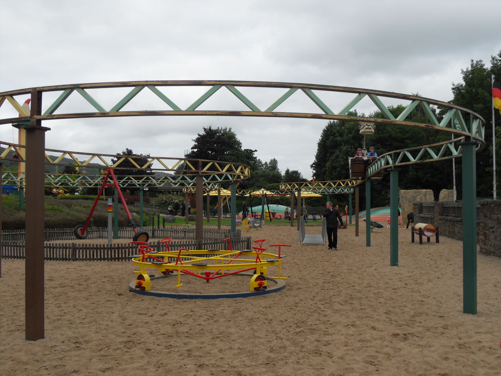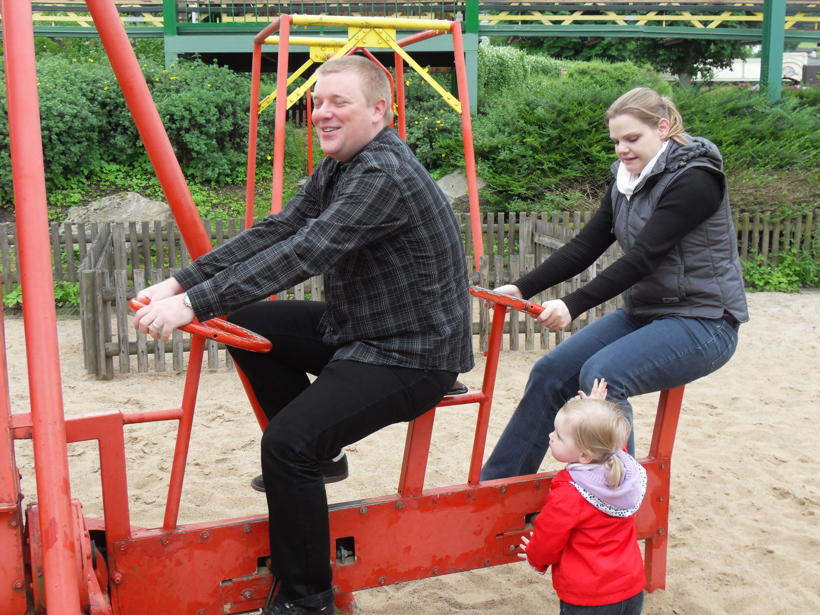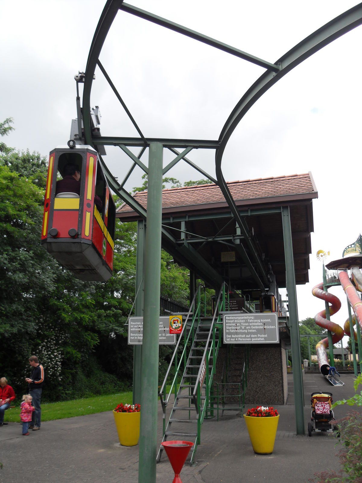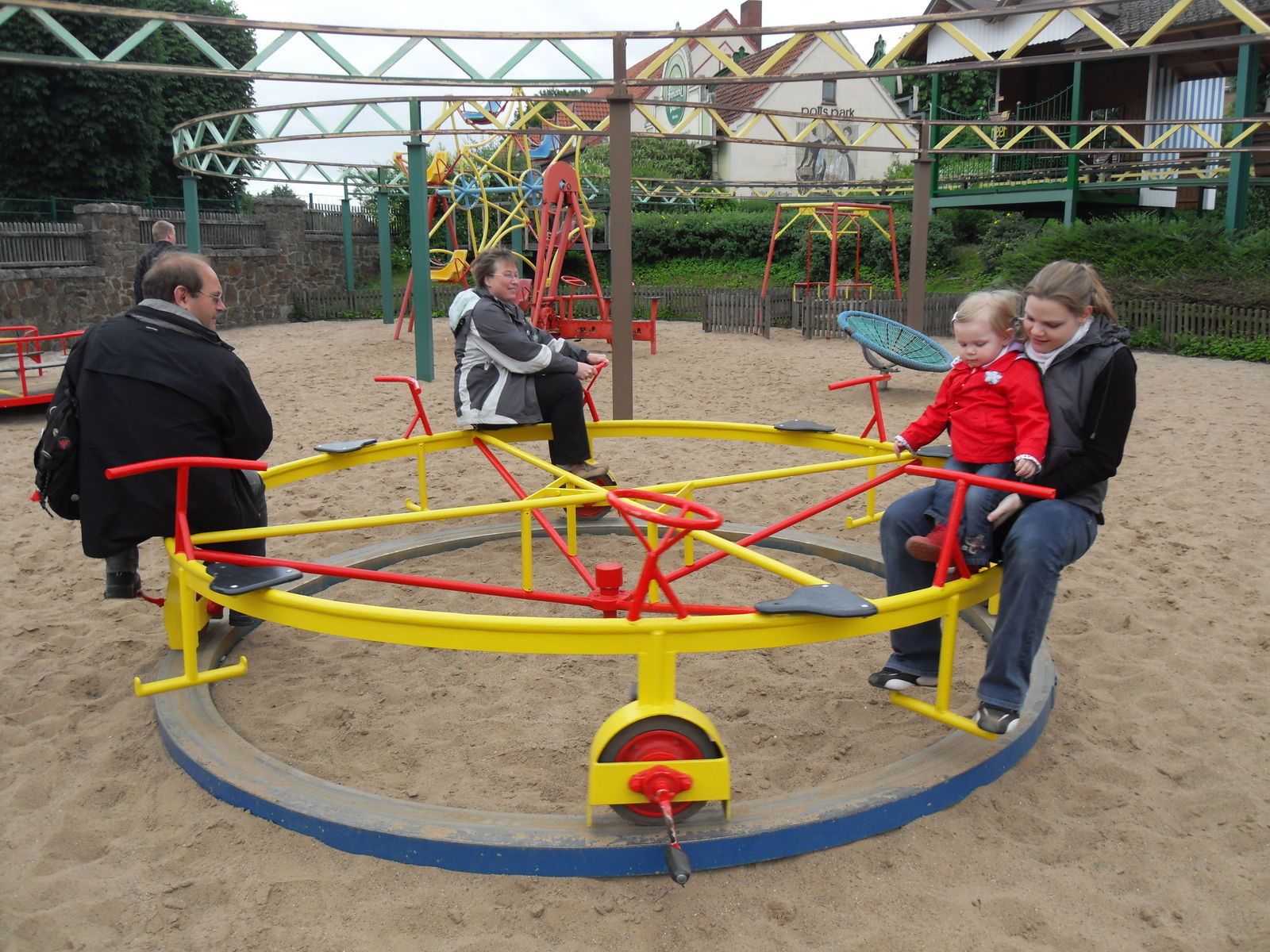 Anschließend tobten sich Jung und Alt wieder auf einem Spielplatz aus, um den herum auch eine merkwürdige Tret-Einschienen-Hängebahn fuhr, die natürlich auch angetestet wurde. Ganz schön anstrengend das Teil.