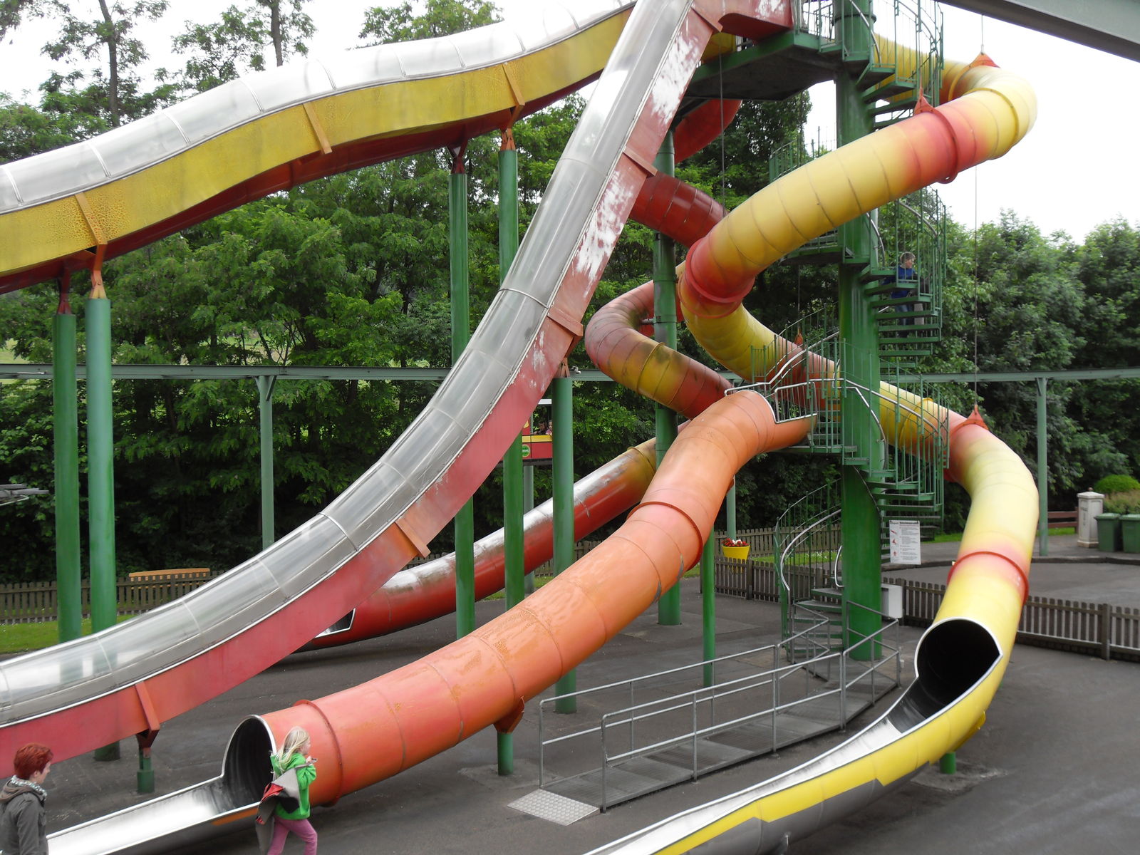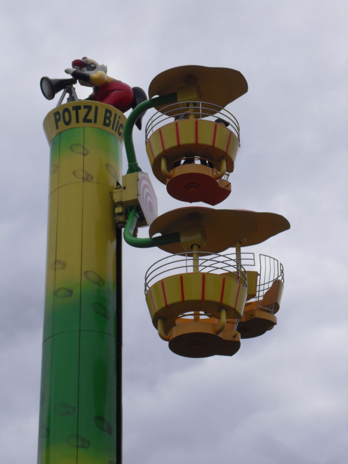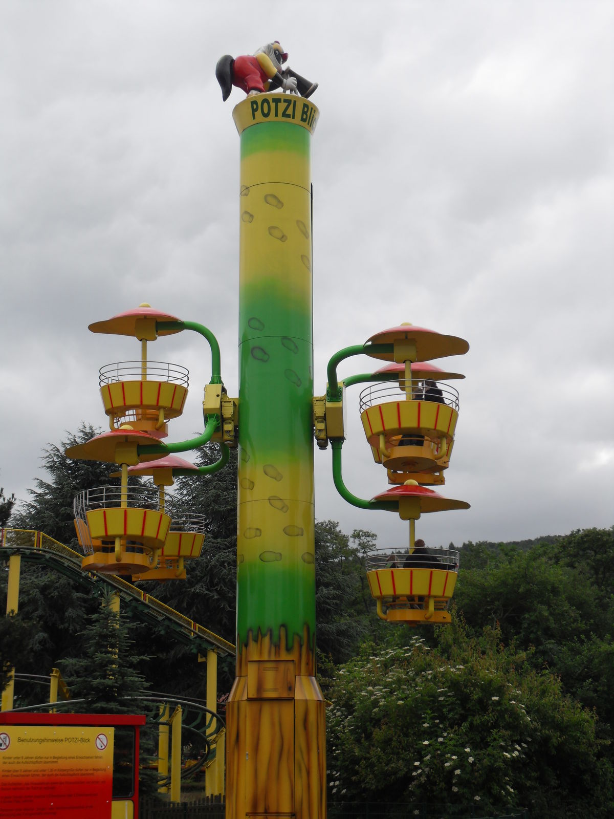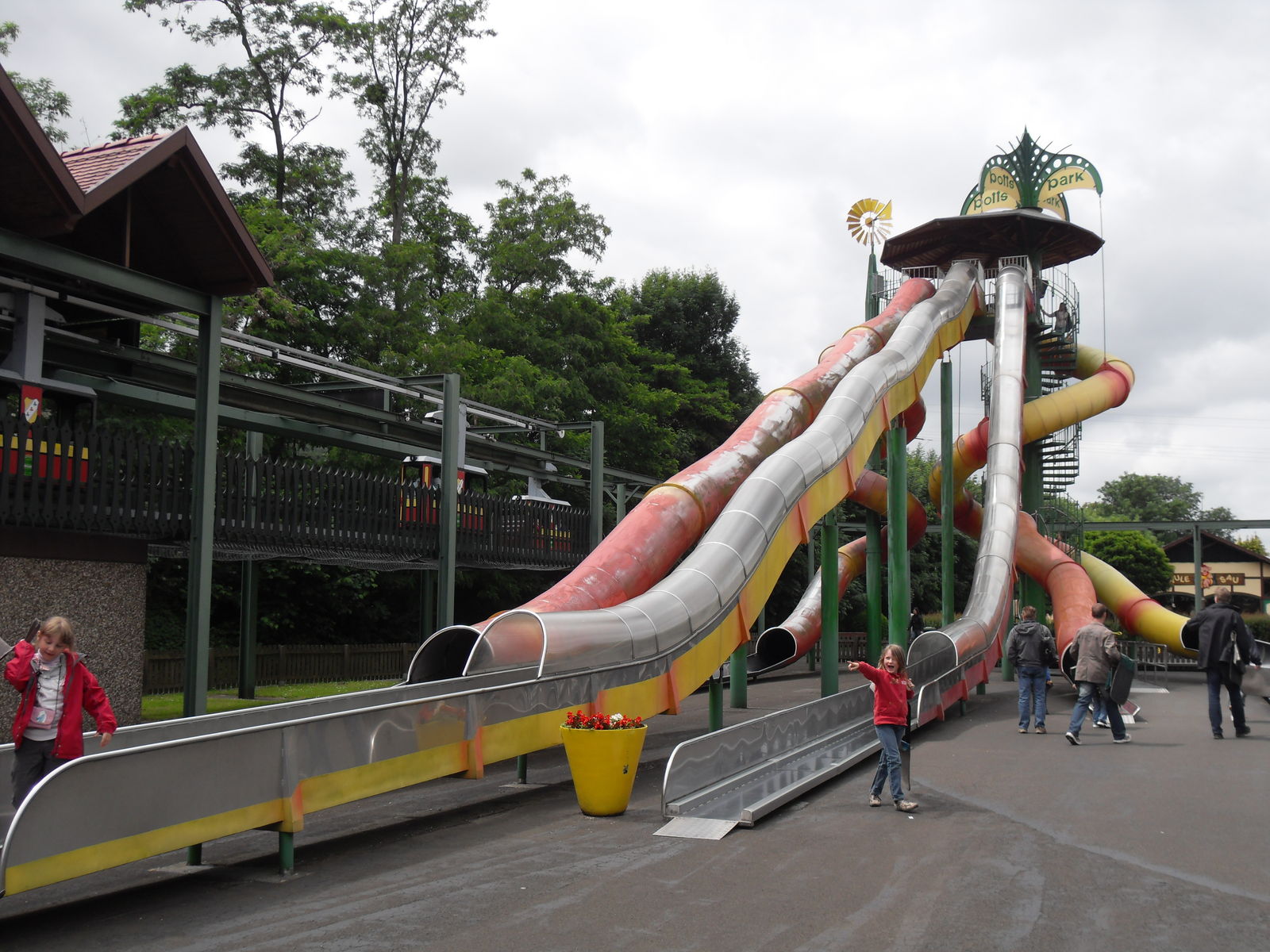 Als nächstes trafen wir auch eine Wasserrutsche. Nachdem wir uns ein paar Fahrten angesehen hatten, entschieden wir uns gegen eine Fahrt, da die Besucher teilweise wirklich komplett durchnässt da wieder ausstiegen. Da das Wetter sehr wechelshaft war an diesem Tag und es viele bewölkte und kältere Abschnitte gab verzichteten wir dankend und widmeten uns lieber dem Potzi Blick.