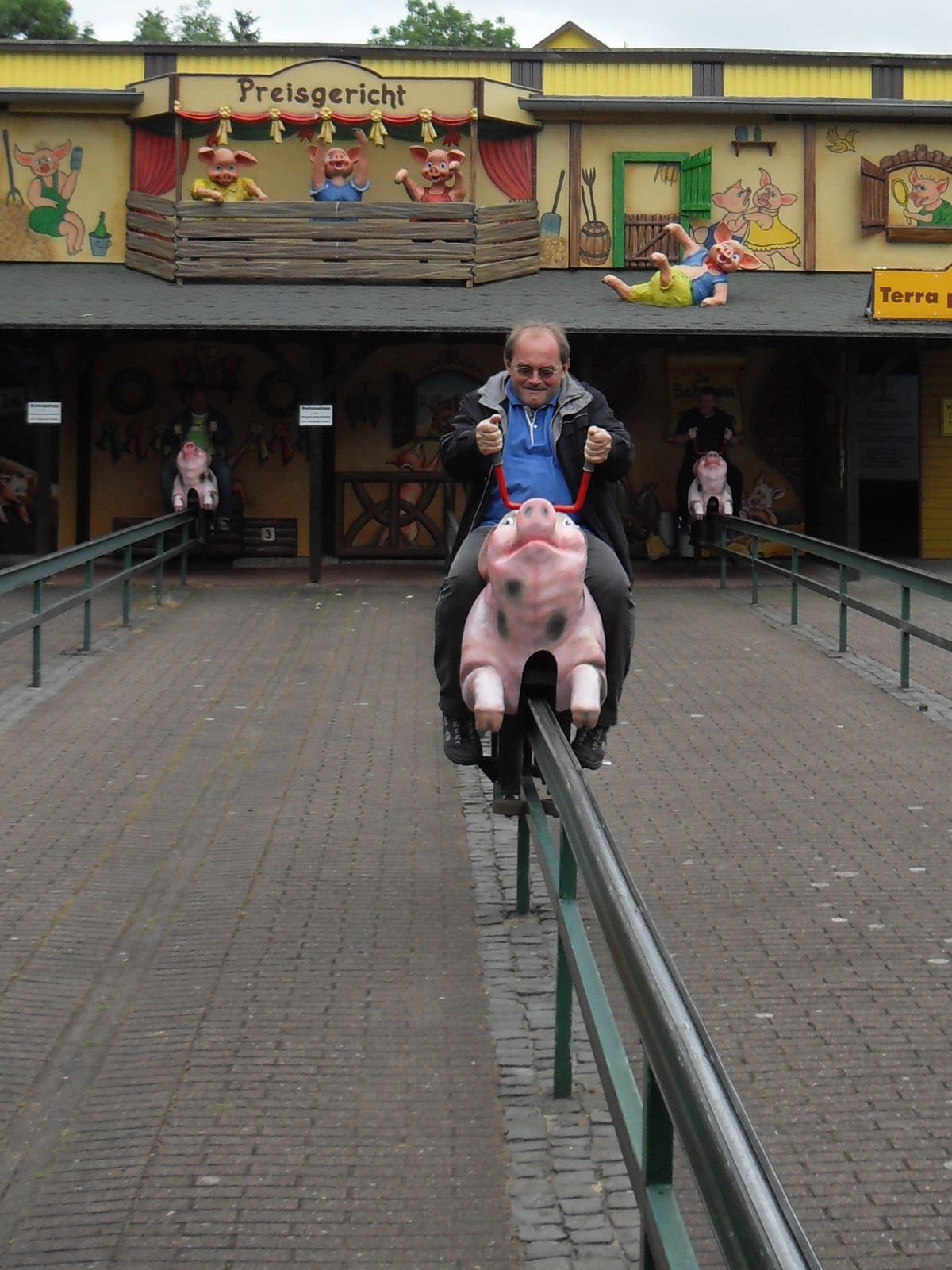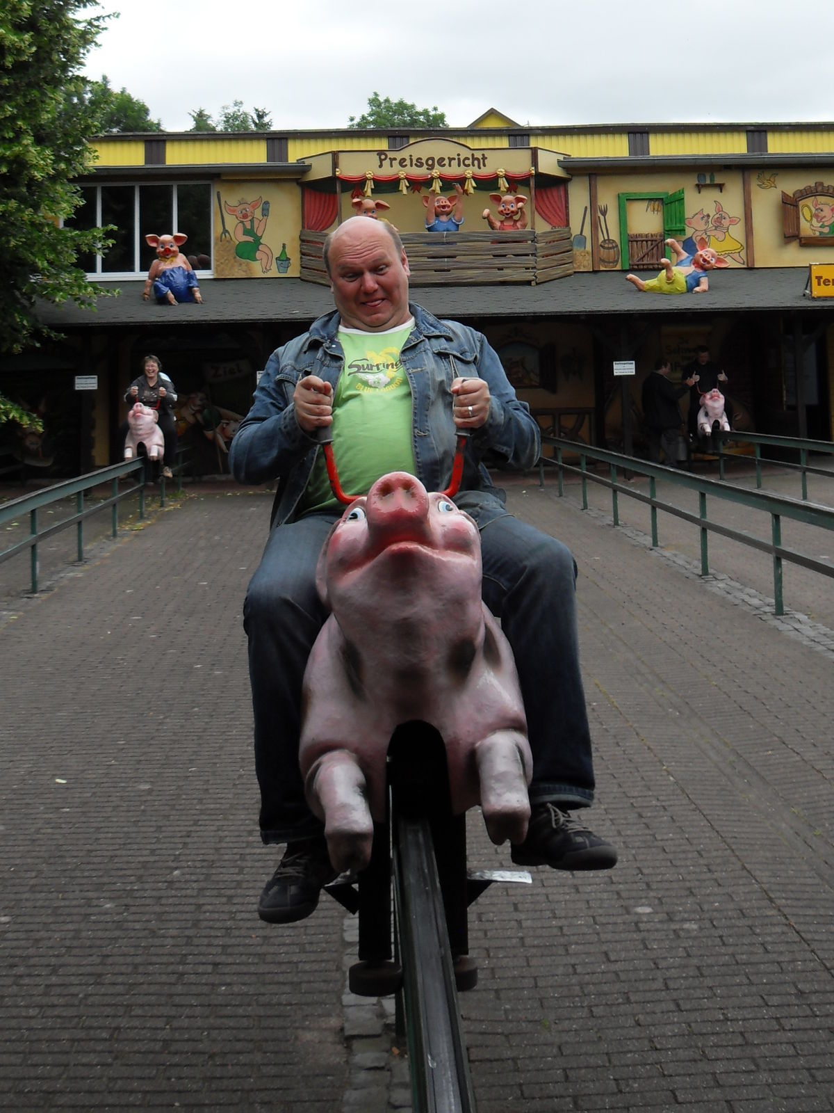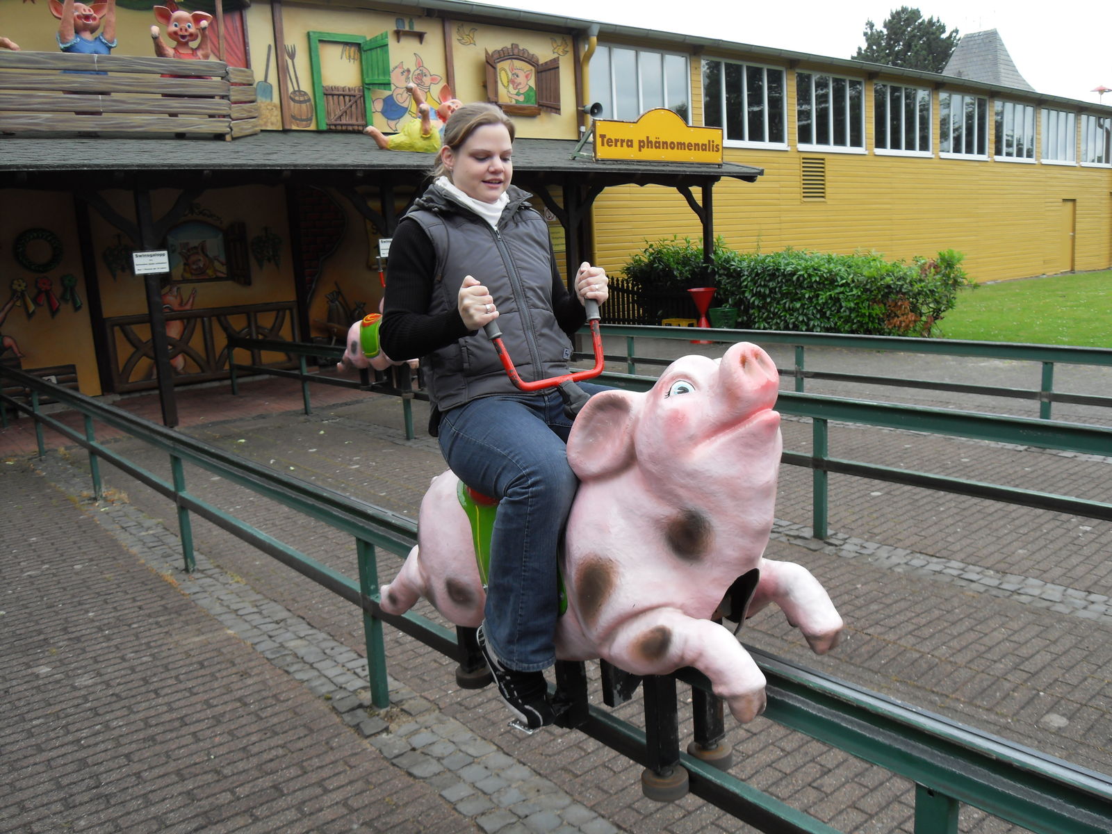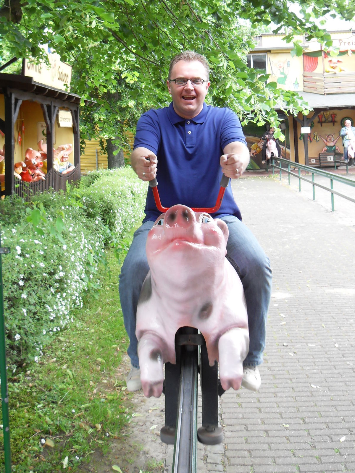 Danach wurde es schweinisch im Potts Park. Als erstes stand nun der "Swins Galopp" auf dem Programm, bei dem man sich mit seinen Freunden ein lustiges Schweinerennen liefern kann. Durch eine ausgeklügelte Hebeltechnik muss man auf einem Schwein sitzend vorwärts kommen um als erstes das Ziel zu erreichen. Sehr lustige Angelegenheit.