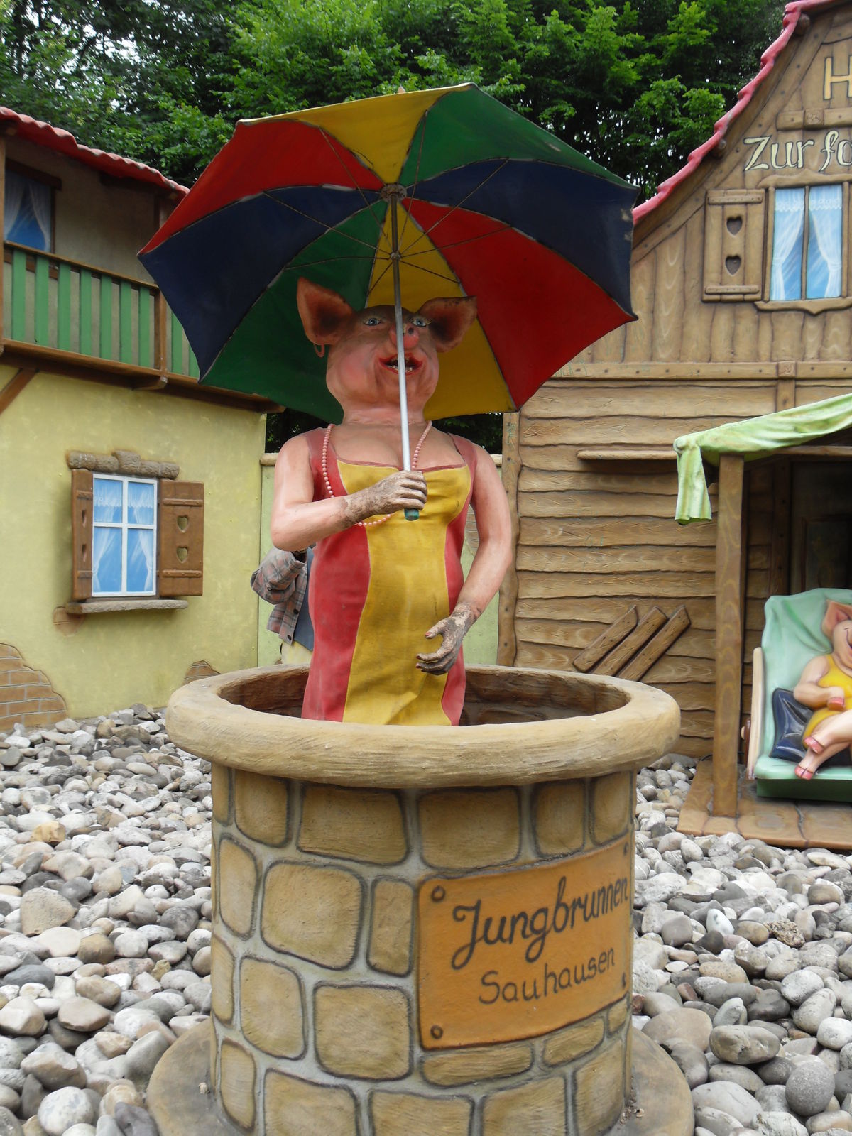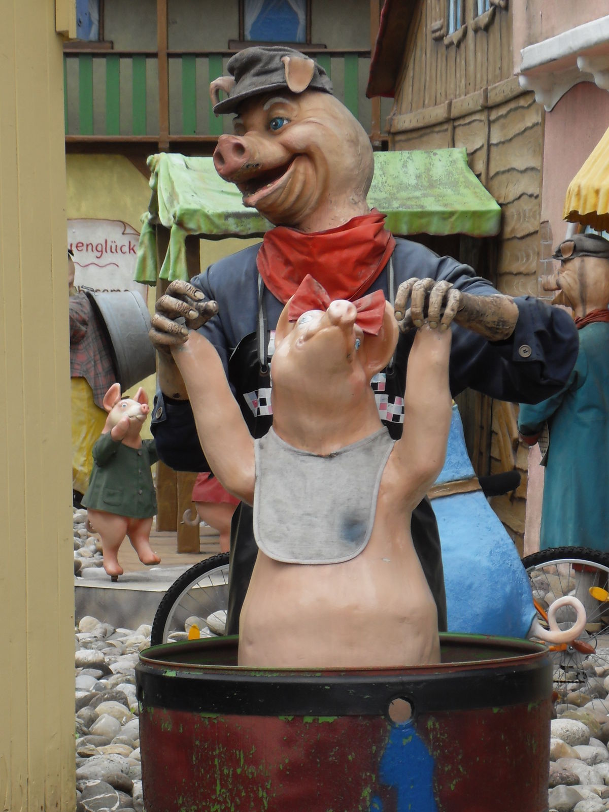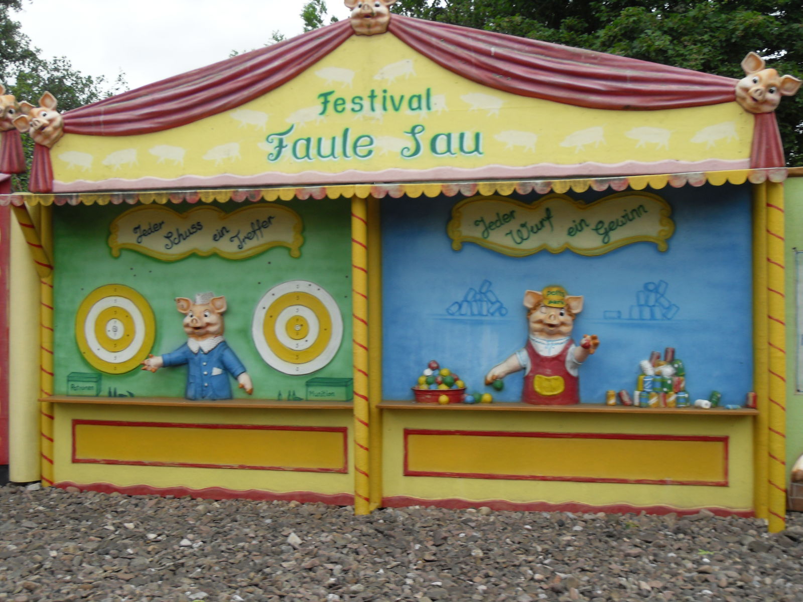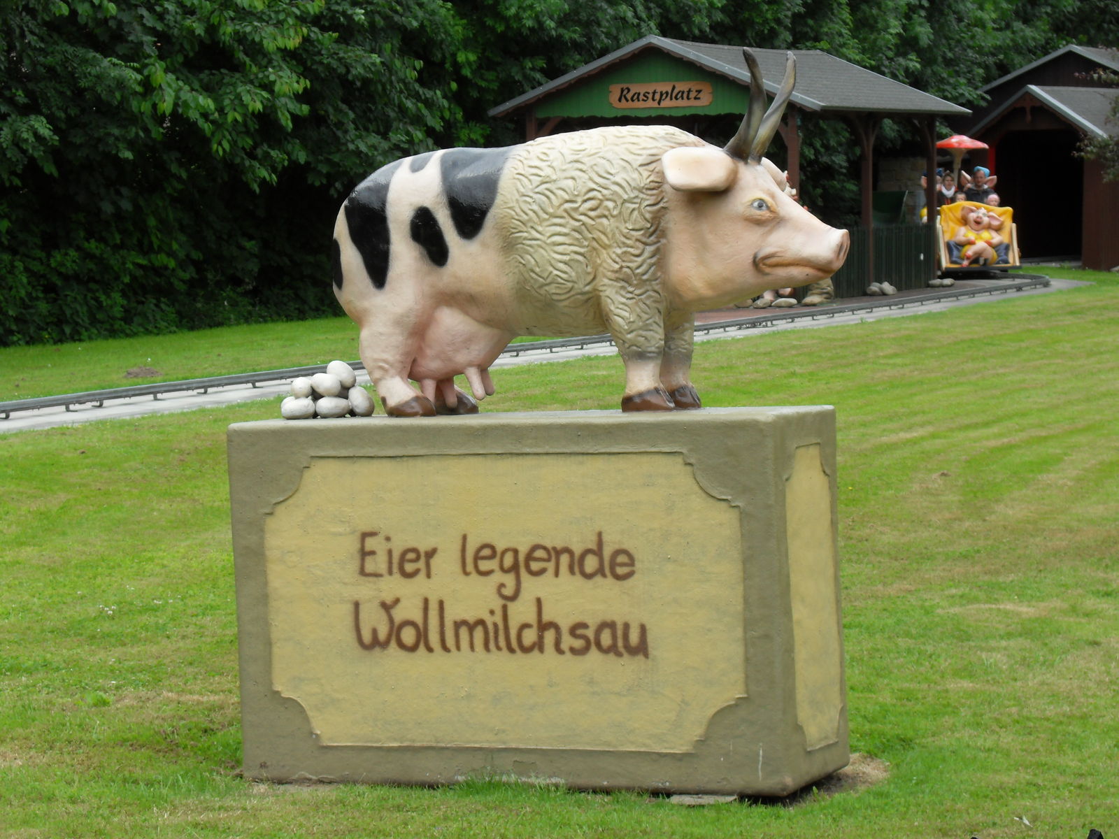Dann wurde es nicht nur schweinisch sondern richtig versaut. Als nächstes wartete die Outdoor Themfahrt "Faule Sau" auf uns. Nach einem lustigen Eingangsbereich geht es mit Schweinewagen durch ein Dorf voller Schweine und Säue, wo so richtig gefeiert, gefaulenzt und rumgesaut wird. Lustige Idee, die auch sehr gut umgesetzt wurde. Zwischendurch leider etwas Leerlauf, vor allen Dingen im Schlussbereich. Da hätte man noch mehr rausholen können. Aber im großen und ganzen eine lustige kleine Themenfahrt.