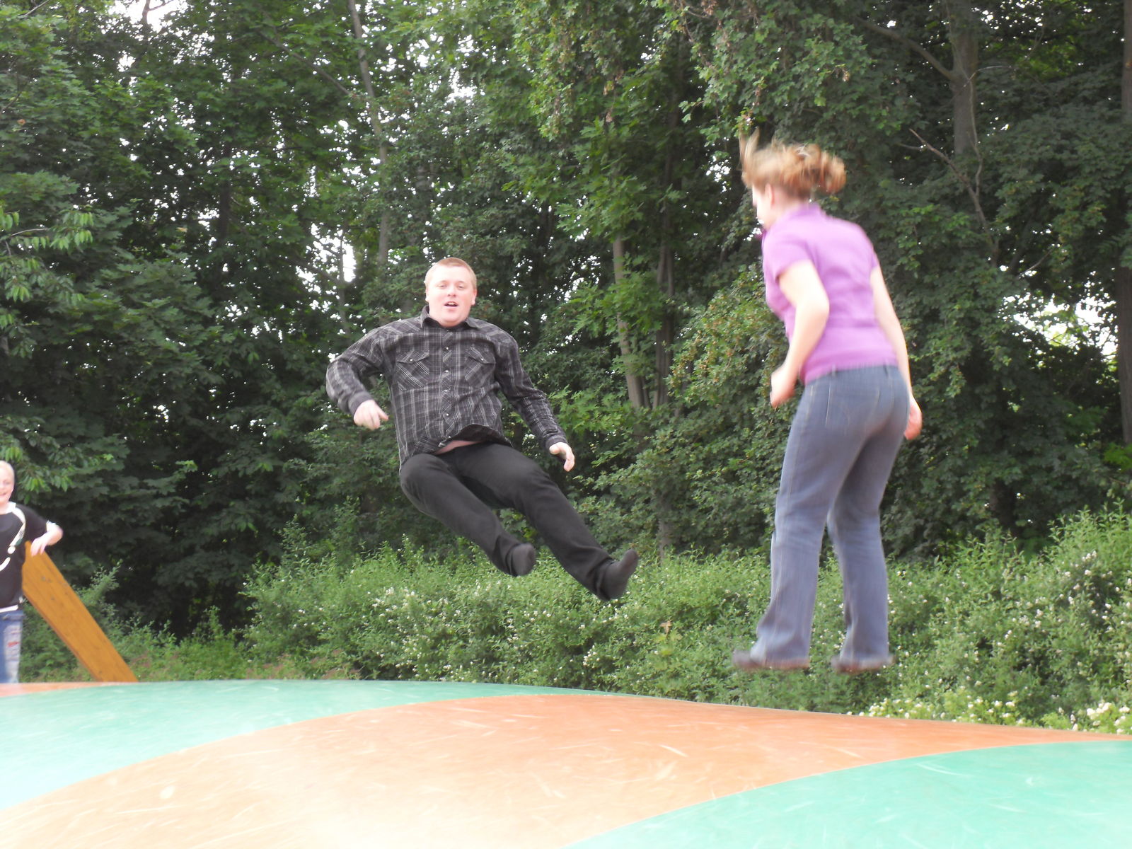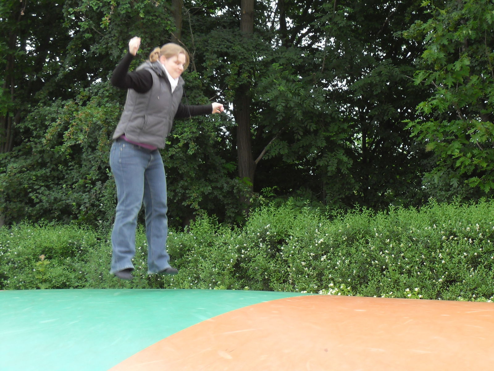 Nachdem wir uns auf dem Spielplatz ausgetobt hatten entdeckten wir gleich das nächste Objekt unserer Begierde, ein Riesenhüpfkissen. Der Zutritt für Kinder unter sechs Jahren war hier leider verboten, warum auch immer. In allen anderen Parks konnte die Kleine mithüpfen, hier musste sie leider draußen zugucken. So versuchten sich also die Erwachsenen in Saltos und Akrobatik und kamen dabei mächtig ins Schwitzen.