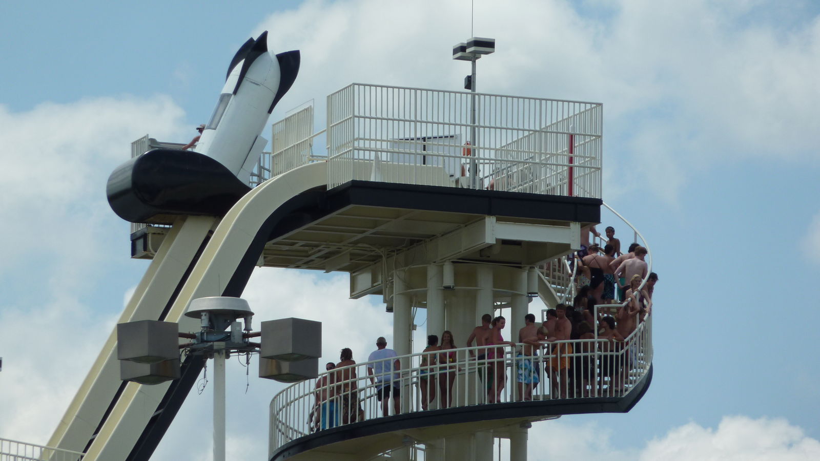 Und zwar The Bomb Bay, eine Speedrutsche mit Falltür, die aber nachträglich eingebaut wurde. Absolut von Vorteil, wenn man wie wir sowas vorher nicht weiß. Ich kann mich nicht erinnern vor der Fahrt auf einer neuen Achterbahn jemals nervöser gewesen zu sein wie vor dieser Rutsche. Der Moment wenn der Boden unter einem wegklappt und der Fall in die Tiefe ist wie erwartet genial, das wirklich üble ist das Auslaufbecken, wo man alles andere als sanft auf das Wasser aufschlägt. Die Schmerzen sind es aber wert. Ein Problem ist jedoch die Abfertigung. Es gibt für Bomb Bay und Stuka, die andere Speerutsche daneben, nur einen Operator der die ganze Zeit damit beschäftigt ist die Falltür zu bedienen, weshalb Stuka praktisch geschlossen ist.