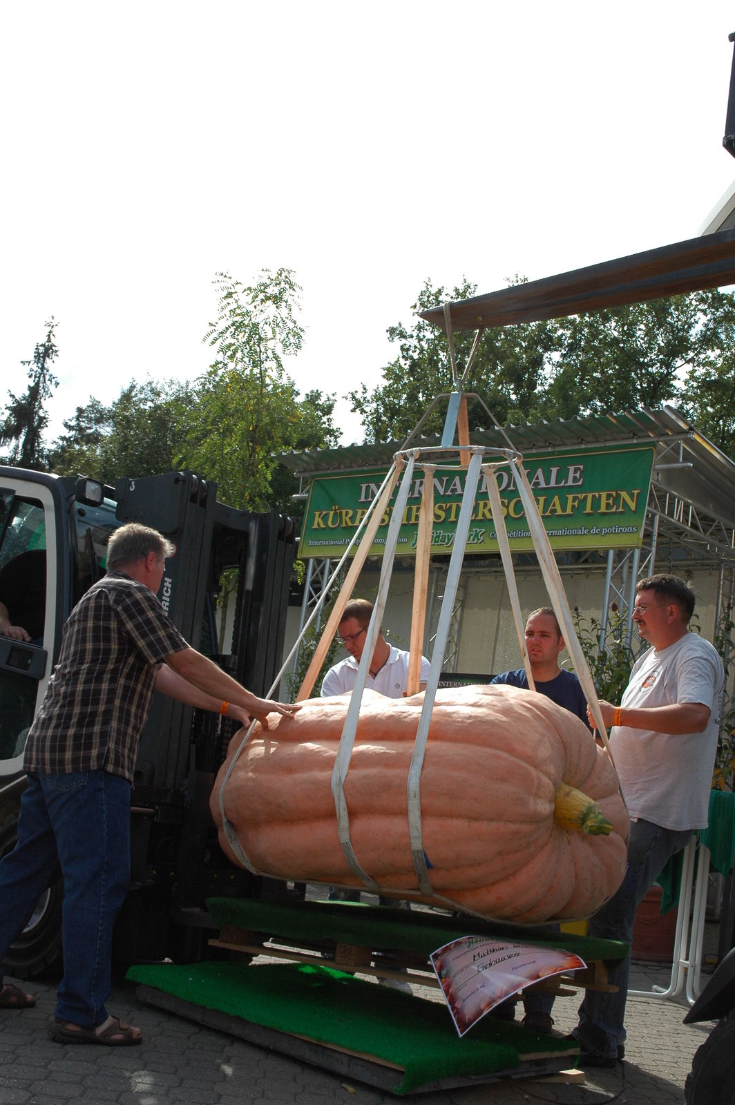 Damit brachten die Meisterschaften für Jury, Teilnehmer und Publikum überraschend hohe Ergebnisse auf die Waage. Jurymitglied Reinhold Löffler: „Dieses Jahr hat den Kürbiszüchtern das Wetter übel mitgespielt. Hagel, extreme Hitze, Dauerregen haben den Traum vom Sieg und so manchen Riesenkürbis sprichwörtlich platzen lassen.“ Die optischen Ähnlichkeiten von fünf der 23 teilnehmenden Kürbisse machten die Wiegemeisterschaften zu einem spannenden Kampf mit der Waage. Nach dem Motto „Der Kürbis fällt nicht weit vom Stamm“ sorgten Vater Josef und Sohn Matthias Würsching für eine echte Überraschung: Beide Züchter aus Hessen hatten nicht mit der Top-Platzierung gerechnet. Für die sächsischen Champions „Heavy East“ war der hohe Sieg eine verdiente Belohnung für die „Strapazen“ ihrer Anreise: Bereits nachts um 2:30 Uhr startete ihr gewichtiger Kürbis-Transport in die Pfalz.