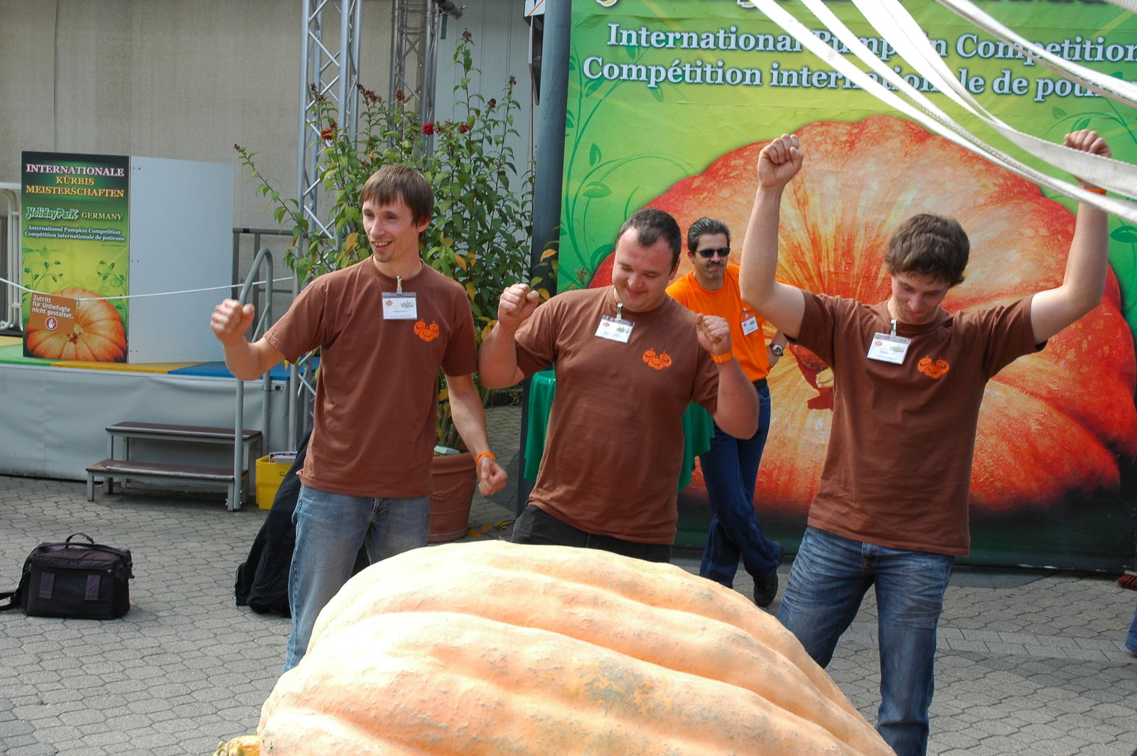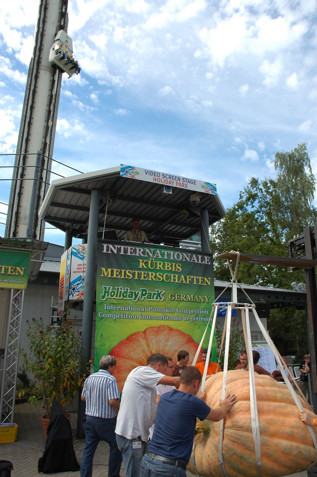 Hassloch, 12. September 2010 – Ein Züchter-Team aus der östlichsten Stadt Deutschlands und ein erfolgreiches Vater-Sohn-Duo haben die heutigen „2. Internationalen Meisterschaften im Kürbiswiegen“ im Holiday Park geprägt. Den Kürbisthron bestieg die Züchtergruppe „Heavy East“ (Andreas Baumert, Martin Baumert, Martin Teichert) aus dem sächsischen Görlitz mit einem 528,9 kg schweren Giganten – ein Preisgeld von 3.200 Euro war der Lohn für die monatelange Pflege. Knapp dahinter folgte mit einem 509,8 kg schweren Prachtexemplar Matthias Würsching aus Einhausen in Hessen, der sich über 1.200 Euro freuen durfte. Dessen Vater Josef Würsching erreichte mit 469,3 kg einen stolzen dritten Platz, für den er einen Scheck über 800 Euro entgegen nehmen konnte.