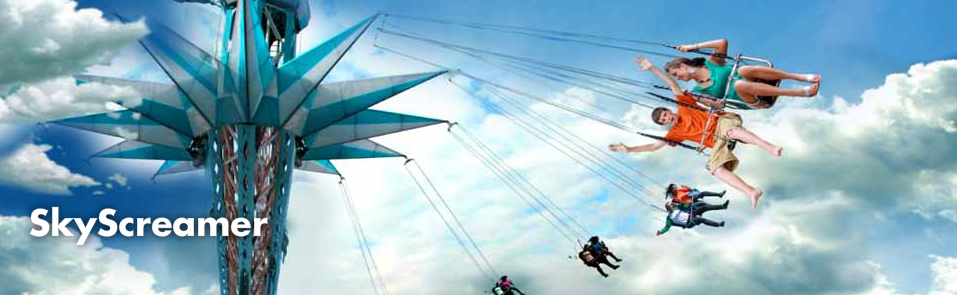 Towering at 236 feet above the ground, SkyScreamer will be the tallest ride in the park, located near the Screamin' Eagle. Grab a friend and sit two across in an open air swing as you climb to the top of SkyScreamer tower while spinning round and round. At full swing, you'll soar in a 98-foot circle at speeds over 43 mph. By day, you'll have a bird's eye view for miles away. By night, SkyScreamer will light up the night as its lighted arms whirl high above the park.