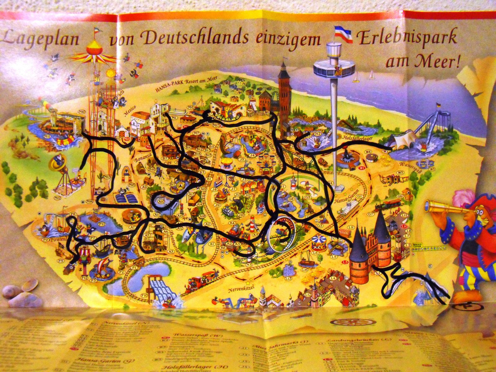 Vorteil vom Hansa-Park 1: Alle Attraktionen liegen schön dicht beieinander, die Fahrgeschäfte können ohne große Wanderungen problemlos erreicht werden