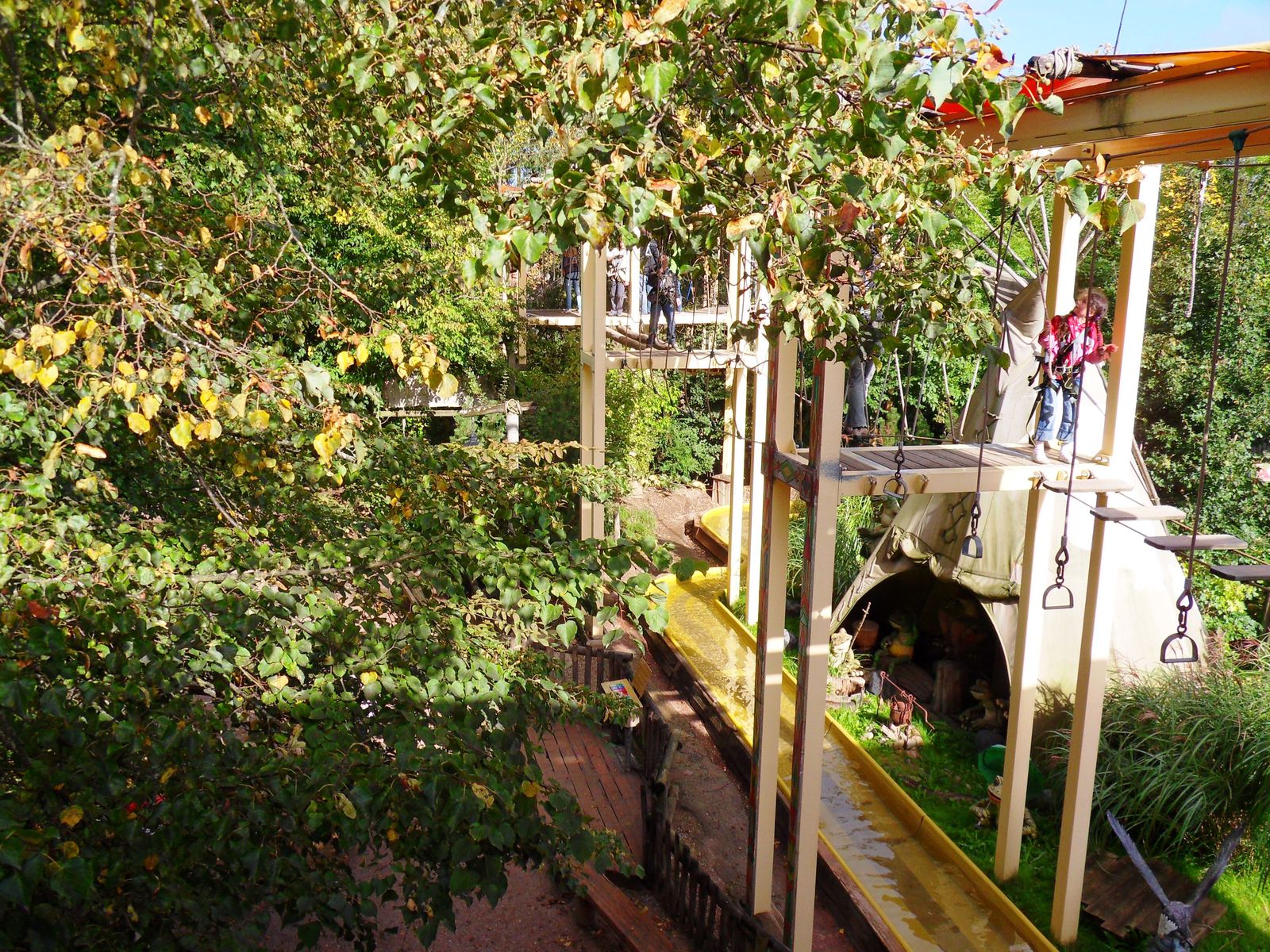 Am anderen Ende der Westernstadt. Den Hochseilgarten Navajo Trail habe ich zuletzt vor etwa 2 Jahren erklettert. Da die Warteschlange nur aus uns drei und etwa vier anderen Leuten besteht, wagen wir einen Abstecher in die Bäume.
