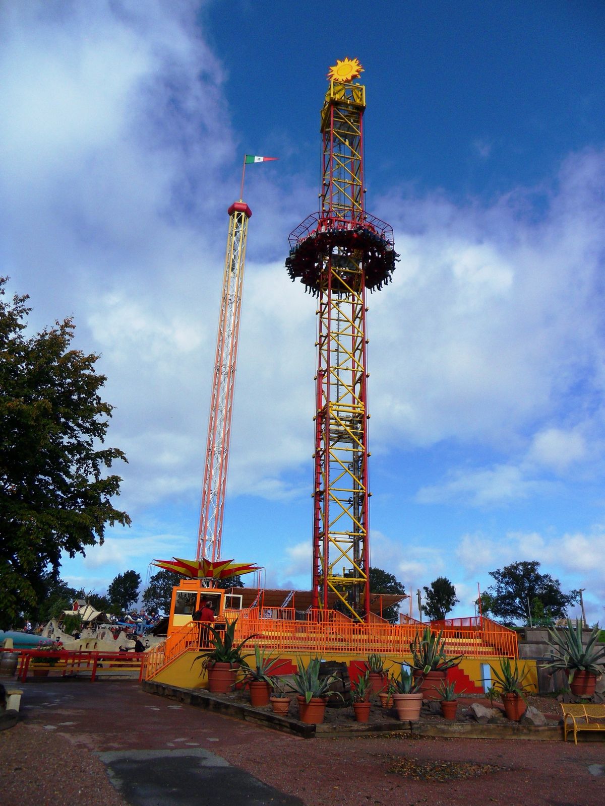 Wenige Schritte weiter steht der Power-Toweer Montezuma. Die ganze Attraktion sieht etwas provisorisch aus, ist der Turm doch eine mobile Anlage, die jederzeit abgebaut werden kann. Auch, dass die Wege nur notdürftig unter Steinen versteckt sind, deuten auf ein Dauerprovisorium seit mittlerweile zehn Jahren hin.
