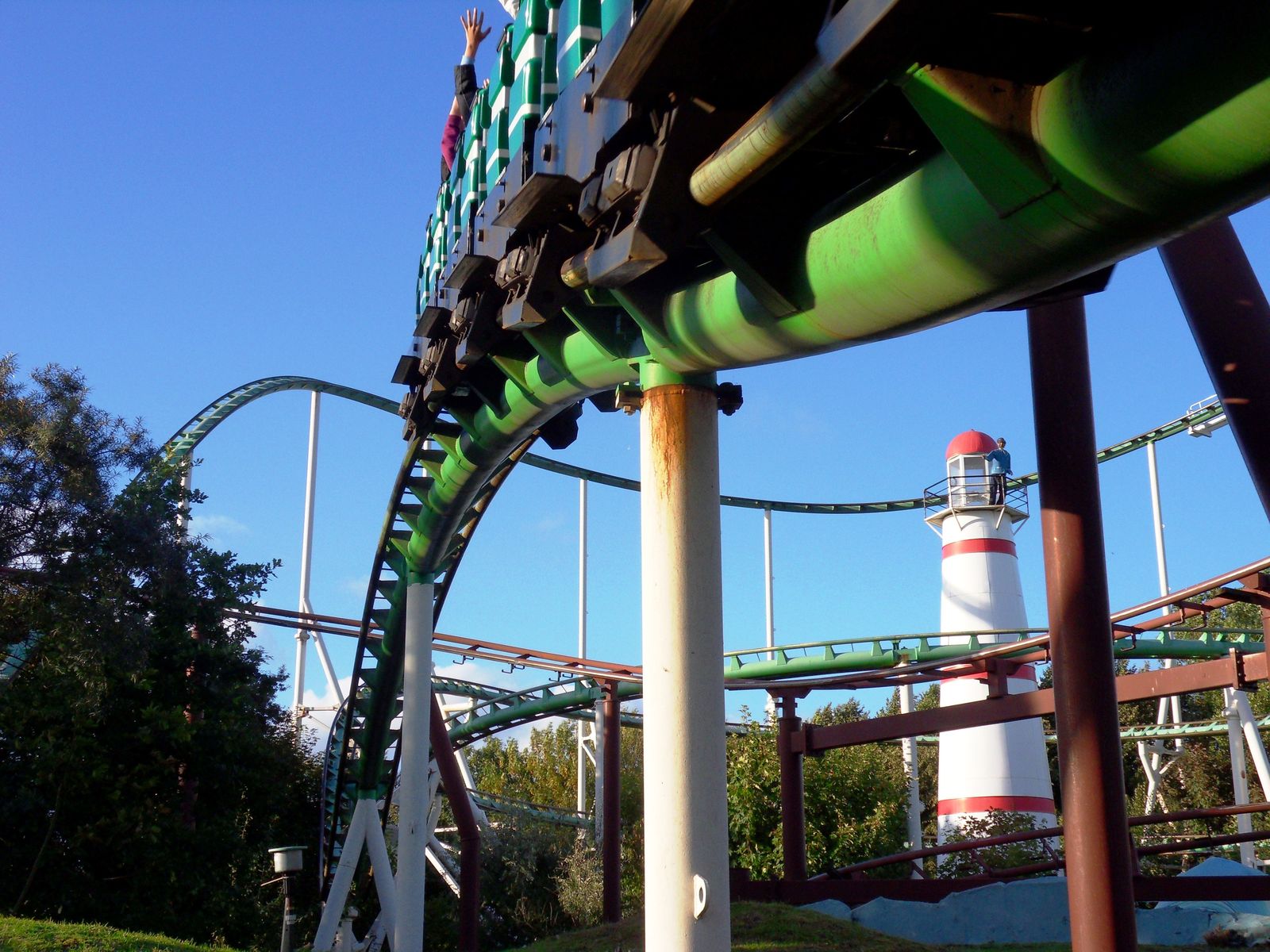So, Runde geschafft. Wir haben jetzt einmal den Park mehr oder weniger von außen umrundet. Es ist jetzt etwa 15:30, Zeit die Erlebnisse zu vertiefen. Wenn man sowieso schon mal in der Ecke ist, gleich zum Fluch. Wartezeit ist konstant geblieben, die Angst meiner Klassenkameradin auch. Aber vielleicht kann ich die 25 Minuten einfach als „praktische Psychologieerfahrung“ im Lebenslauf notieren. War ja scheinbar wirkungsvoll, anschließend sind wir direkt noch mal gefahren, sodass wir etwa 17:00 Uhr wieder auf dem Plaza del Mar stehen.