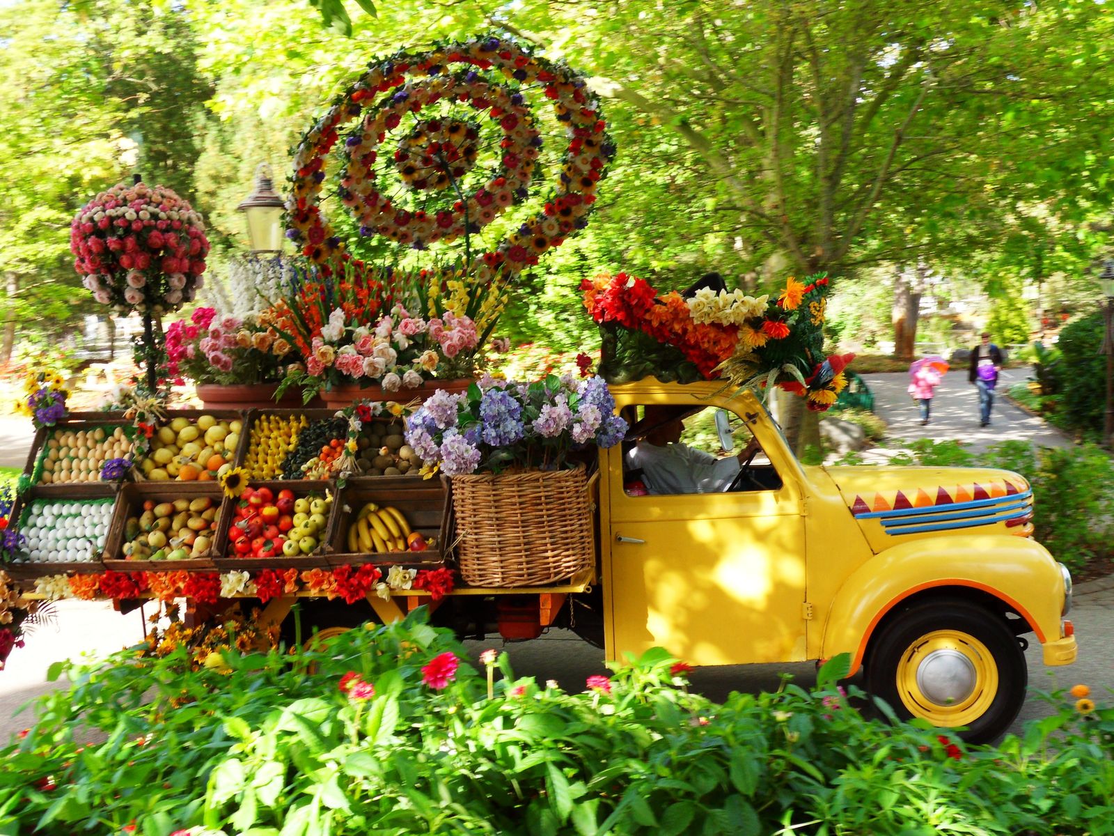 Der scheinbar kilometerlange Zug mit Autos, Kutsche und fahrenden Baumhaus zieht einmal durch den Park.