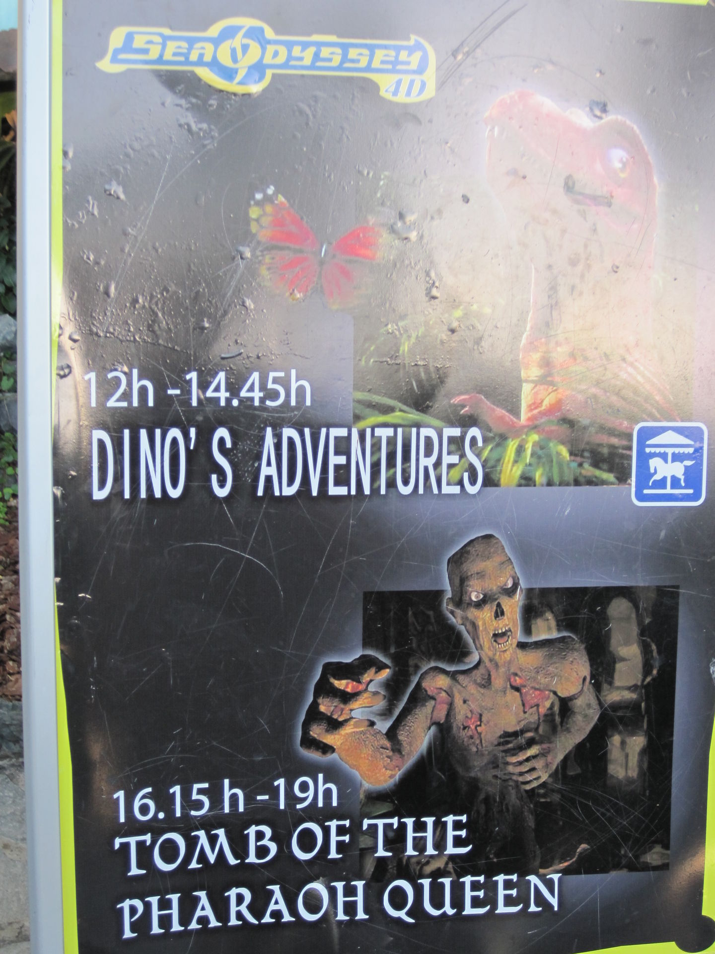 Jetzt bekommt man einen 4D-Film gezeigt, der mit seinen ständig wechselnden Perspektiven überhaupt nicht für einen Simulator geeignet ist. Ich habe nur den Dino-Vormittags-Film gesehen (dank technischer Störungen, die in den zwei Tagen häufiger vorkamen, mit deutlicher Wartezeit). Nachmittags wird ein anderer Film gezeigt, der wohl einen Tick besser sein soll.