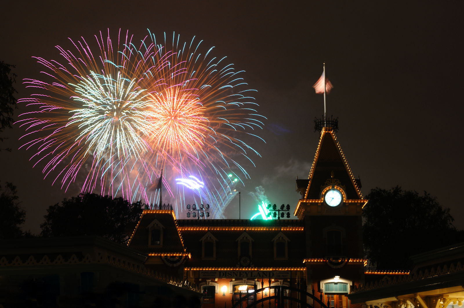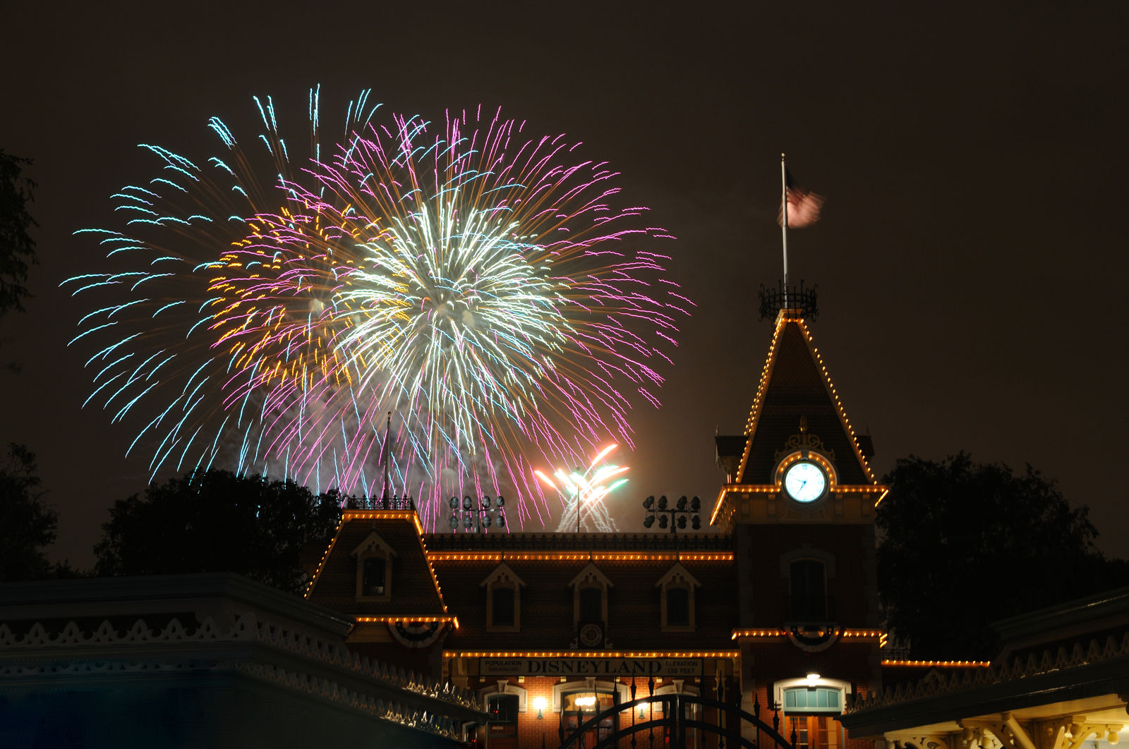An einigen Tagen in der Woche lässt es Disney mit dem Feuerwerk "Magical" im Disneyland so richtig krachen. Da wir am Labour Day erst relativ spät in Anaheim angekommen waren und es rappelvoll war, haben wir uns das Feuerwerk von der Plaza zwischen den beiden Parks aus angesehen. Zum Gucken ist dieser Platz zwar suboptimal, da die Musik fehlt, zum Fotografieren aber gar nicht schlecht, da man die Disneyland Eisenbahnstation im Vordergrund hat, in meinen Augen fast schöner als das kalifornische Winz-Schloss.
