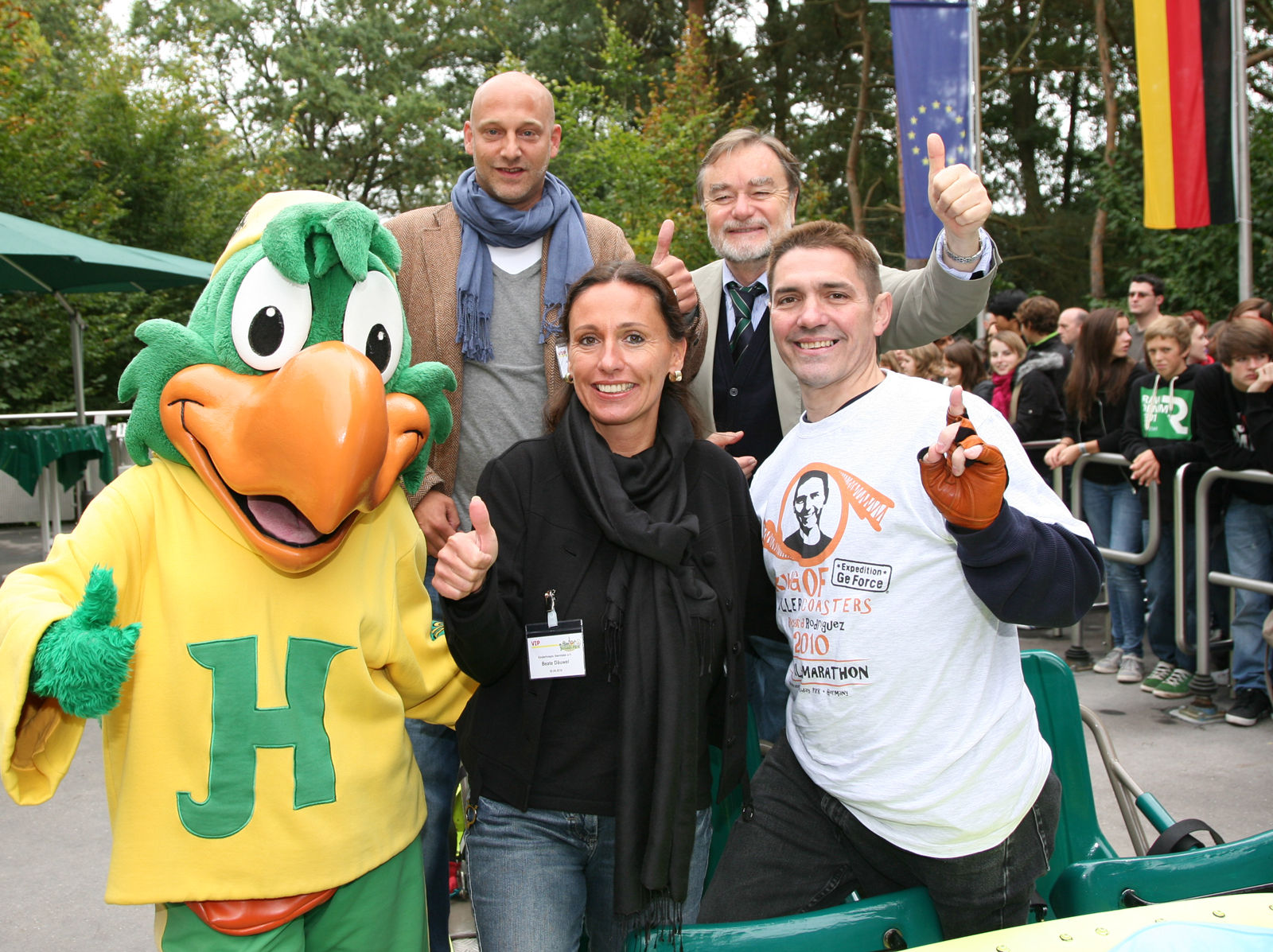 Gemeinsamer Start des Spendenmarathons auf "Expedition GeForce": Tobias Fouquet und Beate Däuwel von "Sterntaler", Parkdirektor Wolfgang Schneider und Richard Rodriguez , der "King of Rollercoasters".