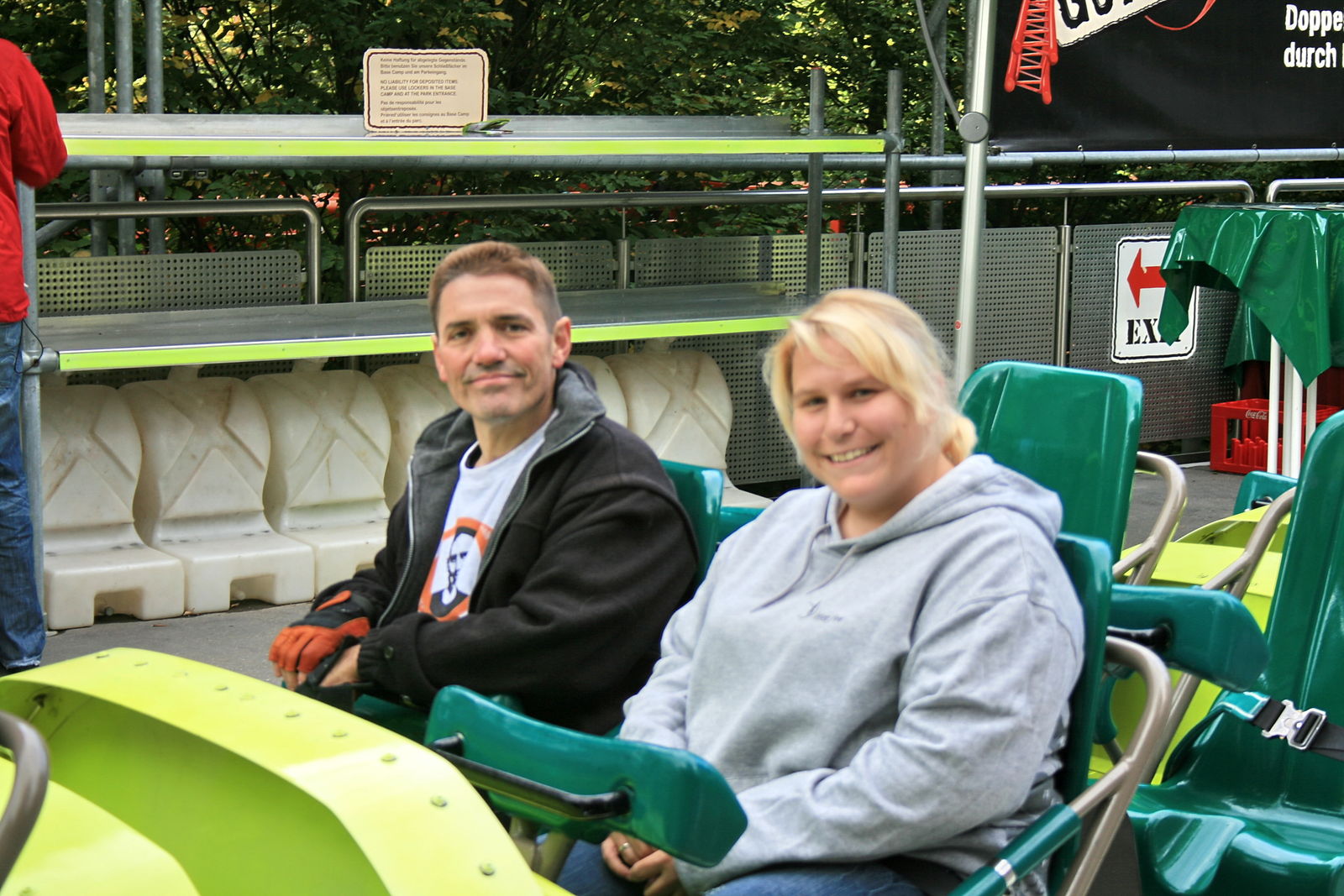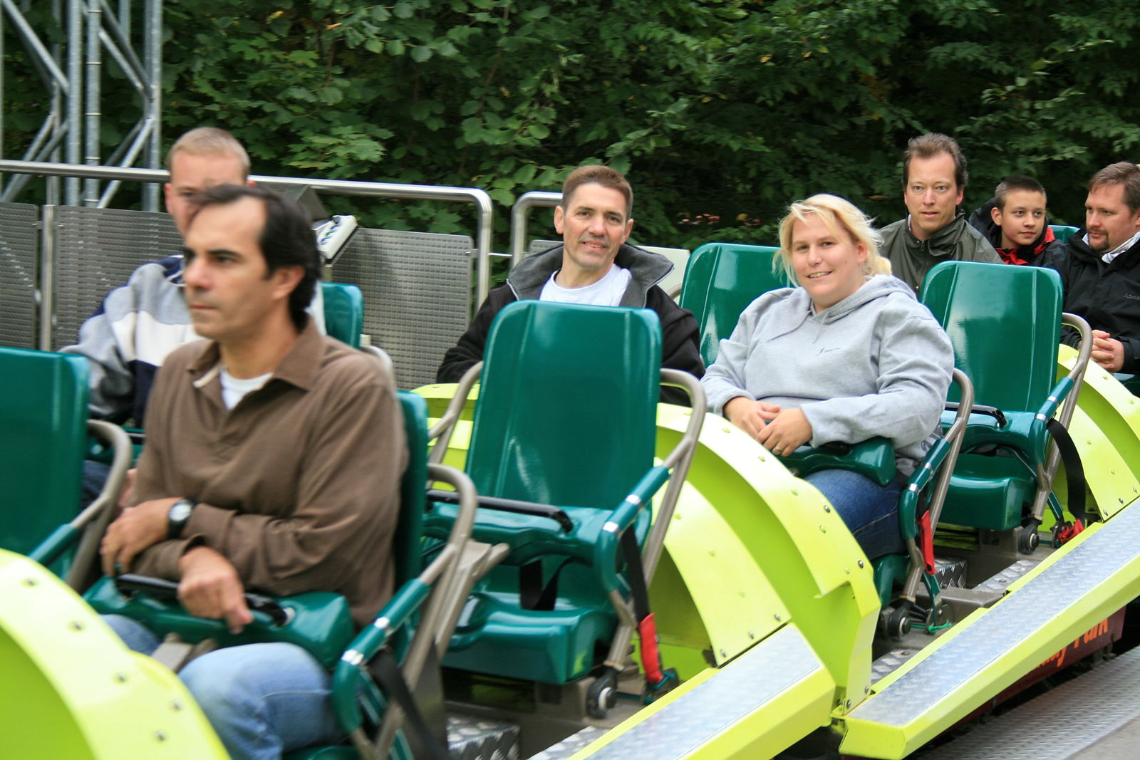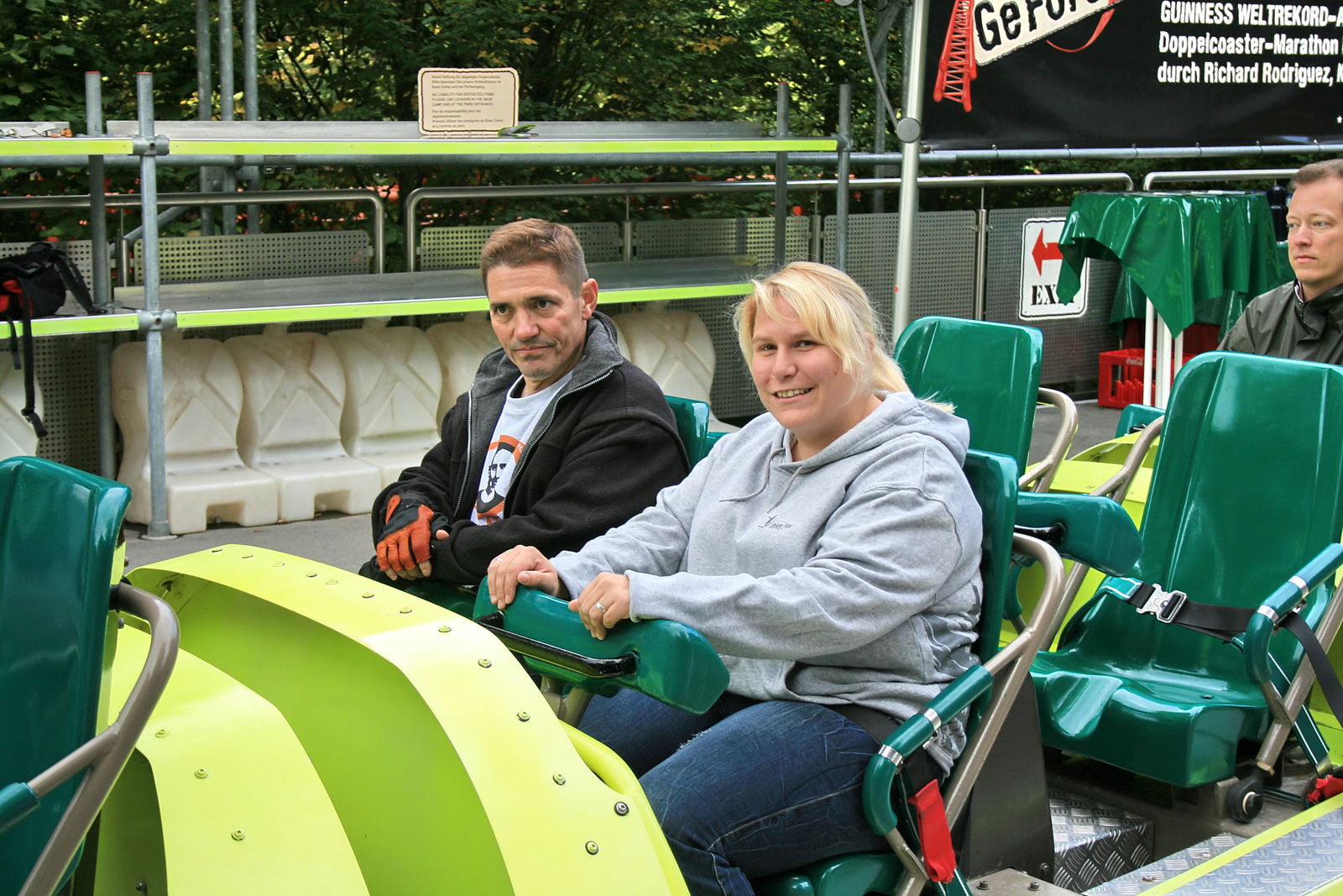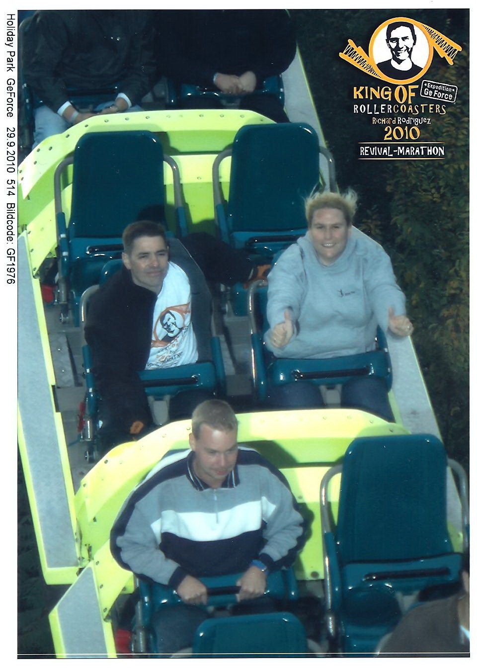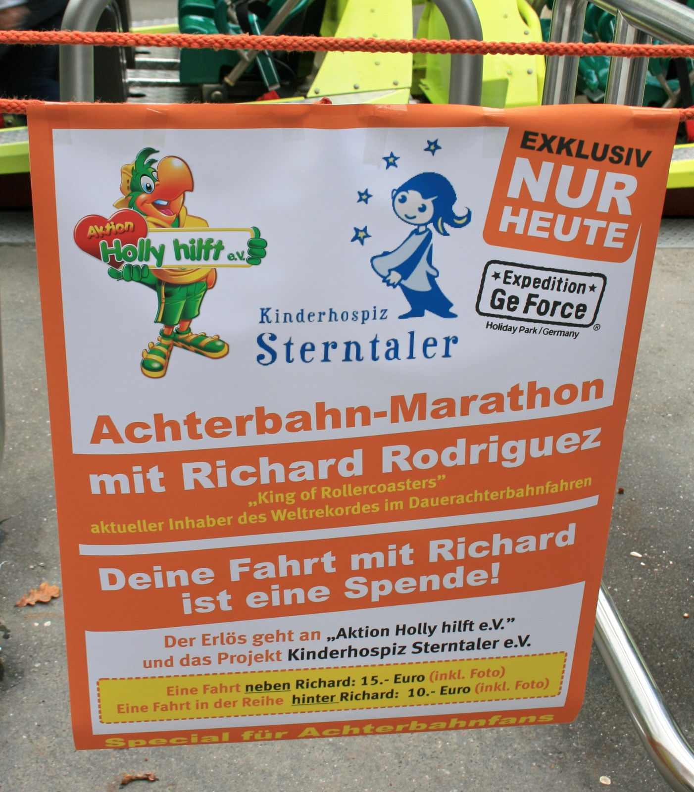 Am Mittwoch Abend schaute ich noch schnell beim Holiday Park vorbei. Denn an diesem Tag hieß es: Der Weltrekordhalter im "Dauerachterbahnfahren" Richard Rodriguez sammelt zugunsten der "Aktion Holly hilft e. V." für das Kinderhospiz Sterntaler e.V.. Ich tat dann auch was gutes und spendete 15€, dafür bekam ich dann eine Fahrt neben Richard Rodriguez. Er ist ein sehr Freundlicher, netter Mann und unterhält sich ausschließlich über Acherbahnen und Freizeitparks. Als er dann noch meinen Sohn enteckte, merkte man ihm sehr schnell an das er sein Herz am rechten fleck hat. Er ist sehr sehr Kinderlieb, drum nahm ich ihm diese Spendenaktion auch wirklich ab.