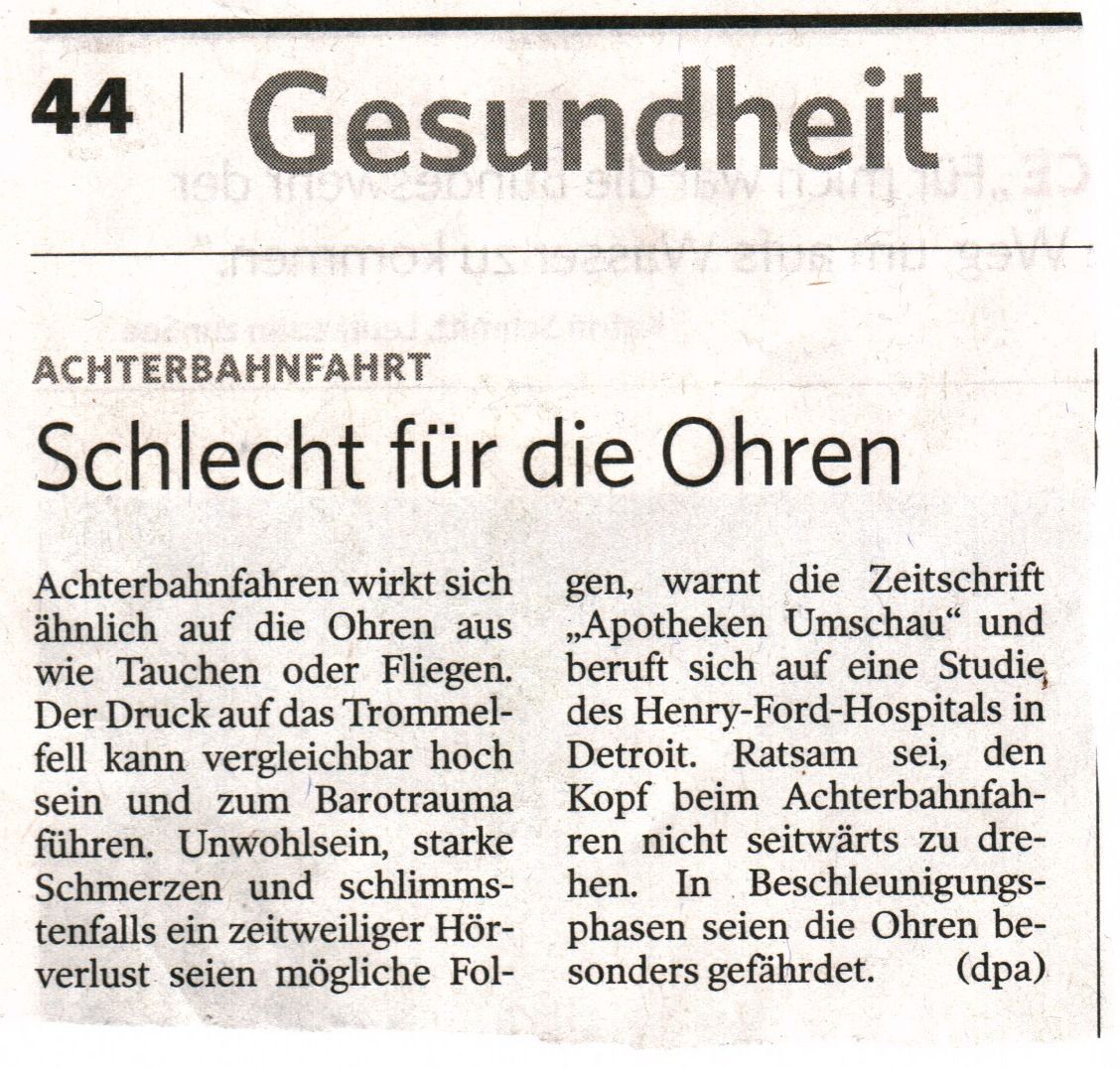 Das mit den Ohren kann ich nur zu gut bestätigen. Lag drei Tage im Krankenhaus, da ich beim "FLASH" eine Überkopffahrt durch die Station mitmachen durfte. Ergebnis war ein Ausfall des Gleichgewichtorgans. S
