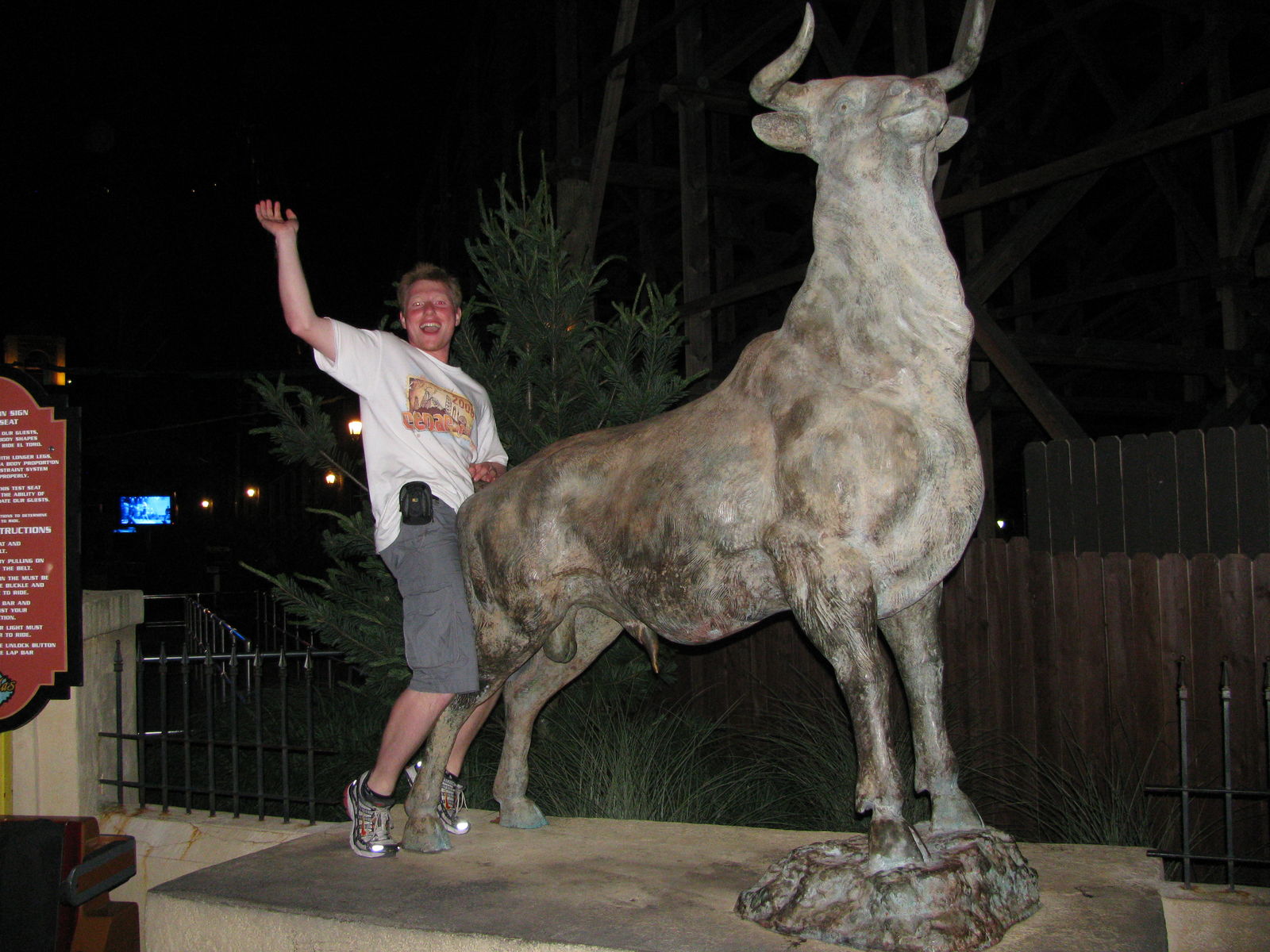 Kingda Ka lief überraschenderweise trotzdem auf voller Kapazität mit Doppelladestation. Das bedeutete auch, dass die Züge nie ganz gefüllt werden konnten. Da aber nur voll besetzte Züge gelaunched werden durften, wurden sie entweder mit Ride Ops aufgefüllt oder man durfte einfach sitzenbleiben. Da muss man sich dann schonmal kneifen und vor Augen führen, dass man sich hier in einem Six Flags Park befindet. Okay, es ist ja auch der Six Flags Park. Da Kingda Ka allerdings nur die freiheitsberaubende Version von Top Thrill Dragster ist und man für den 200km/h-in-your-face-Sitz in der Front Row dann doch die ein oder andere Fahrt warten musste, konzentrierten wir uns den Rest des Tages aufs Bullriding und darauf herauszufinden, wie lange es dauern würde bis uns der Stier schließlich abwirft. Nach 39 Runden hat er es geschafft. Gegen Ende des Tages war El Toro fest in deutscher Hand, denn wir trafen auf weitere Onrider (die hier gerne auch ihre Bilder posten können) mit denen wir die Nachtfahrten auf der für mich weiterhin besten Achterbahn der Welt absolvierten. Die Nummer 1 ist El Toro nun mehr denn je, denn mit jedem Besuch seit 2007 und jeder weiteren Fahrt wird der Abstand zu Platz 2 größer und größer. Auch wenn die Liftgeschwindigkeit mittlerweile verlangsamt wurde, hat der First Drop in der letzten Reihe einen einzigartigen Sog. Ejector Airtime ist ja schon selbstverständlich, für den schwerelosen Zustand auf dem Camelback vor dem getwisteten Part muss allerdings noch eine passende Bezeichnung gefunden werden. Exstacy Airtime vielleicht.