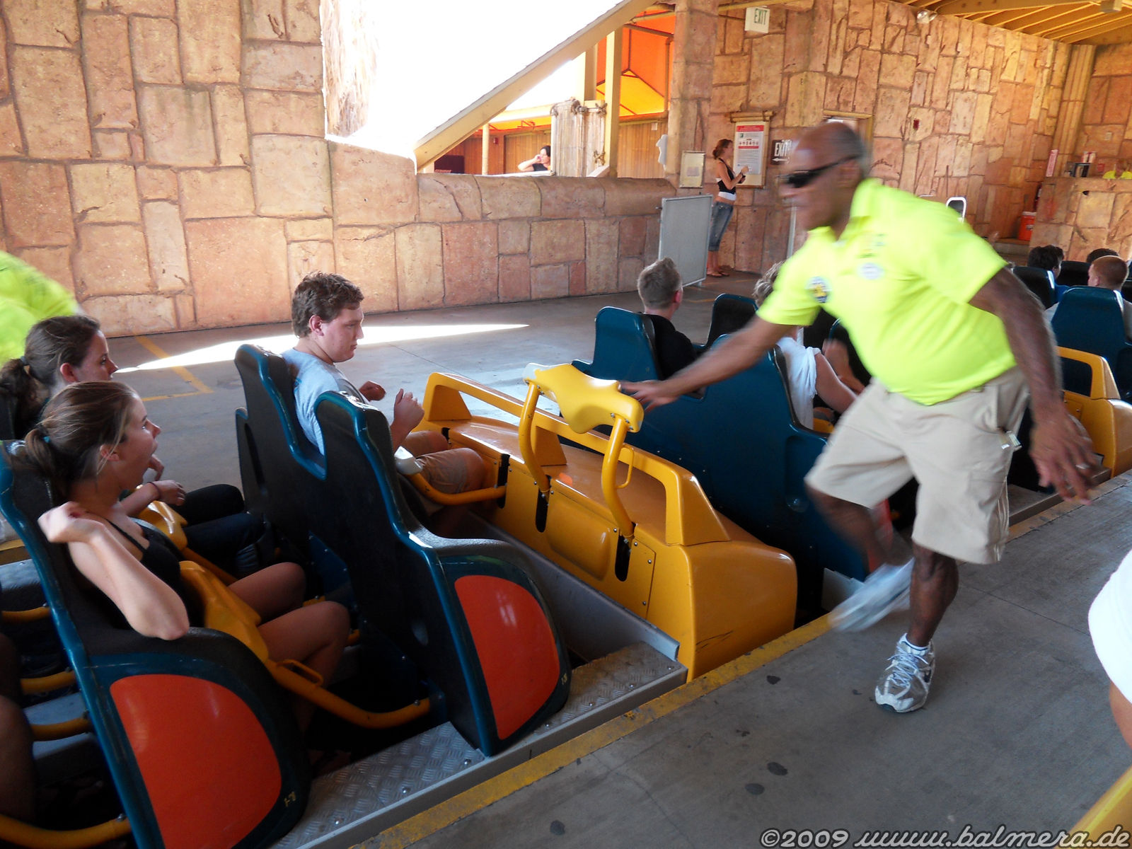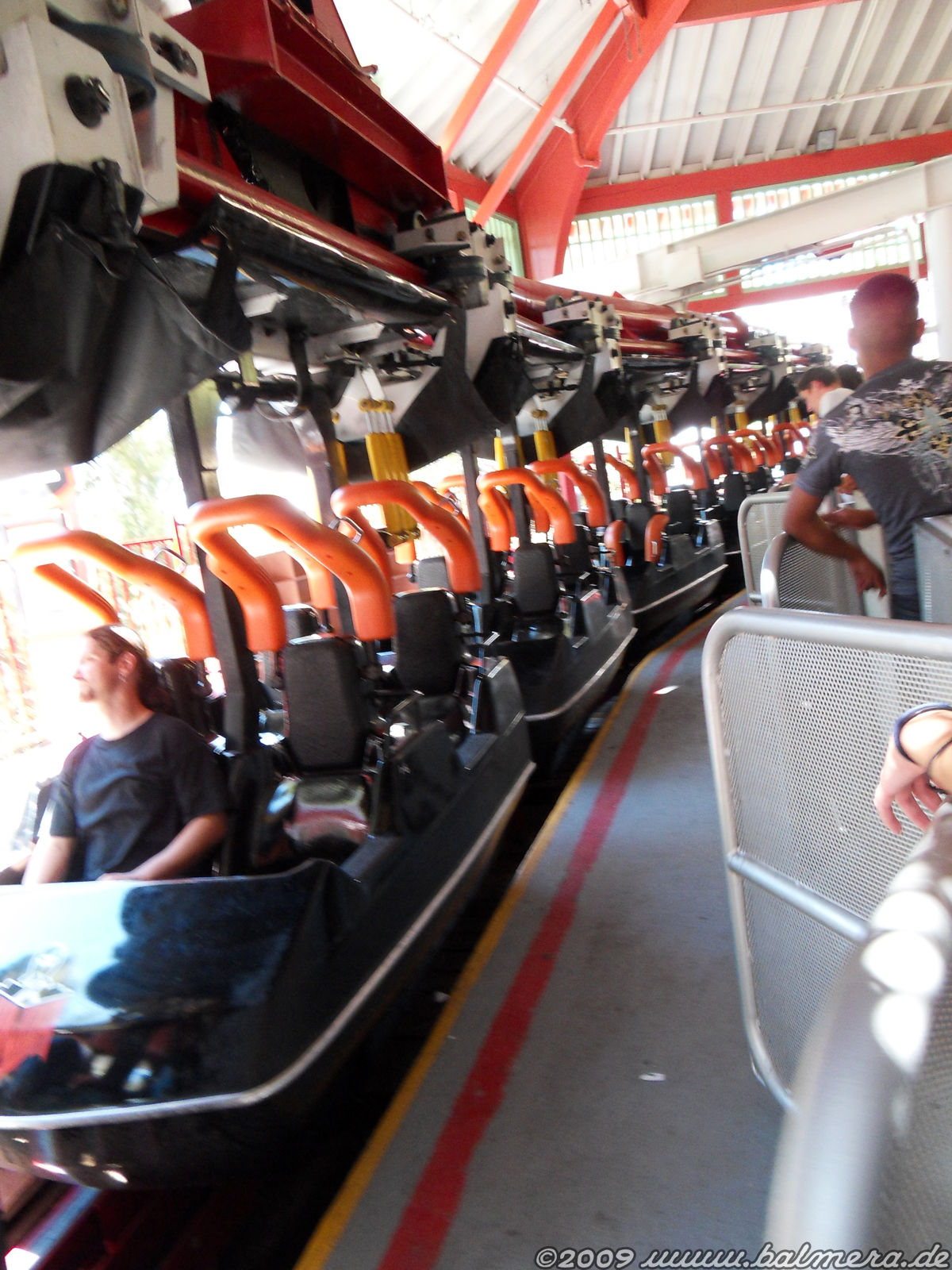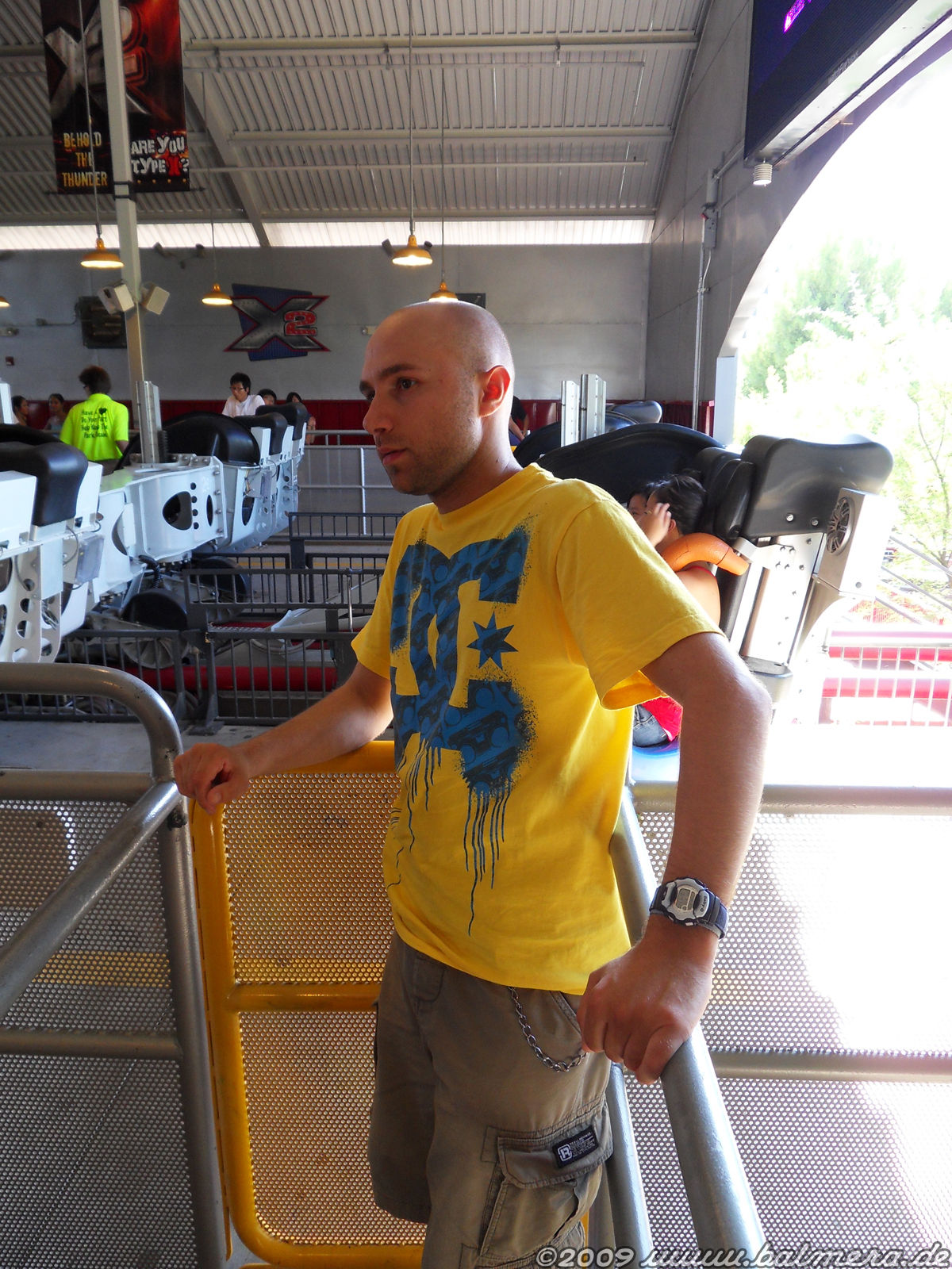 Am zweiten Besuchstag gab es eine geniale Aktion von Del Taco, die wir nur rein zufällig über Lautsprecherdurchsagen mitbekamen: Eine Stunde ERT auf X² für lau. Ganz Exklusiv nach Parkschliessung. Man musste sich lediglich im Cybercafe für einen eMail-Newsletter registrieren, worauf man anschliessend mit einem Wristband ausgestattet wurde. Und es hat sich gelohnt. Ich schätze wir waren auf zwei Zügen verteilt gerade mal mit 50 Leuten Nutzer dieses tollen Angebotes. Anscheinend hat das einfach niemand mitbekommen. Auf jeden Fall eine sehr feine Aktion von SF und Del Taco. Und überhaupt: Ich weiss gar nicht, was ich in den letzten Jahren zum Thema Six Flags und Maintenance alles gehört und gelesen habe. Kann ich nichts von bestätigen. Im Prinzip lief eigentlich alles, das im Mehrzugbetrieb und mit recht fixen Abfertigungen. (Gleicher Zufriedenheitsfaktor wie nach