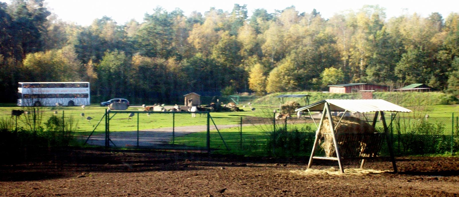 Busse und Autos fahren im Schritttempo durch die Gehege