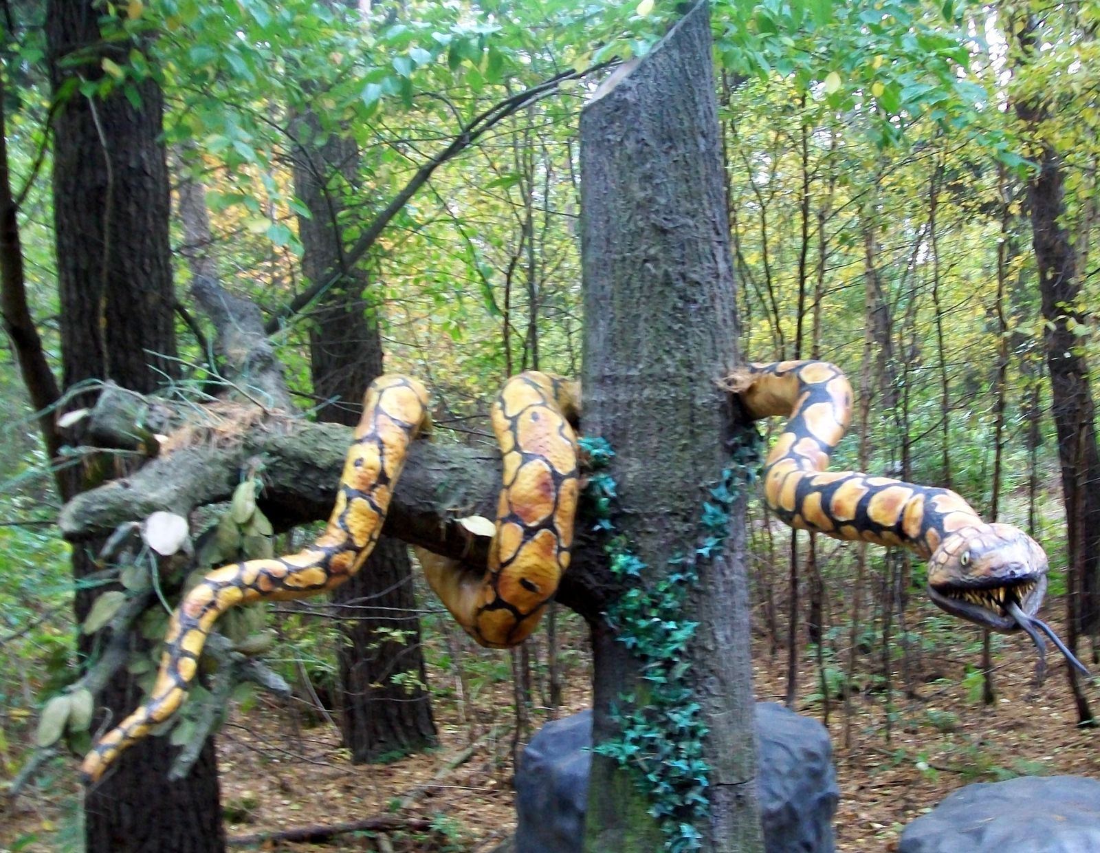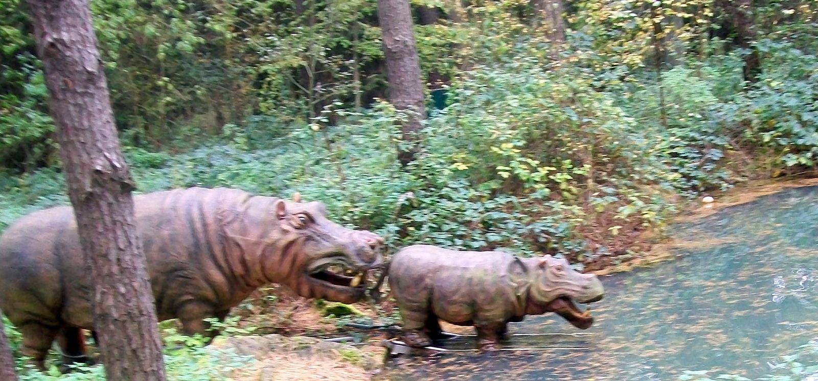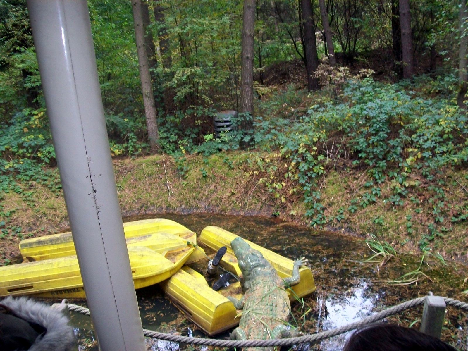Die Dschungelsafari führt zuerst durch eines der Gehege und dann in den, mit vielen Effekten versehenen Wald, in dem es unter anderem über wackelnde Brücken und durch Sumpflöcher geht.