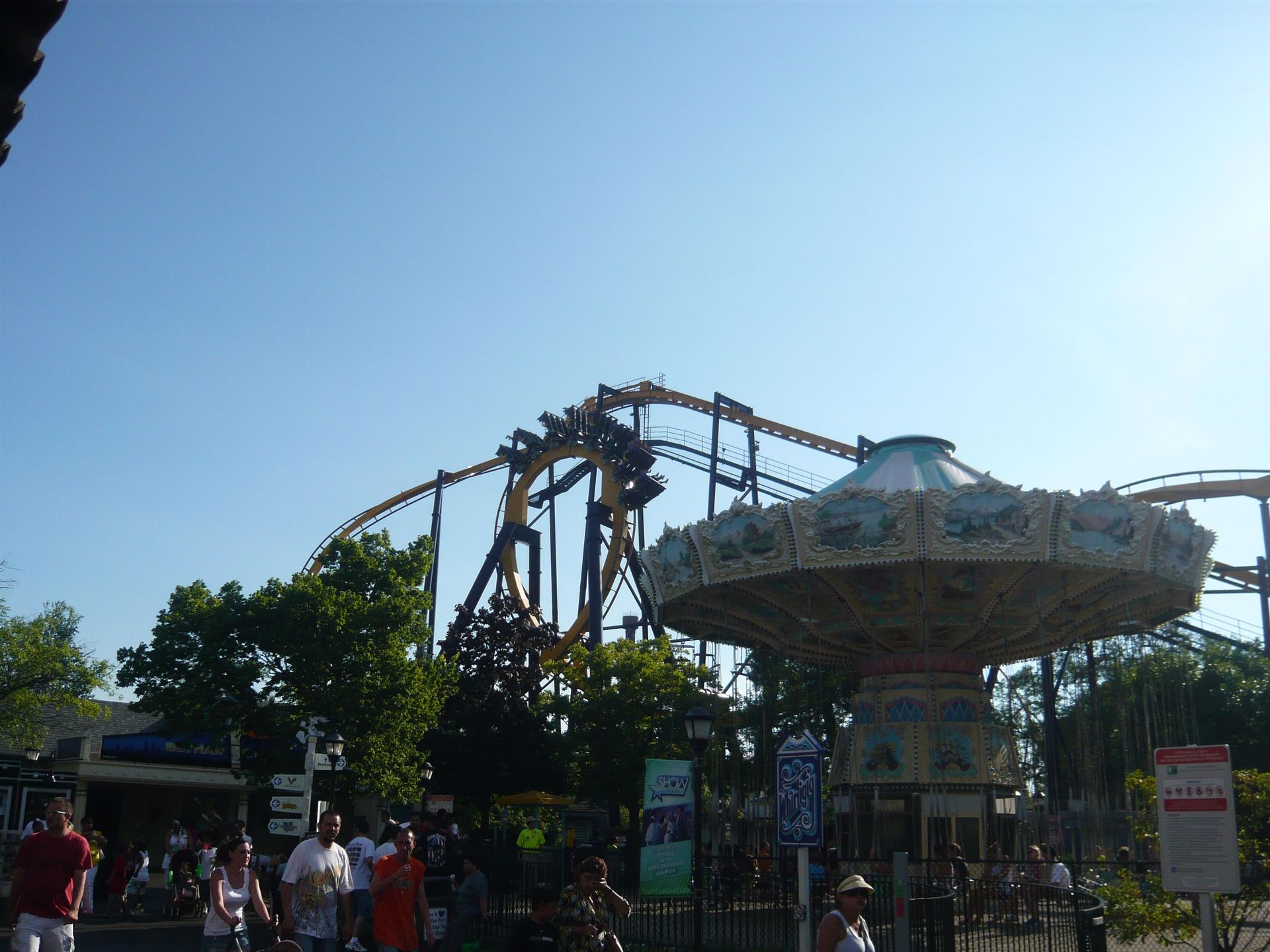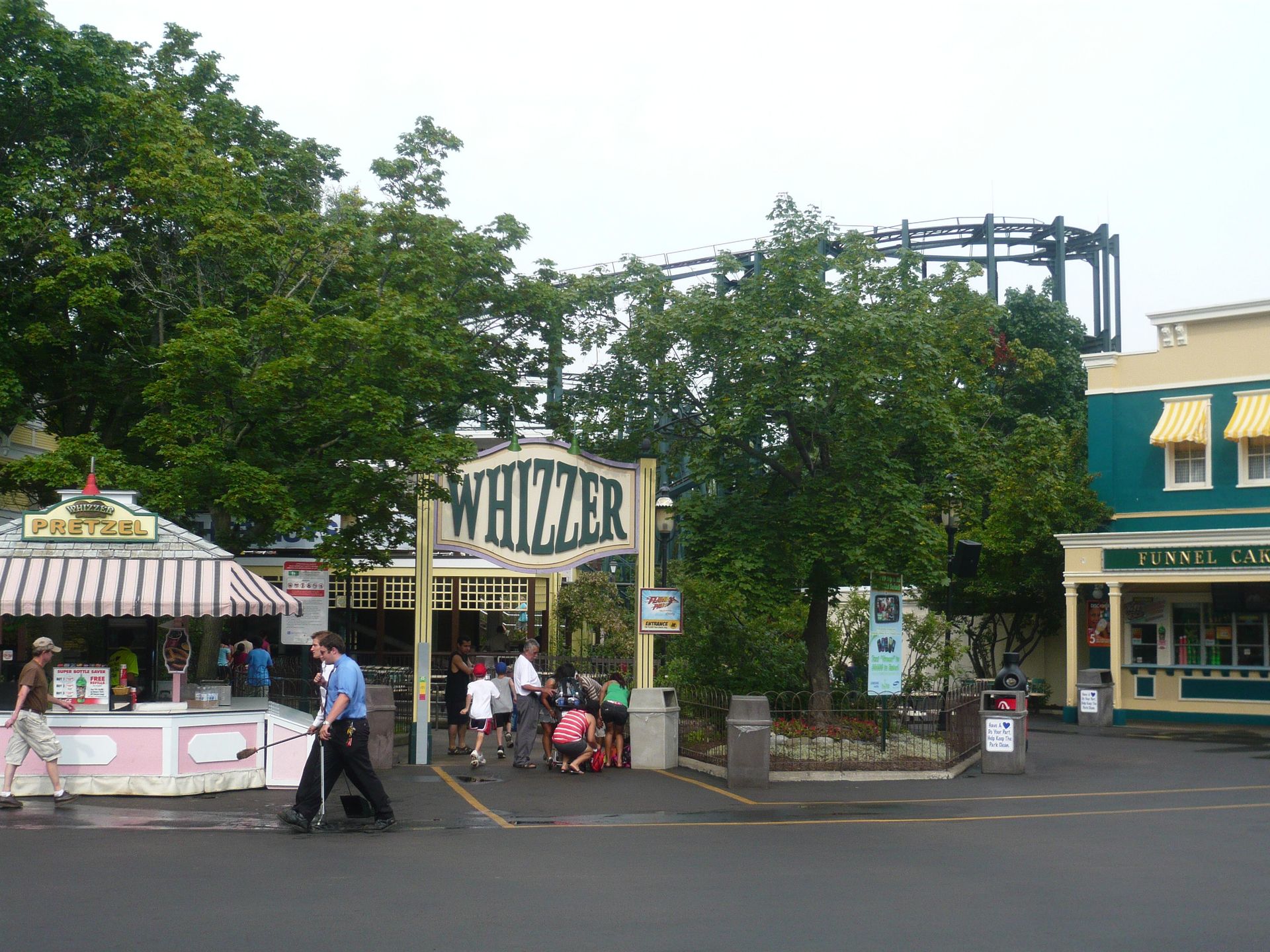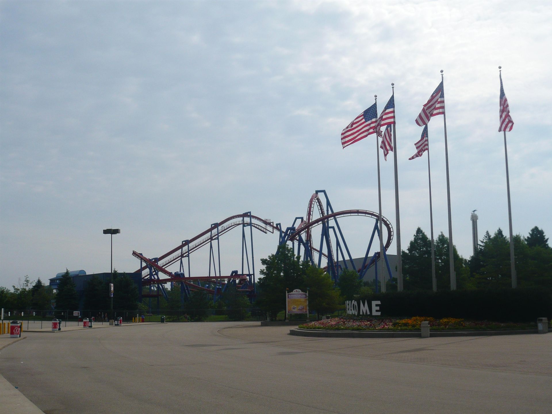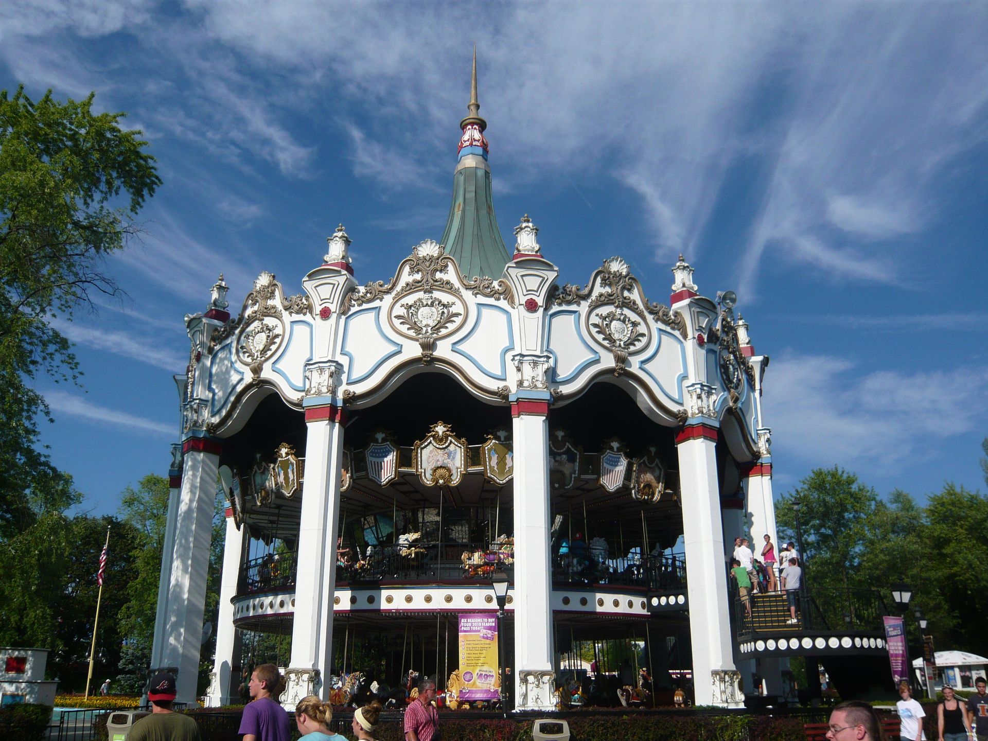 Am Eingang begrüsst das schöne Doppelstock-Karussell aus der Marriot-Ära die Parkbesucher! Obwohl die Öffnungszeit offiziell 10.00 Uhr war, wurde man nicht wie in anderen Six Flags-Parks am Eingang zurückgehalten, um irgendeiner Eröffnungszeremonie beizuwohnen, sondern konnte sich schon frei im ganzen Park bewegen - die Attraktionen waren einfach noch geschlossen. Das verschaffte mir einen entscheidenden Vorteil, denn als ich meine Wertsachen und das Schwimmzeug in einem Tagesspind in der Nähe des Wasserpark-Eingangs verstaute, bemerkte ich, dass auf dem Whizzer bereits Testfahrten durchgeführt wurden. Sofort begab ich mich also zu dessen Eingang und siehe da - die Warteschlange wurde gerade geöffnet. Dadurch konnte ich eine der ersten Fahrten des Tages mitmachen.