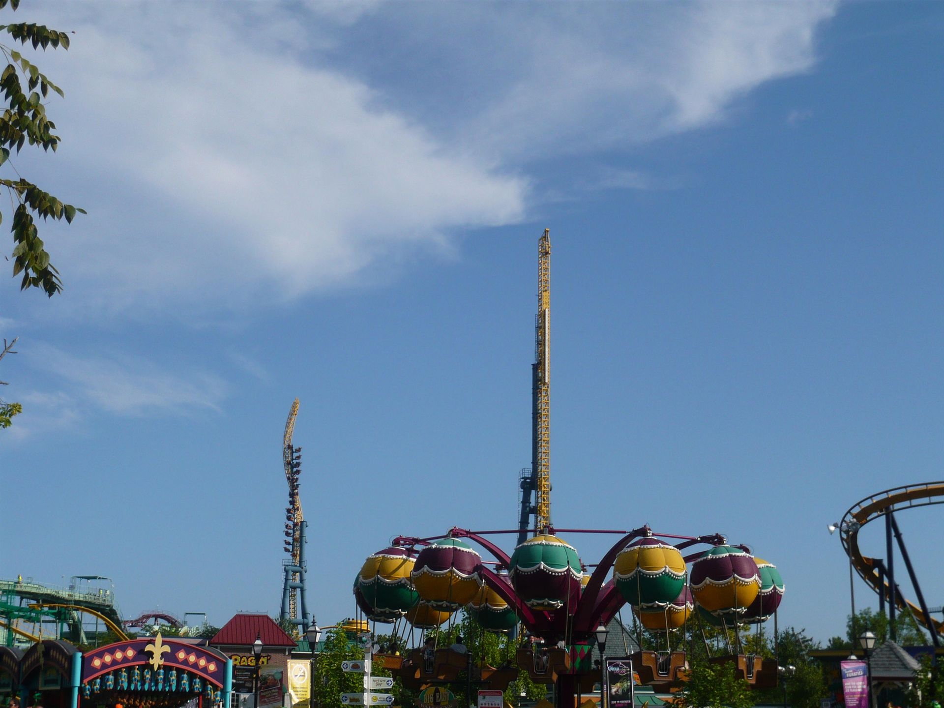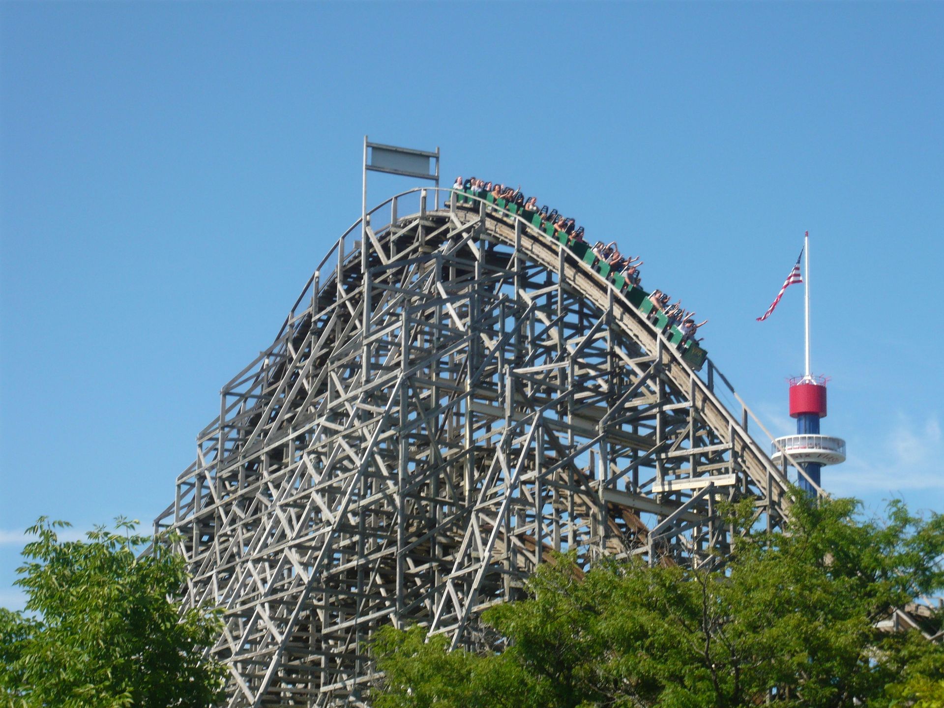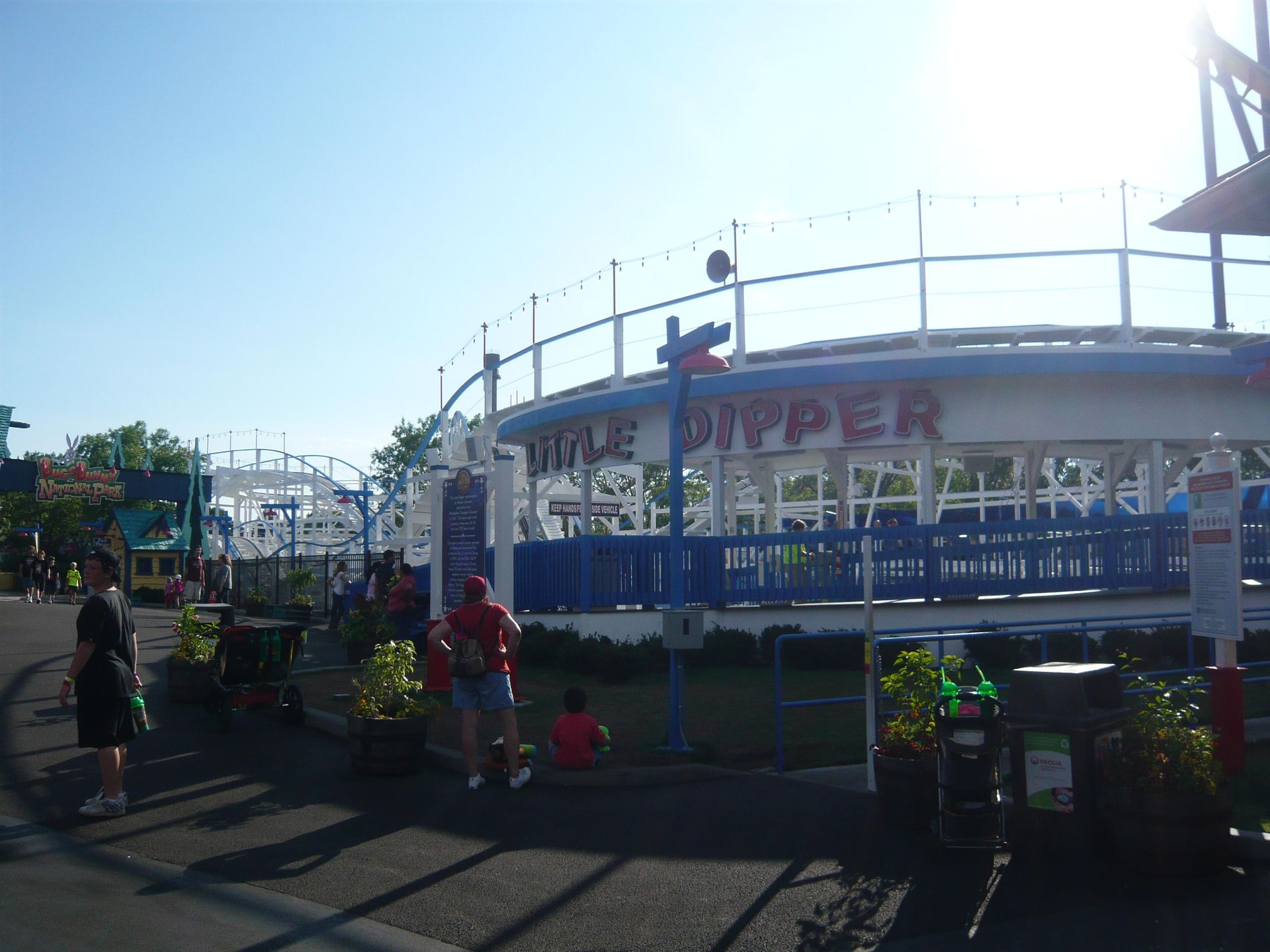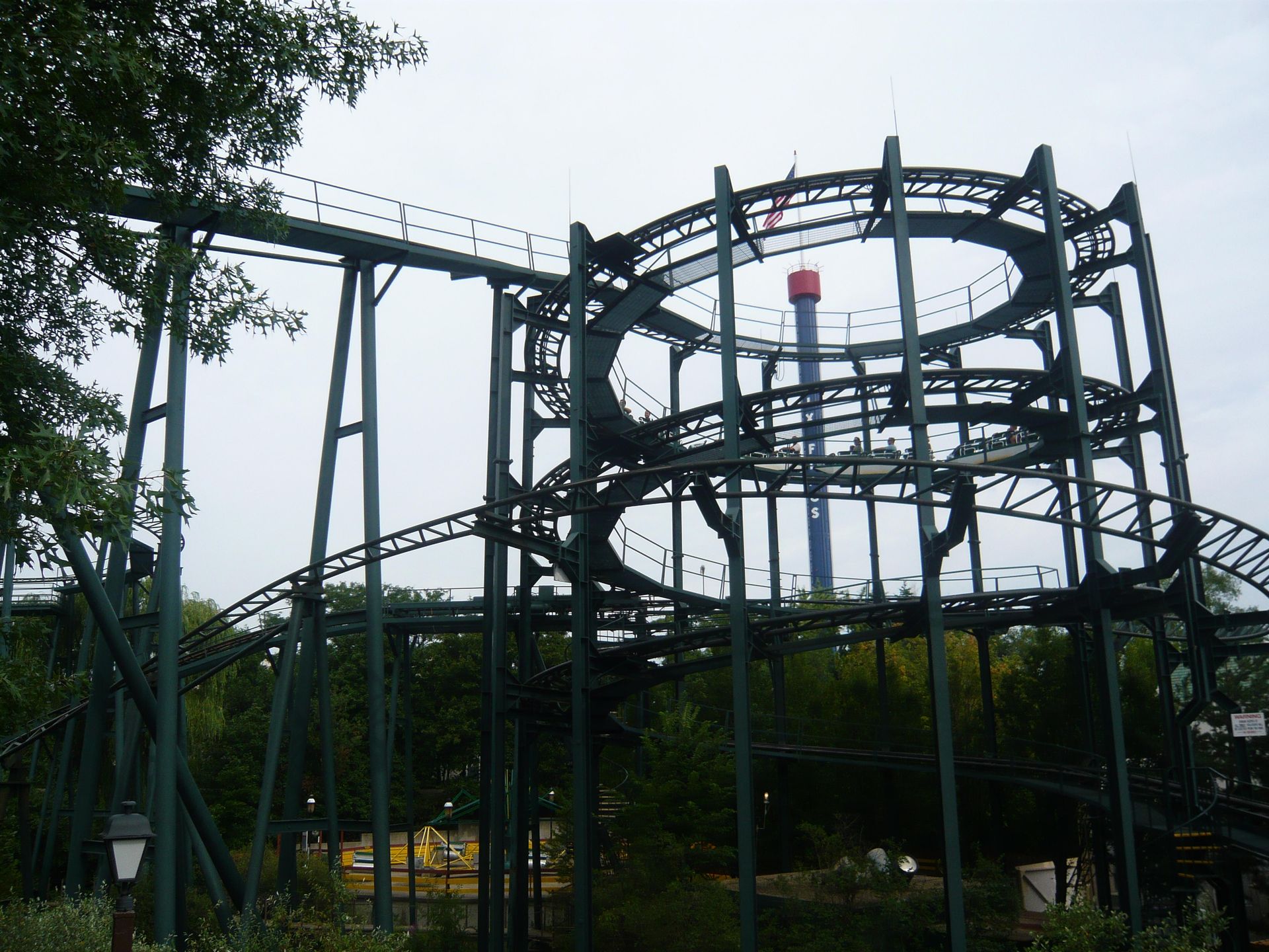 Am Eingang begrüsst das schöne Doppelstock-Karussell aus der Marriot-Ära die Parkbesucher! Obwohl die Öffnungszeit offiziell 10.00 Uhr war, wurde man nicht wie in anderen Six Flags-Parks am Eingang zurückgehalten, um irgendeiner Eröffnungszeremonie beizuwohnen, sondern konnte sich schon frei im ganzen Park bewegen - die Attraktionen waren einfach noch geschlossen. Das verschaffte mir einen entscheidenden Vorteil, denn als ich meine Wertsachen und das Schwimmzeug in einem Tagesspind in der Nähe des Wasserpark-Eingangs verstaute, bemerkte ich, dass auf dem Whizzer bereits Testfahrten durchgeführt wurden. Sofort begab ich mich also zu dessen Eingang und siehe da - die Warteschlange wurde gerade geöffnet. Dadurch konnte ich eine der ersten Fahrten des Tages mitmachen.