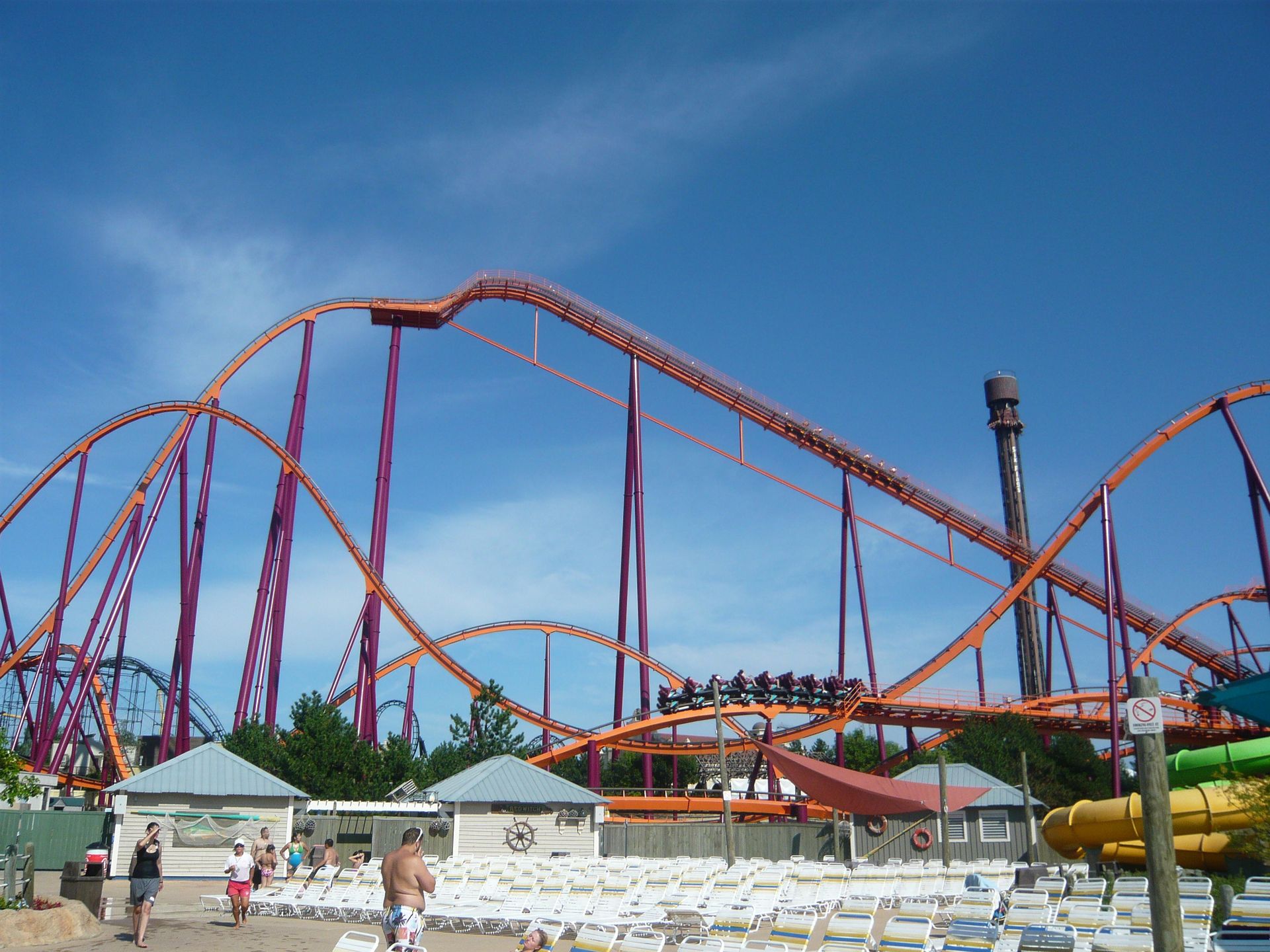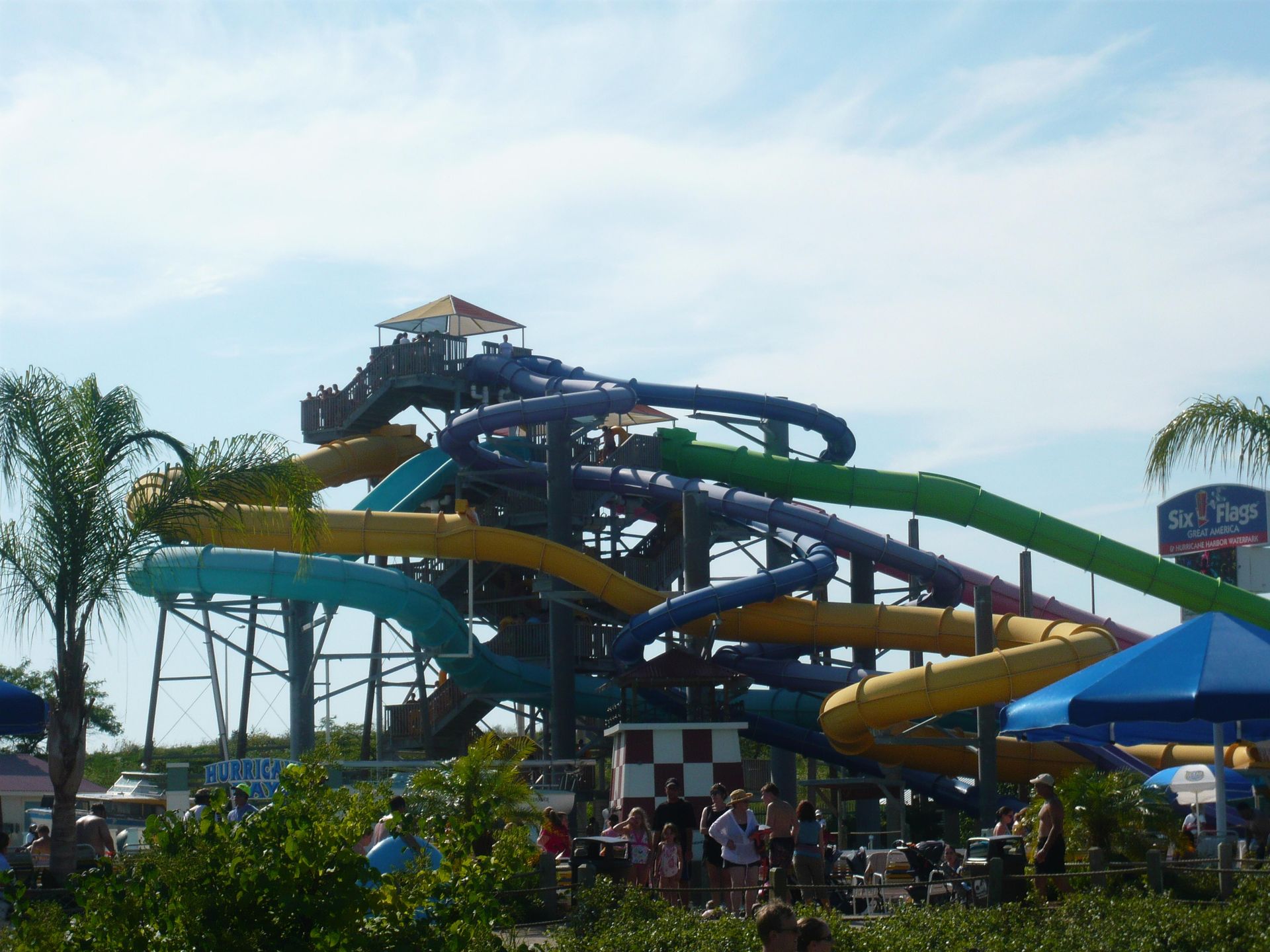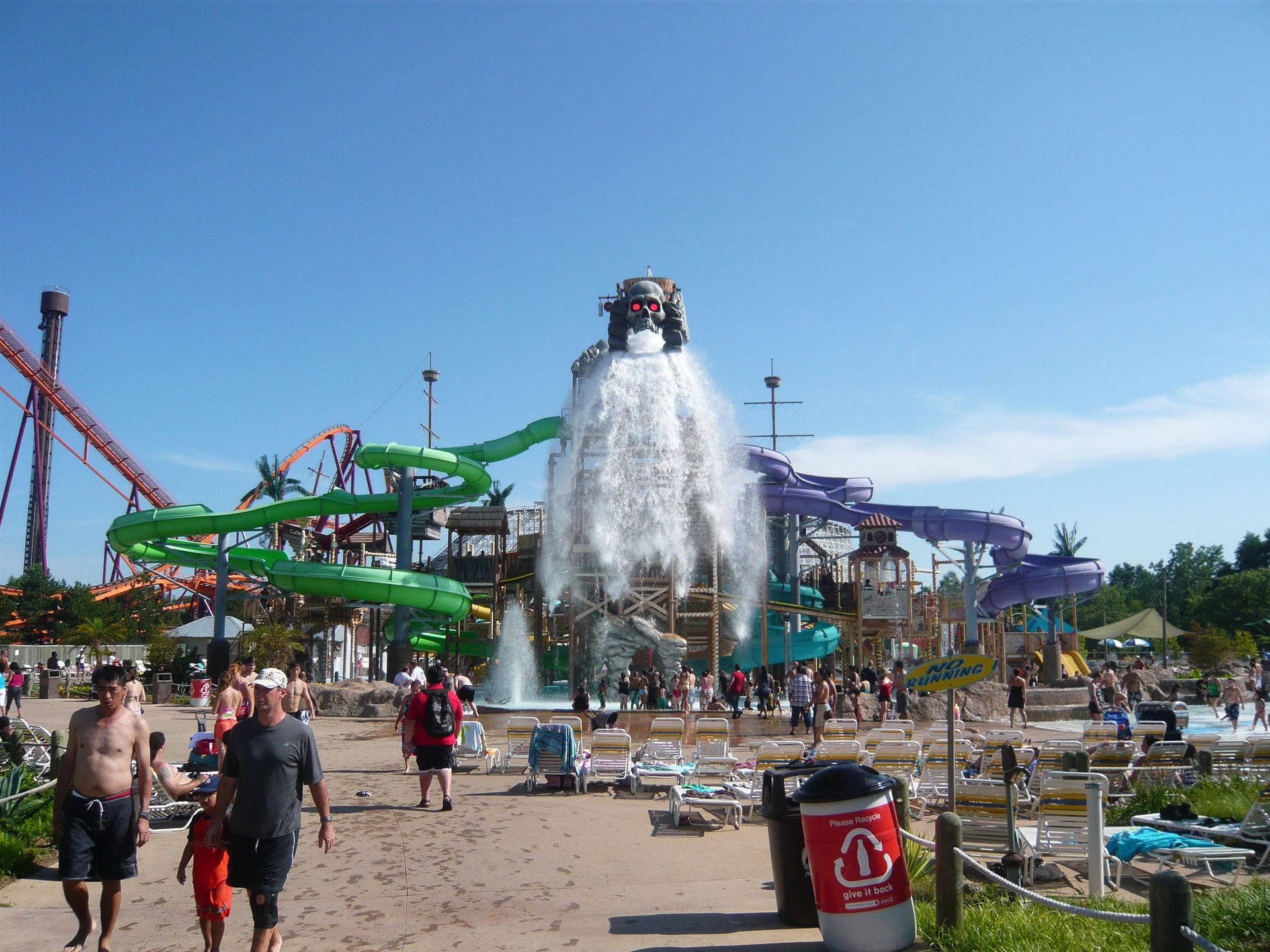 Little Dipper hatte geschlossen, als ich zuerst daran vorbeigelaufen bin; und danach eine sehr lange Schlange, da sie scheinbar nur einen Zug hat? Ich hatte mich jedenfalls dazu entschlossen, bei der vorherrschenden Gluthitze dem nebenanliegenden Wasserpark Hurricane Harbor einen Besuch abzustatten. Ich habe mich gleich im sauberen Toilettengebäude neben meinem Tagesspind umgezogen, was sich auch als gute Wahl herausstellte, denn die Locker-Miete im Wasserpark war völlig überlaufen und die Garderoben irgendwie schmuddelig und feuchtwarm. So musste ich nur ein Handtuch, T-Shirt und Latschen mitnehmen, die ich dann auf einem der zahlreichen Liegestühle deponieren konnte.