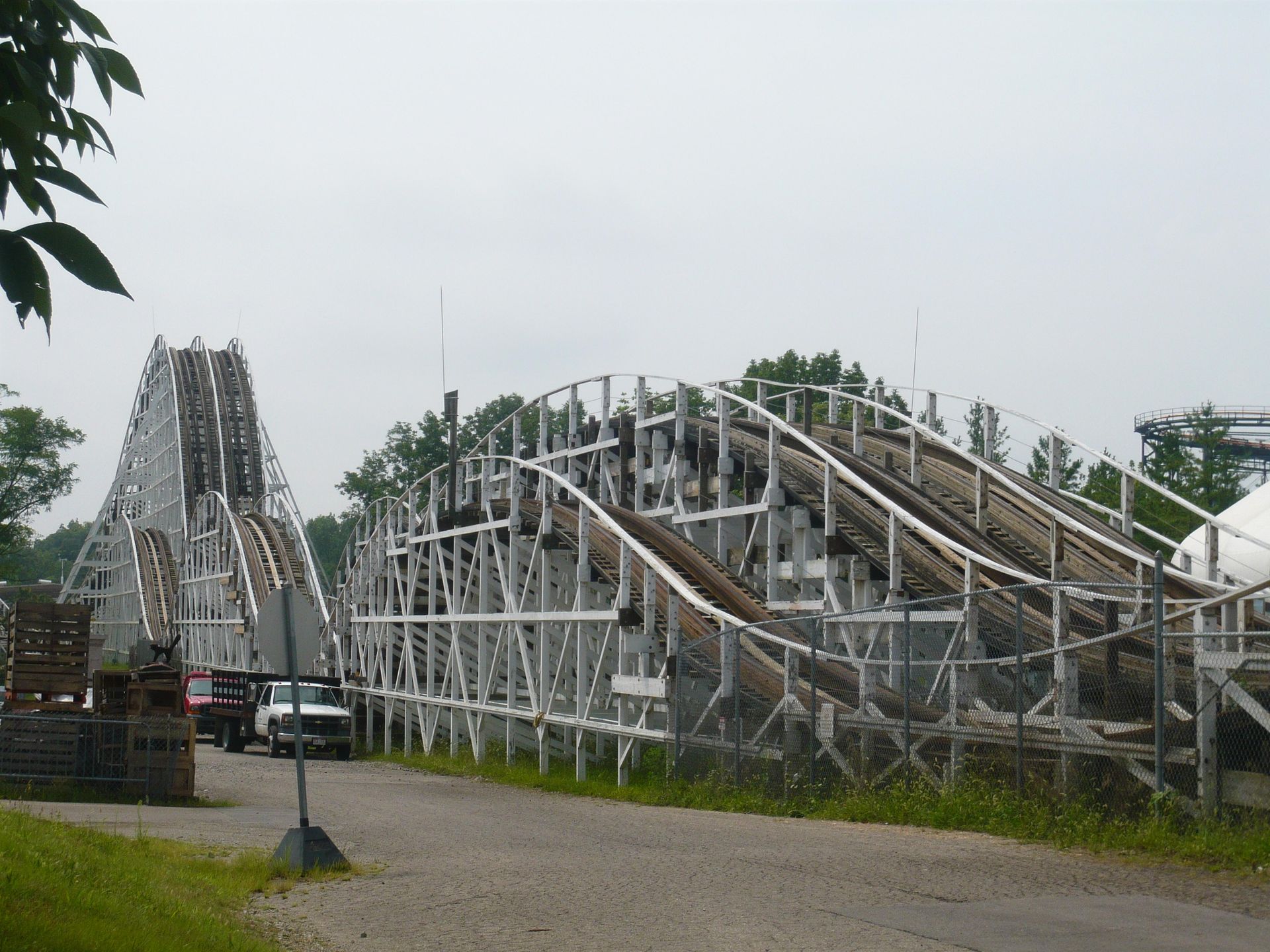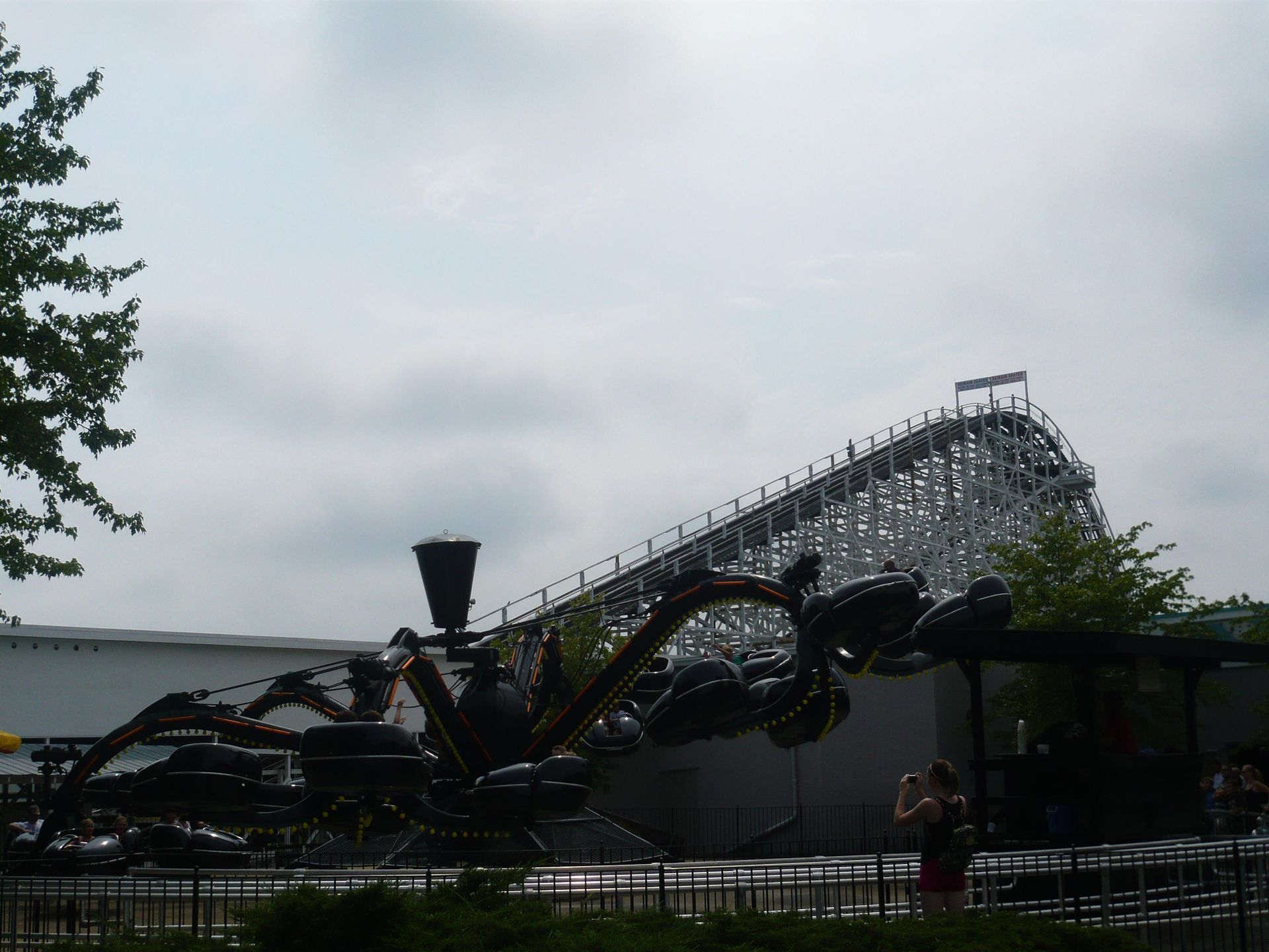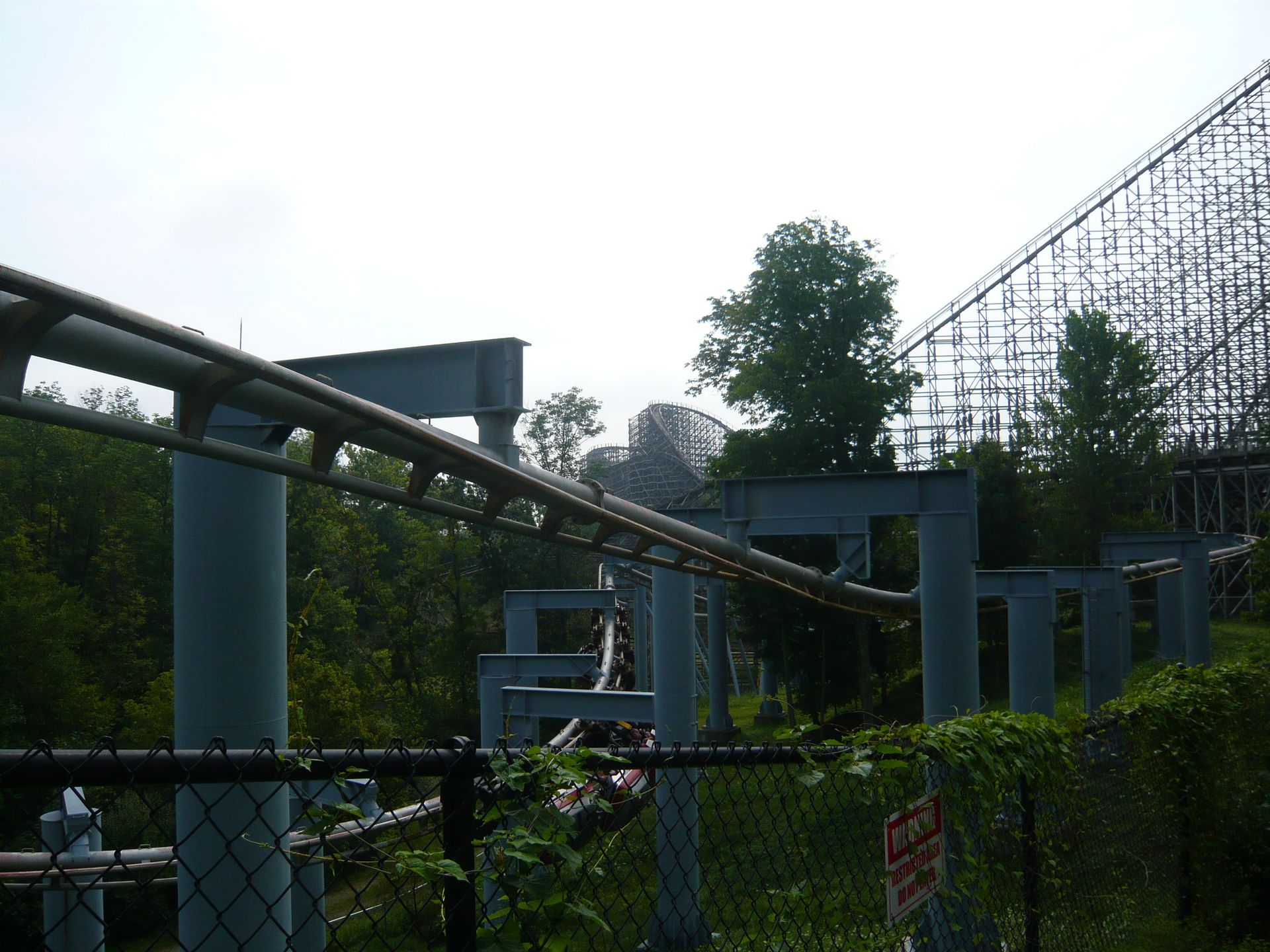 Als nächstes stand die Doppel-Holzachterbahn The Racer auf dem Programm, eines der absoluten Highlights bei unserem Besuch! Scheinbar kommt die Bahn vielerorts nicht besonders gut weg. "Einmal fahren und abhaken", "nett, aber mehr auch nicht" ist so der gängige Tenor, den man in Erfahrungsberichten liest. Wir dagegen hatten einen Heidenspass auf dem Teil! Fotos haben wir davon leider nur vom zweiten Besuch am Sonntag, wo bloss eine Seite lief, aber an unserem ersten Besuchstag ist die Bahn mit beiden Spuren gelaufen - und zwar auf Hochtouren! Dank den je 30 Menschen fassenden Zügen und der Tatsache, dass sich die Besucher in der Station hier wesentlich besser auf alle Sitzreihen verteilten, war selbst an einem so vollen Samstag eine maximale Wartezeit von knapp fünf Minuten oder so angesagt. Ausserdem wurden die Züge fast jedesmal gleichzeitig losgeschickt, wodurch der Renneffekt seine volle Wirkung entfalten konnte! Hier ging es wirklich jedesmal anders aus - mal gewann die rote, mal die blaue Seite! Herrlich, so muss das sein! Die Strecke ist wie Shivering Timbers ein sehr schlichtes Out and Back-Layout, das aber gute Woodie-Fahreigenschaften und einige prima