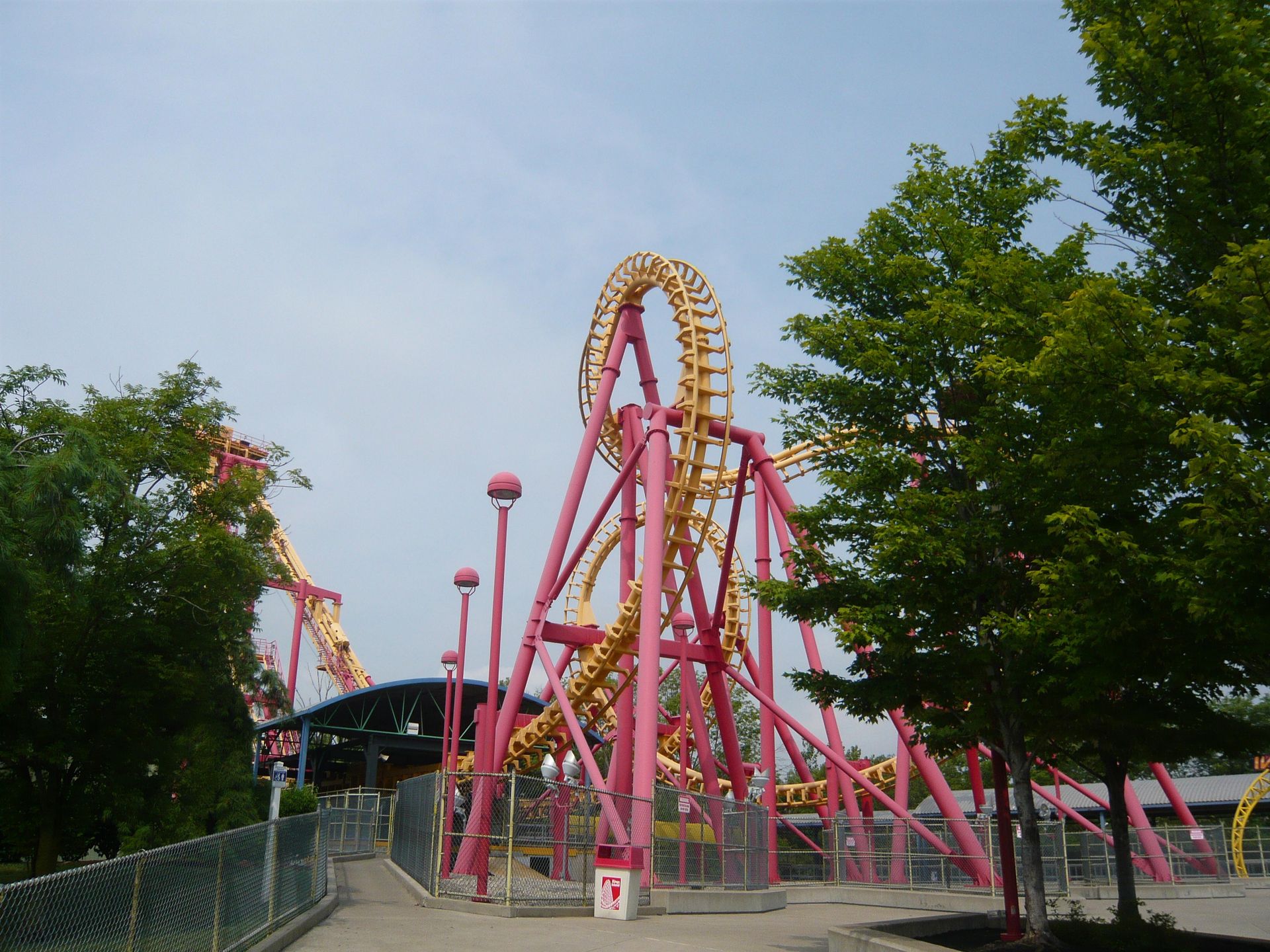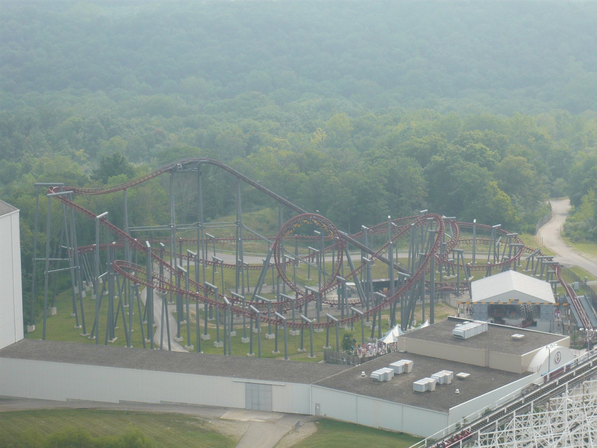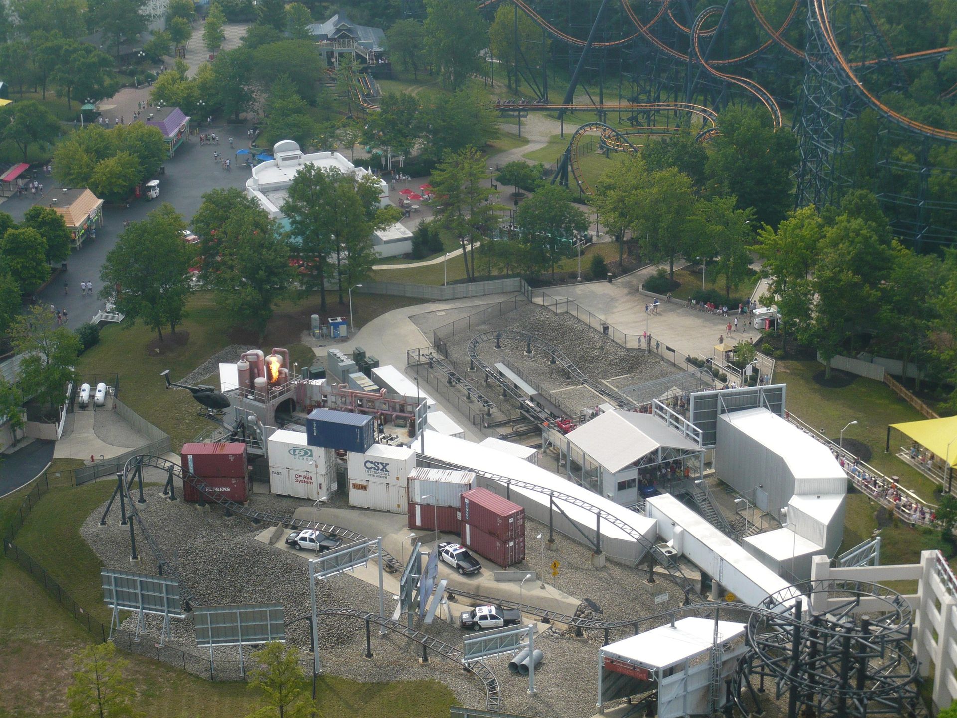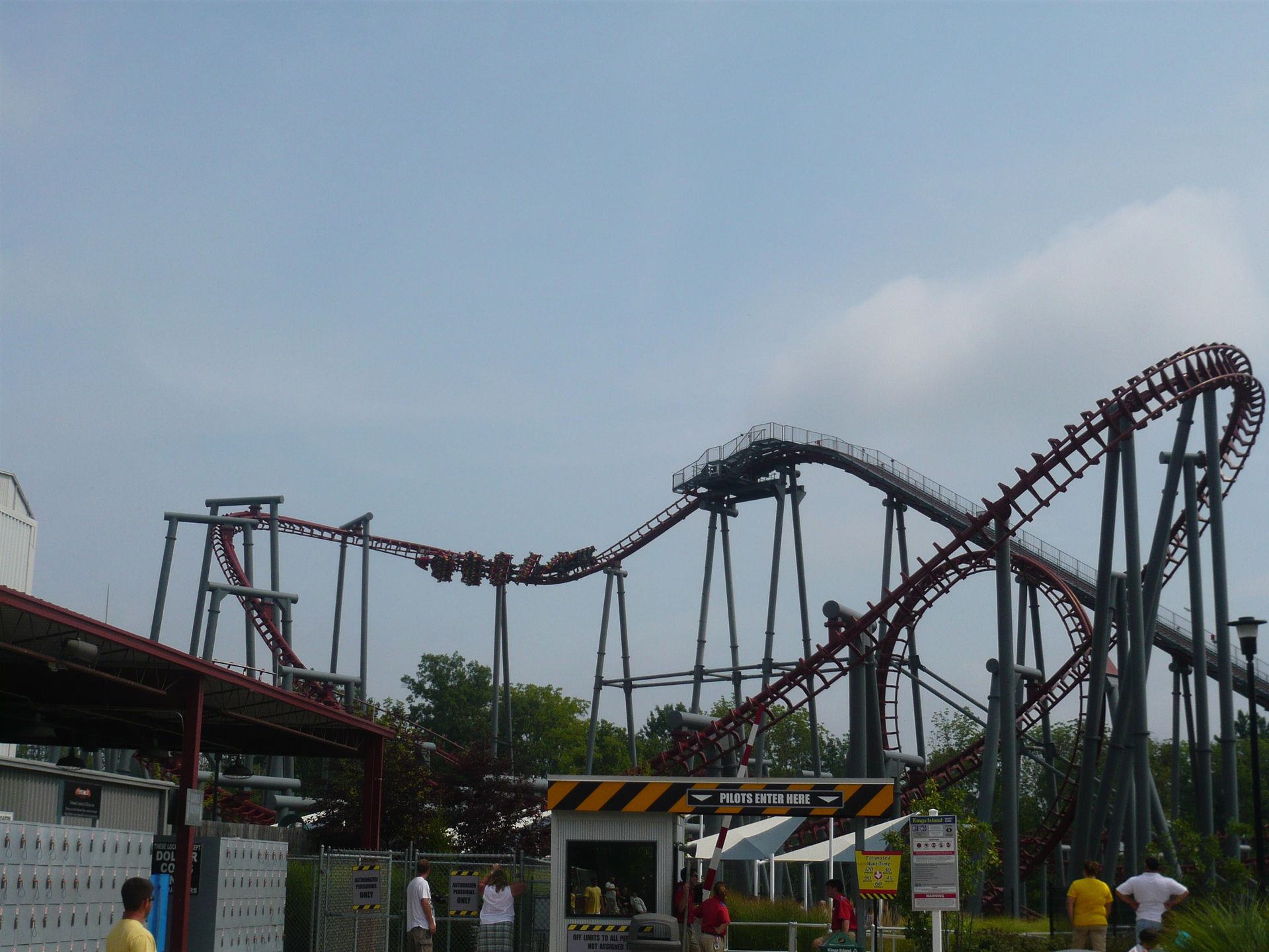 Flight of Fear, der sich gleich nebenan befindet, sah noch verstopfter aus, also ging die Tour erstmal weiter zu Vortex, einem grossen Arrow Multilooper.