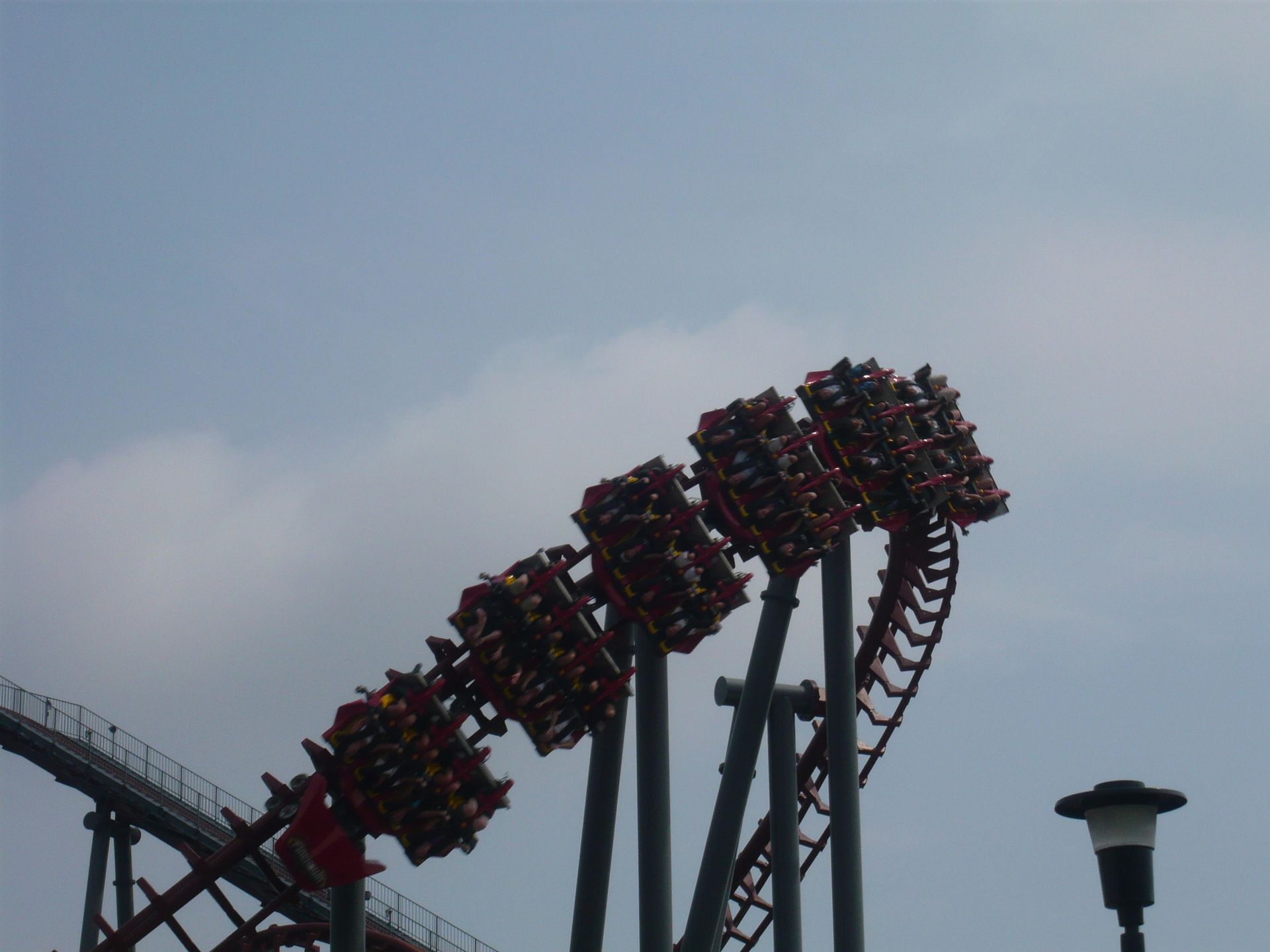 Danach folgen eine Drehung zurück in die Flugposition, zwei Kurven mit Schussfahrt dazwischen und dann zwei Heartline Rolls, bei denen man ständig das Gefühl bekommt, gleich in die Stützen zu knallen. Nach der Abschlusshelix und dem finalen Dreh in die Liegeposition ist die Fahrt zu Ende!