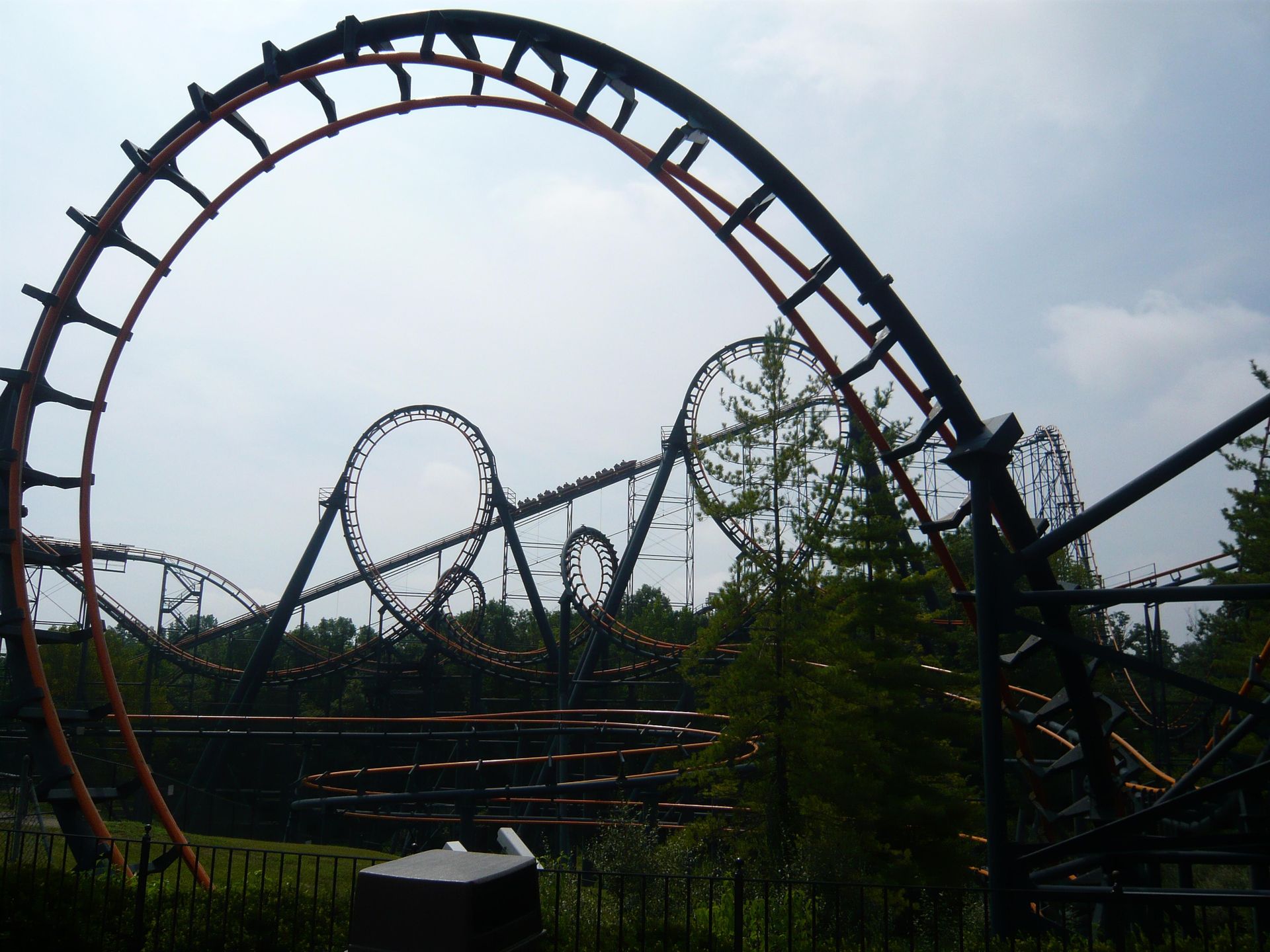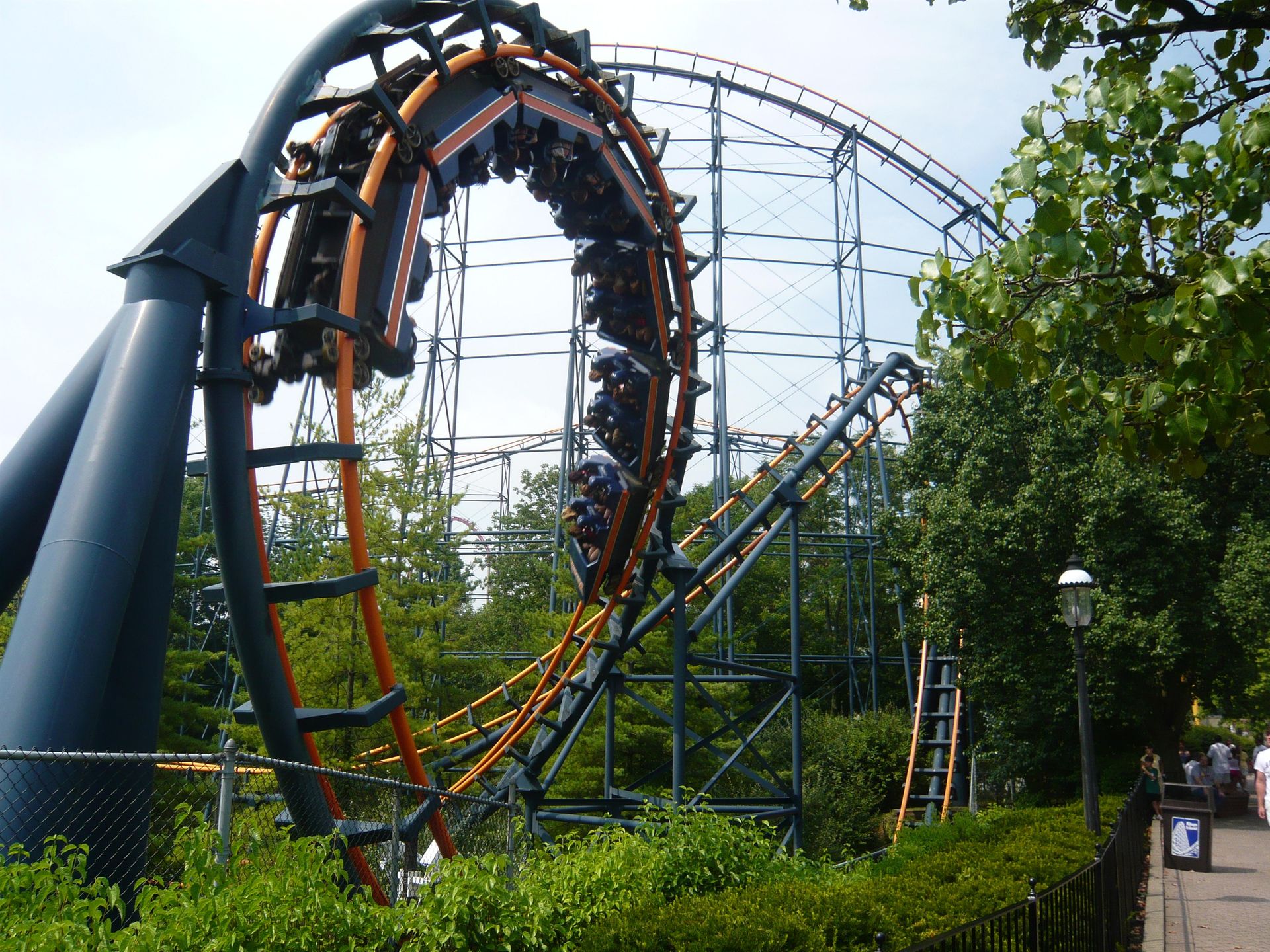 Eine weitere gute Bahn! Der Abschuss hat durchaus Schmackes und die ersten drei Inversionen lassen einen aufgrund der Dunkelheit komplett die Orientierung verlieren! Da weiss man wirklich nicht mehr, wo oben und unten ist. Danach wird der Zug in der Zwischenbremse fast auf null abgebremst, was umso ärgerlicher ist, da die Bahn ja schon lange nicht mehr mit den ursprünglichen vier, sondern bloss noch mit zwei Zügen betrieben wird. Und eine separate Aussteigestation hat die Bahn ja ohnehin. Naja, jedenfalls nimmt sie schon bald wieder Speed auf, um durch den unteren Kurventeil zu donnern. Die Richtungswechsel sind nicht immer ganz rappelfrei - ich will mir das nicht mit Schulterbügeln vorstellen! Aber die in der Finsternis mehr als nur geniale übergeneigte Kurve und der völlig überraschende