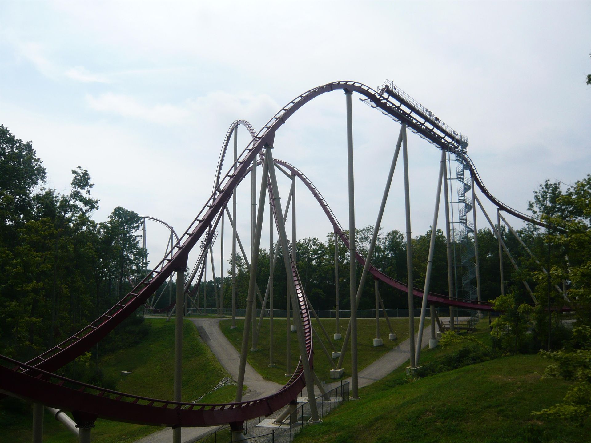 Auf der maximalen Höhe angelangt, folgt auch gleich eine der besten Stellen der Bahn! Der Moment, in dem man nach der ersten kleinen Schussfahrt in gut 35 Metern Höhe aus der ungewohnten, aber irgendwie "sicheren" Rückenlage in die Flugposition geworfen wird, lässt einem das Blut in den Adern gefrieren! Der folgende flache Kurvendrop ist einfach wunderschön, ebenso die grosse übergeneigte Kurve danach. Hierauf wird man dann wieder in die Liegeposition gedreht und passiert so einen klassischen