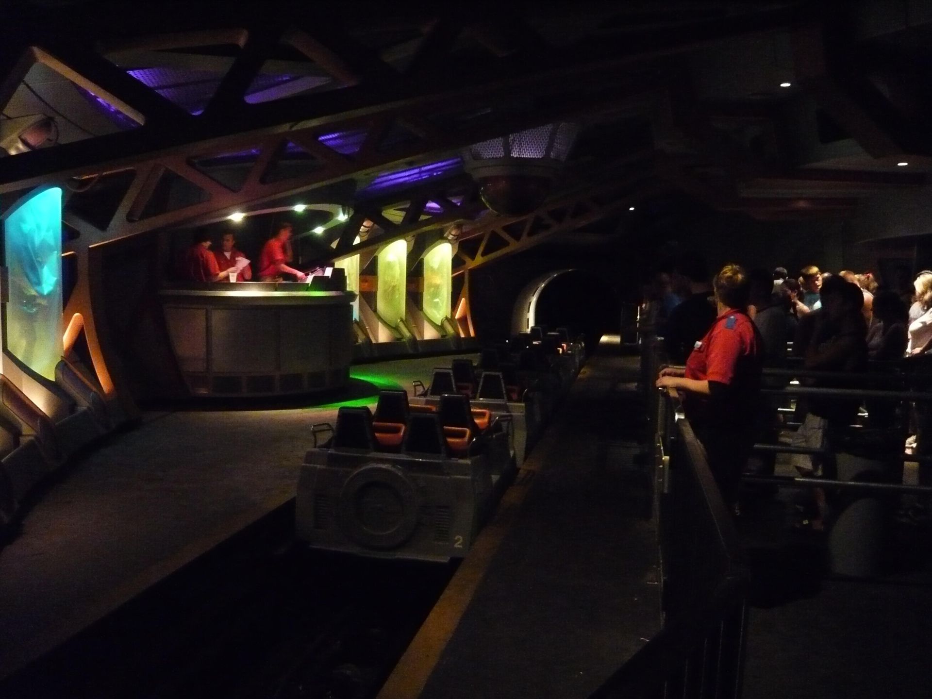 Hier waren knapp 20 Minuten Wartezeit angesagt, wobei es auch weniger hätten sein können. Was hier zum ersten Mal auffiel, ist das unglücklich geratene Warteschlangenkonzept kurz vor der eigentlichen Station: Die Schlange teilte sich in "front of train" und "back of train" auf, aber in der Station selbst kamen die beiden Spuren dann wieder zusammen. Unzählige Menschen, die hier durch die fehlenden Trennstangen dann also die Möglichkeit hatten, sich umzuentscheiden, blockierten diese Stelle für alle dahinter Wartenden. So kam es, dass einige Reihen im hinteren Zugteil deshalb selbst an einem so vollen Samstag einfach leer geblieben sind - weil weiter hinten anstehende Personen wegen den "Umentscheidlingen" nicht durchgekommen sind. Die Ride-OPs versuchten zwar mit Lautsprecherdurchsagen und in gestikulierender Manier auf die freien Plätze aufmerksam zu machen - vergeblich. Die Jungs und Mädels wollten halt lieber anderswo fahren und erkannten nicht, dass sie durch das Stehenbleiben an dieser Stelle die ganze Queue blockierten. Gegen Dummheit kommt man eben nicht an. Leider war doofes Anstehverhalten in Kombination mit unzureichender Queue-Konzeption auch an anderen Bahnen in diesem Park an der Tagesordnung. Da war manchmal echt Geduld gefragt.