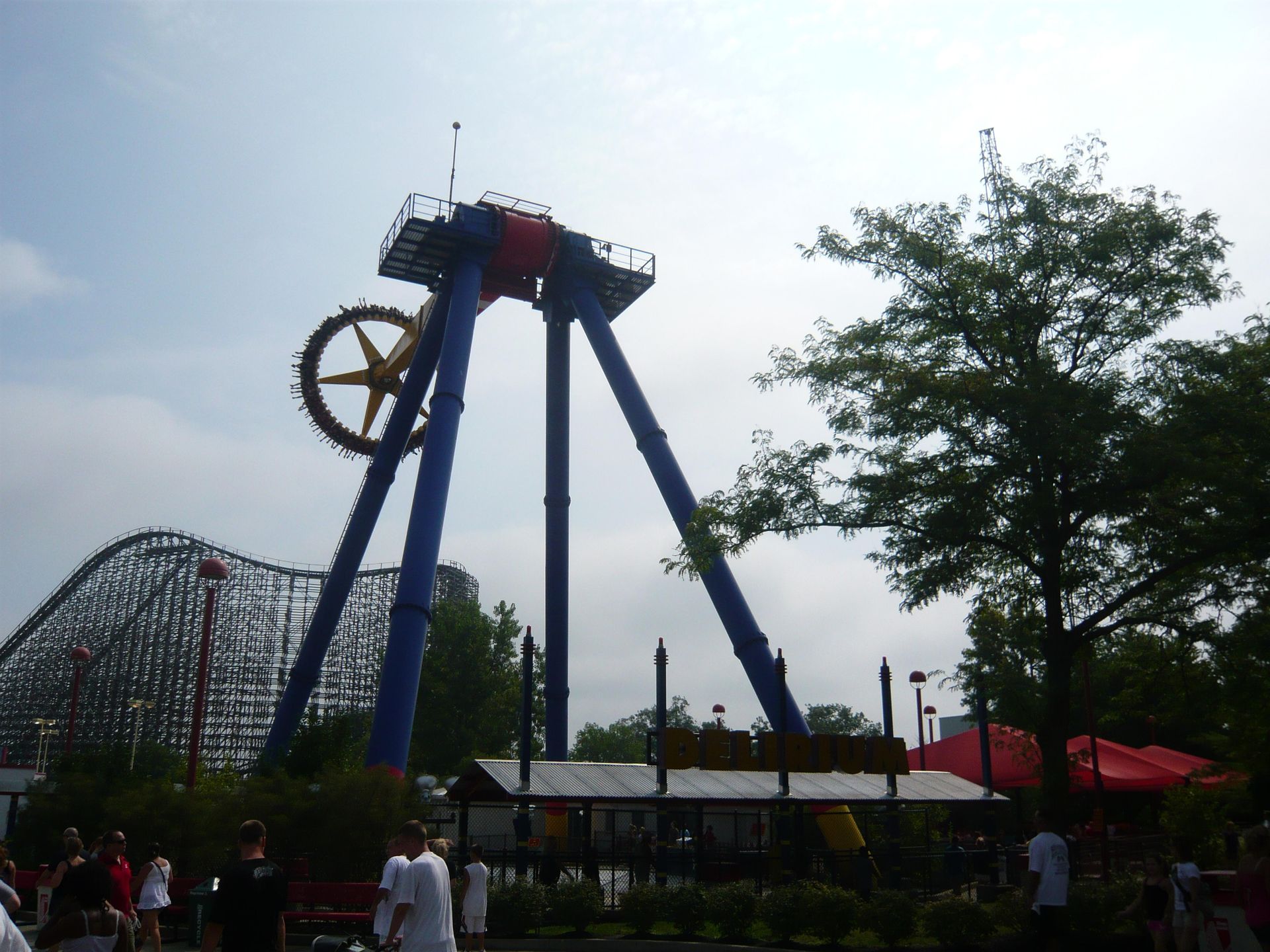Vekoma Flying Dutchman Firehawk gehen, dem ehemaligen X-Flight aus Geauga Lake. Bei Zweizugbetrieb war hier eine Stunde Wartezeit angesagt, die aber durch das konstante Bewegen der Schlange, nettes Plaudern mit anderen Parkgästen sowie ein paar erfrischende Ventilatoren gut auszuhalten war.