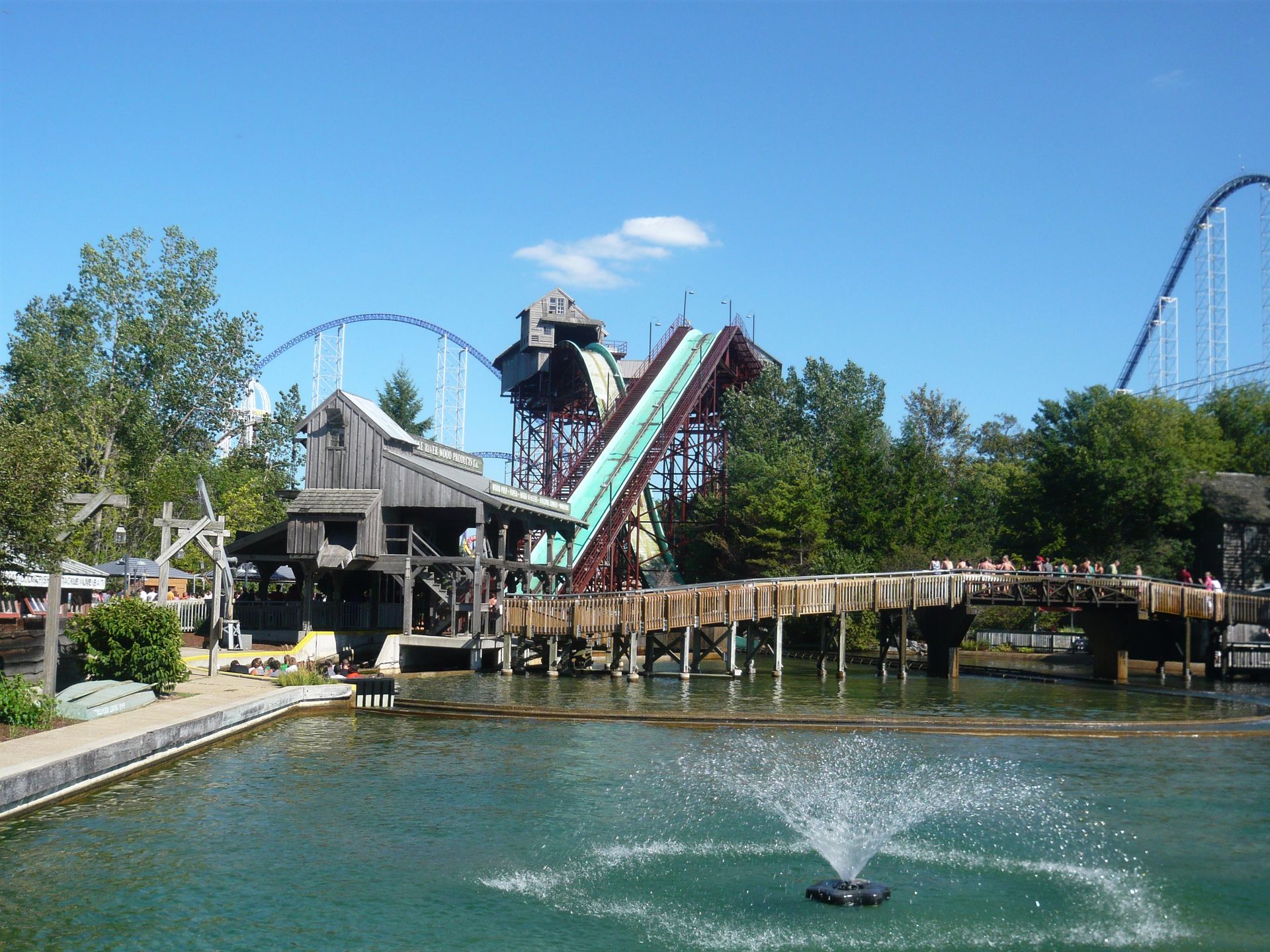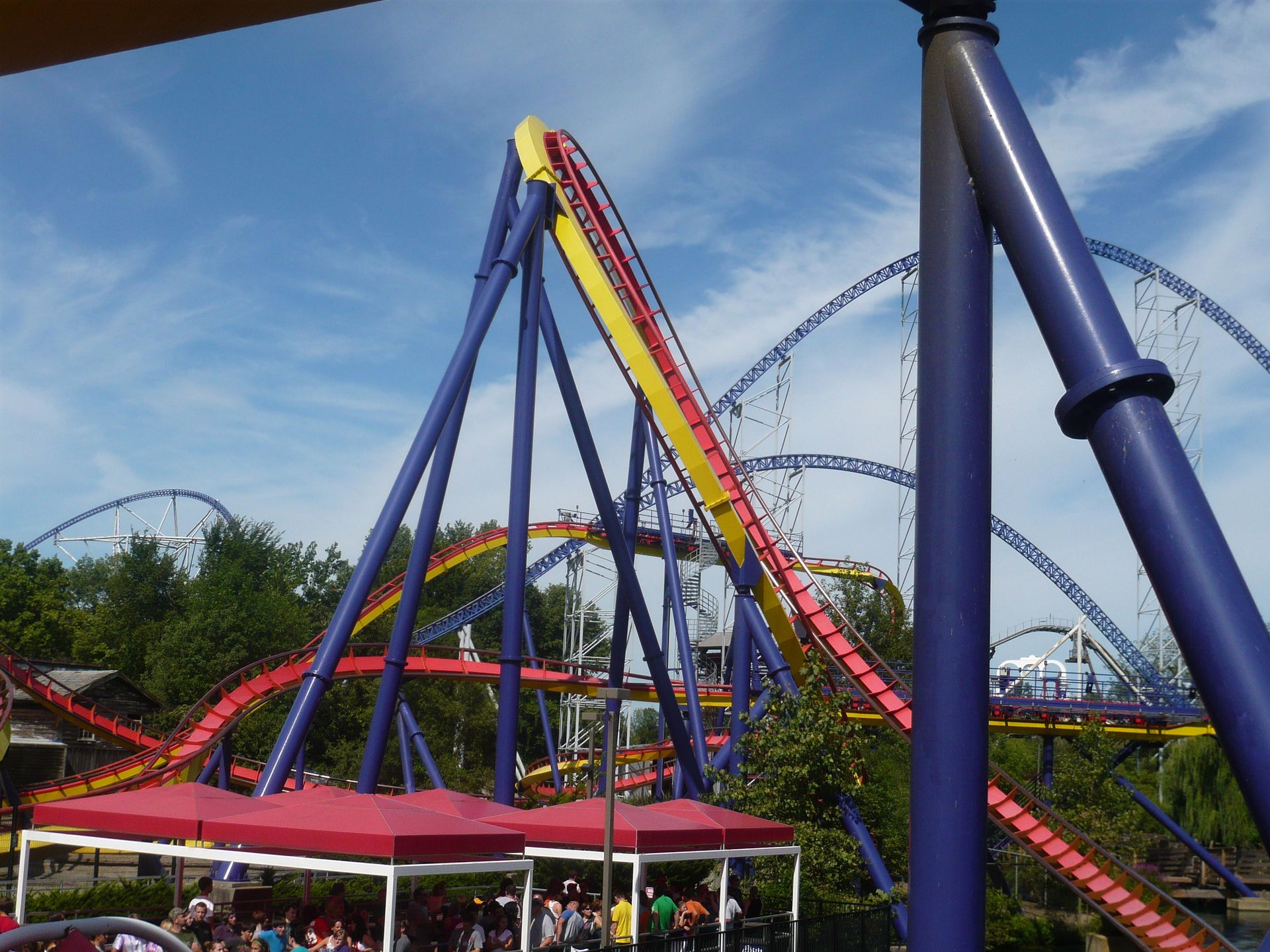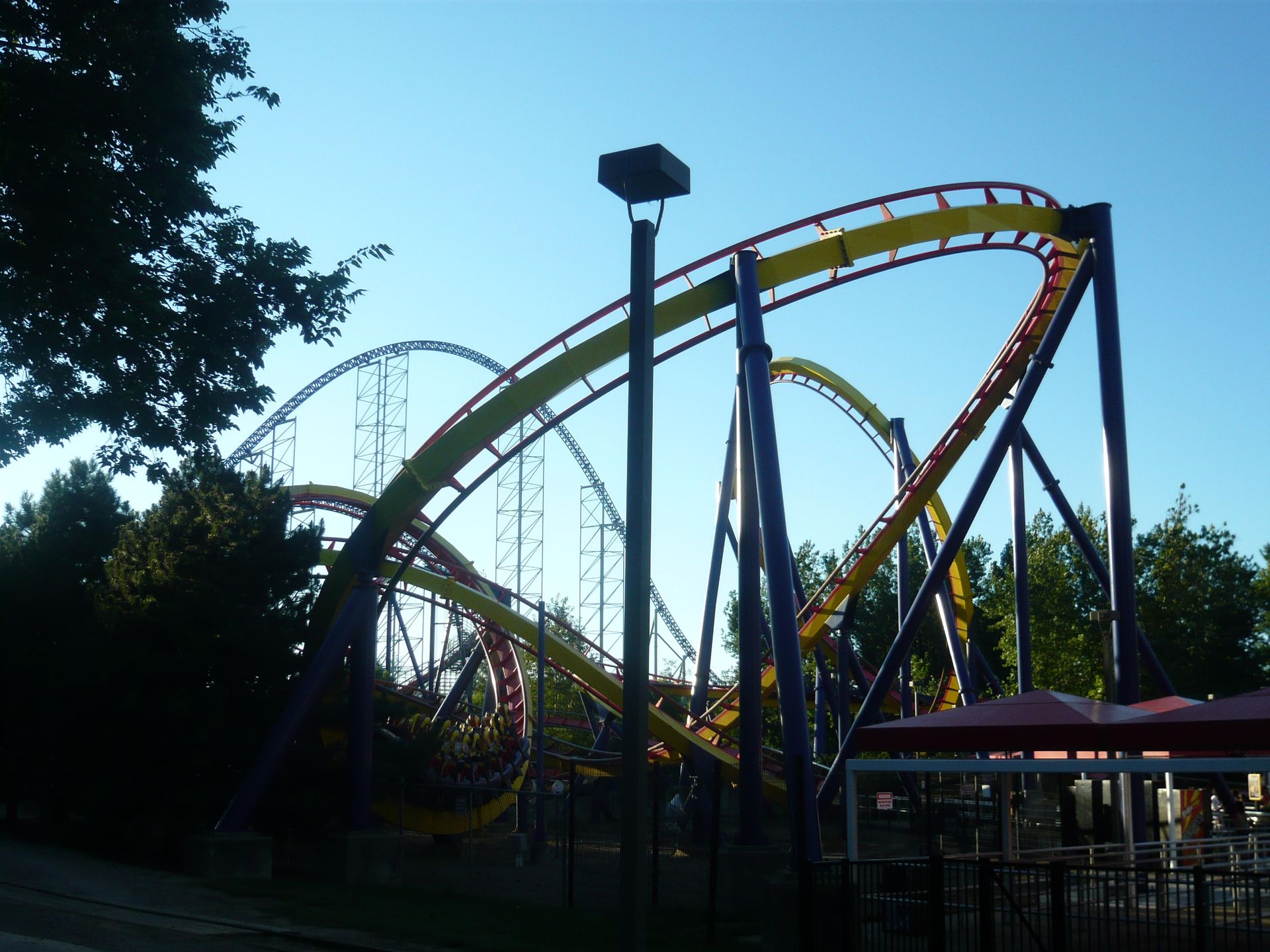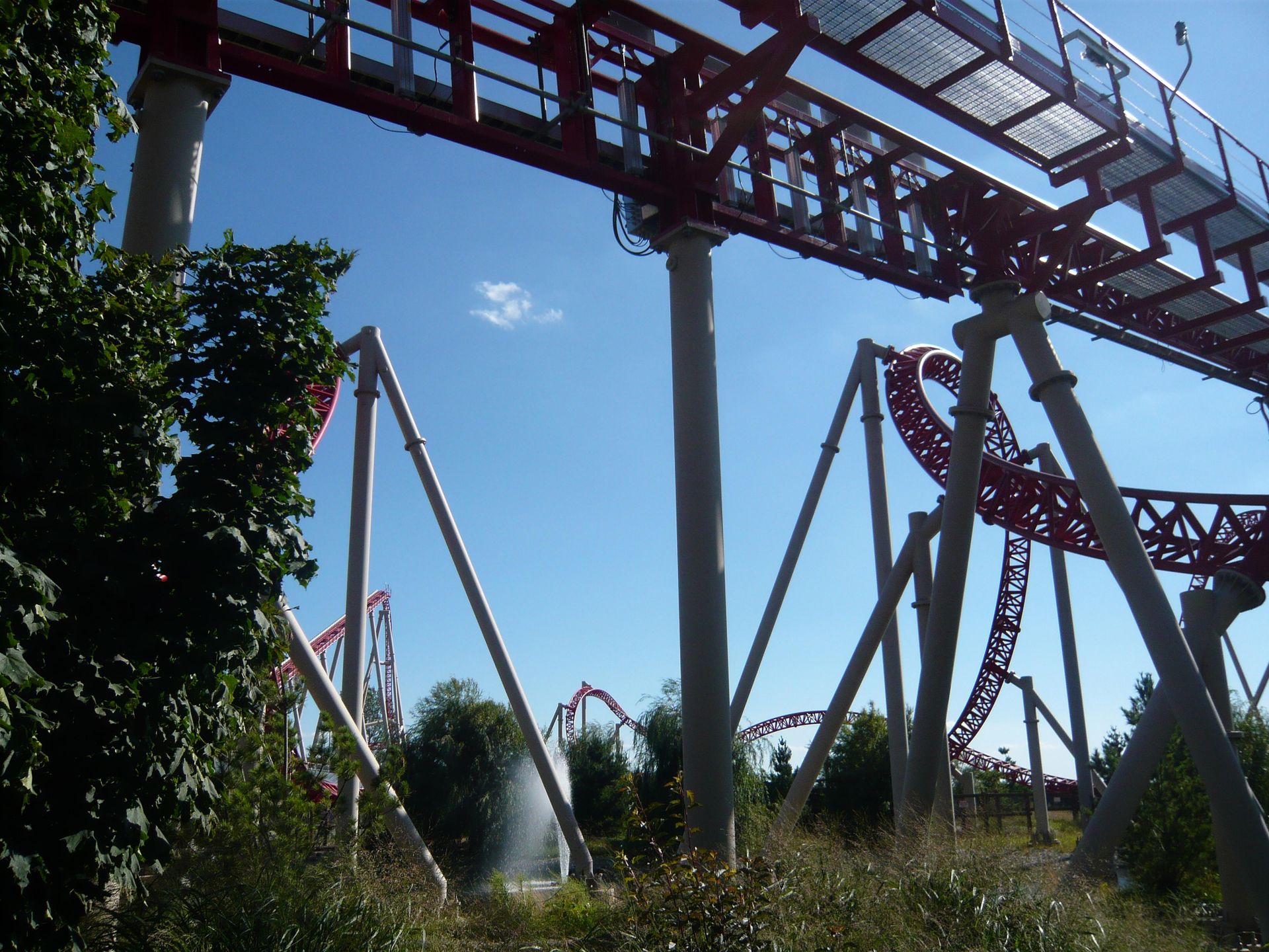 Hierauf haben wir den Park dann beim anderen Zugang nahe Wicked Twister wieder betreten. Dort war die Wartezeit mit stolzen 45 Minuten angegeben, so dass erst einmal Disaster Transport und die umliegenden Fahrten an der Reihe waren.