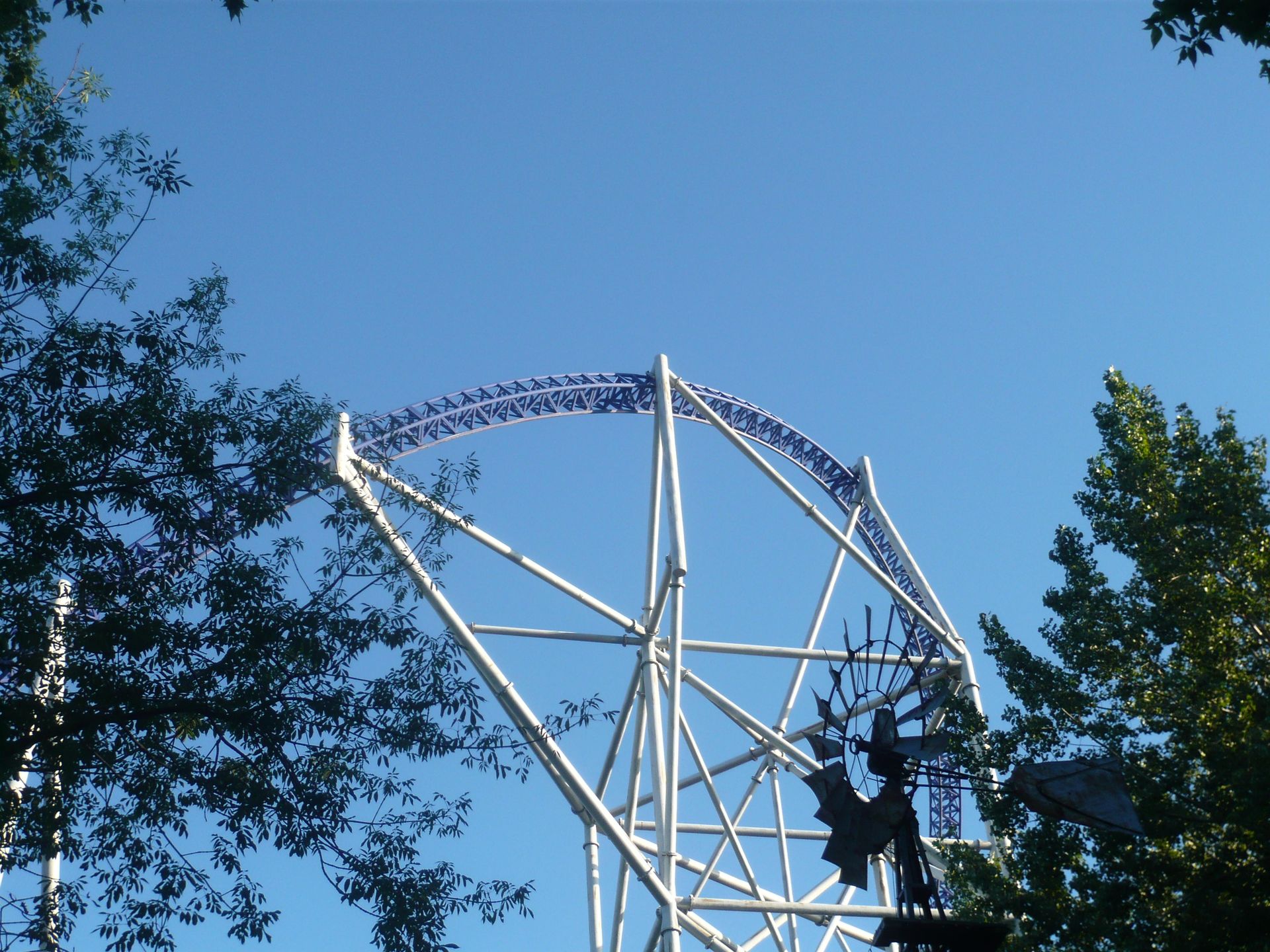 Was diese Bahn an einem Augusttag so attraktiv macht: Die fast unfassbar riesige stündliche Kapazität. Da man in einer gemeinsamen Schlange für beide Spuren ansteht, geht es hier so rasch vorwärts wie nirgends sonst im Park. Und obwohl ich nur ein einziges Foto davon im Rennmodus habe, ist die Bahn bei all unseren Fahrten an beiden Tagen mit zwei synchronisierten Zügen auf jeder Spur gelaufen. Zwar hat fast jedesmal die blaue Seite gewonnen, aber das tut dem Ganzen keinen Abbruch. Ich mag Rennbahnen einfach! Gemini besonders, weil sie überraschend hoch und schnell ist (stolze 36 m und 96 km/h!), einige hübsche