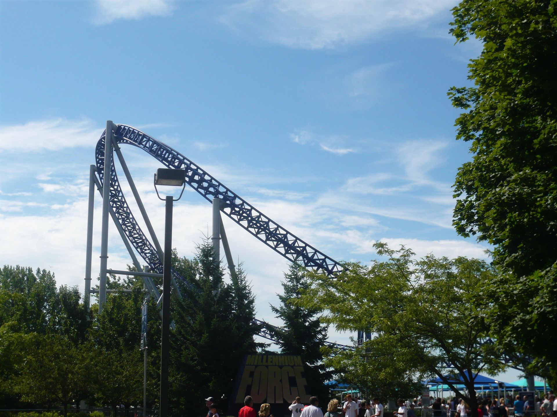 Wir standen als eine der ersten vor den noch geschlossenen Toren und als die Bahn dann pünktlich zur Parköffnung aufmachte, konnten wir schon bald in einem der Züge Platz nehmen. Festgezurrt wird man auf die Startrampe geschoben. Der Anblick der Beschleunigungsstrecke mit diesem unendlich hohen Turm dahinter lässt mir wirklich bei jeder Fahrt das Blut in den Adern gefrieren. Durch diesen Anblick wird einem jedesmal bewusst, wie HEFTIG die Beschleunigung ausfallen wird, wenn der Zug es DA DRÜBER schaffen soll. Wahrlich ein Kribbeln, das man als vielfacher Achterbahnfahrer schon längst verloren geglaubt hat. Hier tritt es wieder auf. Die Motorengeräusche ertönten, der Zug klinkt sich durch eine kurze Rückwärtsbewegung in den Startschlitten ein. "Arms down! Arms down! Head back, and hold on." Die Sekunden scheinen endlos... Doch da - die Lichter... BA-WOOOSSSHHH!!! Dieser Push ist einfach nichts für schwache Nerven, Worte können diesen Druck nicht ausreichend beschreiben! In 4 Sekunden wird man nun also auf sagenhafte 193 km/h beschleunigt und man erklimmt den 122 Meter hohen Vertikalturm. Die Hilflosigkeit, während man auf dem Rücken gen Himmel schiesst, dabei abrupt um 90 Grad dreht und sich schon nach rechts herausfallen sieht. Dann die Spitze, der Eriesee und Millennium Force unter einem... Man hebt ab - und hat für mehrere Sekunden einfach keinen Sitzkontakt mehr. Man befindet sich nun sprichwörtlich im freien Fall, während der Zug einem irgendwie um die gelben Stützen herum reisst und um 270 Grad rotieren lässt. Wir sind unten, und schiessen mit einem Affenzahn in die Zielgerade. 20 Sekunden hat der Spuk gedauert - man fühlt sich jedesmal wie neugeboren. Diese Bahn ist einfach sooo grenzdebil und liefert jedes einzelne Mal Fahrten, die man ein Leben lang nicht mehr vergisst.
