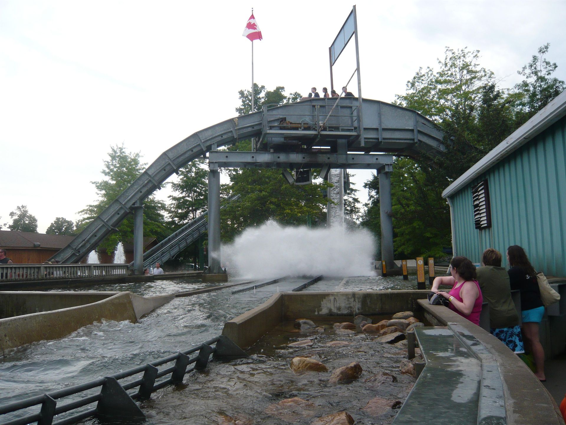 Die Queue der nebenan liegenden Wildwasserbahn Thunder River sah dagegen überschauberer aus. Eine Viertelstunde später sassen wir dann auch schon startbereit in einem der Baumstämme. Die Fahrt beginnt mit einem interessanten, langen Nebeltunnel. Während der erste Teil noch bedrohlich dunkel ist, ist der zweite hell beleuchtet - zusammen mit dem dichten Wasserdampf ergibt das aus Sicht des Fahrgastes eine interessante Optik, die ich so noch nie auf einer Log Flume gesehen habe. Danach folgt der kleinere der beiden Drops, der einen noch relativ trocken zurück lässt. Hierauf gleitet man durch eine Kehrtwende an einigen hübschen Springbrunnen vorbei, bevor man dann die Auffahrt zur zweiten, grösseren Schussfahrt erklimmt. Diese ist überraschend steil und nässt die Passagiere auf den vorderen Plätzen auch ziemlich durch. Ich selbst sass weiter hinten und erlebte einen etwas angenehmeren Nässegrad.