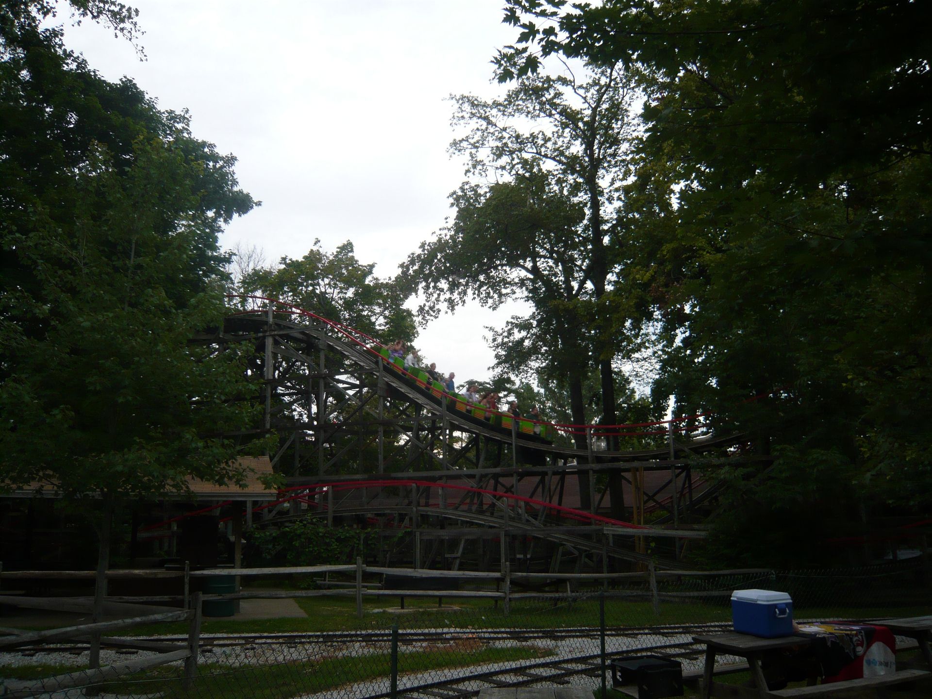 ), sondern auch einen ganz bestimmten kleinen Park mit einem gewissen Weltklasse-Woodie. Die Rede ist natürlich vom Waldameer Park, der sich durch die Eröffnung des Ravine Flyer II im Jahr 2008 schlagartig auf der Coaster-Landkarte platziert hatte. Logo mussten wir hier sogar nach einem zweitätigen Cedar Point-Besuch noch kurz vorbeischauen. Die Betonung liegt auch hier leider wieder auf kurz, denn wie man auf den Fotos sehen kann, sollte uns das Wetter hier wieder mal einen Strich durch die Rechnung machen, hier noch ein paar schöne Abendstunden zu verbringen. Wie in Indiana Beach gibt es seit dieser Saison auch hier Entwertungskarten nach einem Prepaid-System, die dann an den einzelnen Rides abgebucht werden, Wally-Cards genannt. Obwohl das Wristband äusserst preiswert ist, hätte es sich - besonders im Nachhinein gesehen - für unseren Kurzbesuch nicht gelohnt. Von meinem letzten Besuch hier wusste ich noch, dass eine Einzelfahrt auf dem Ravine Flyer II 4.50$ kostete; also besorgten wir uns drei solche Karten und luden sie für die Fahrten, die wir machen wollten, entsprechend auf.