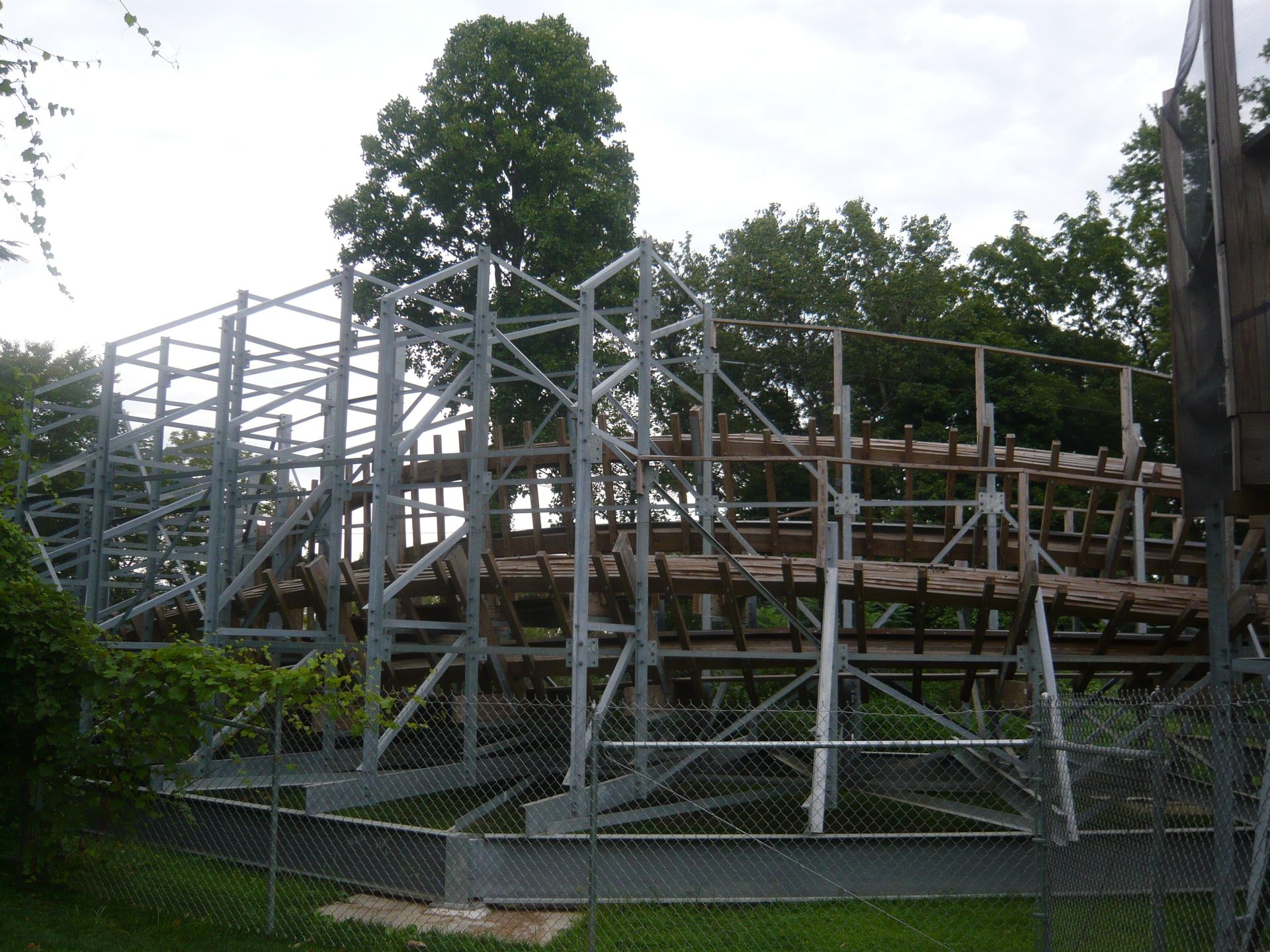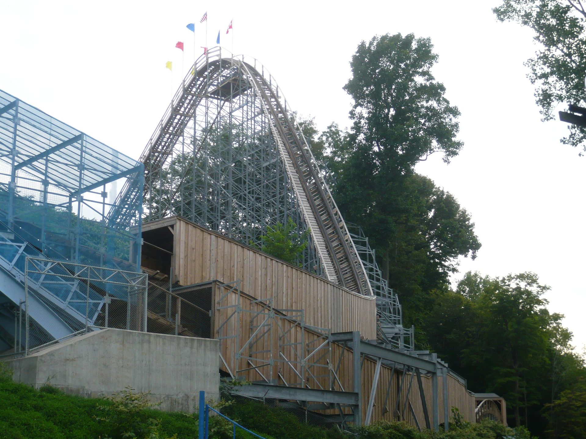 Von dort unten sieht man aber das, was diese Bahn so toll macht: die einzigartige Ausnutzung des dahinter liegenden Abhangs. Während der Lifthill vom Parkniveau aus gesehen glaube ich 24 Meter hoch ist, beträgt der Höhenunterschied des