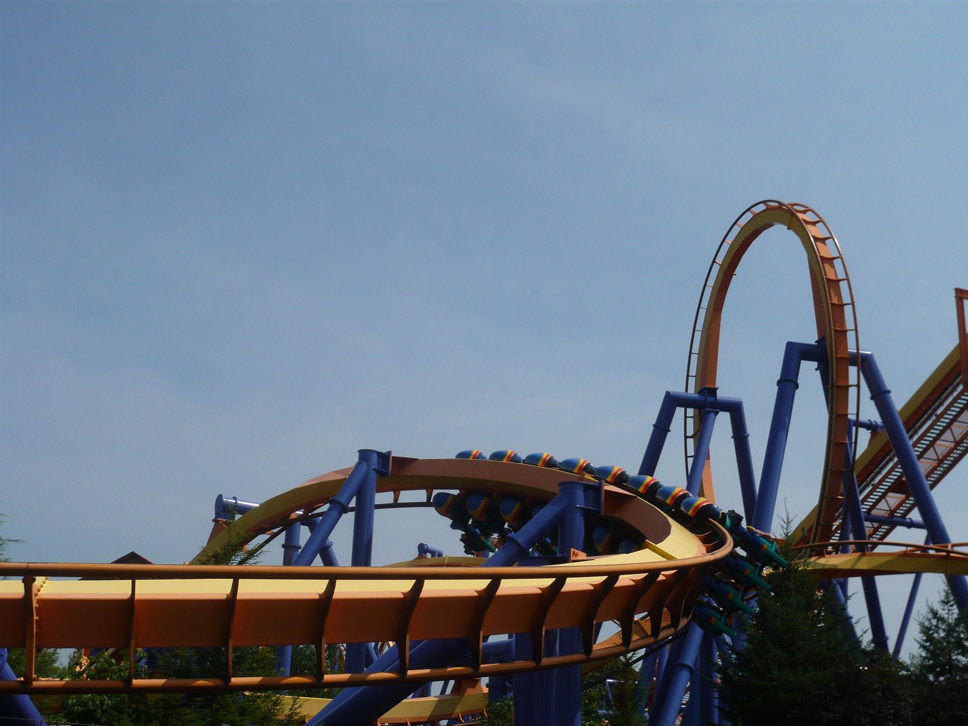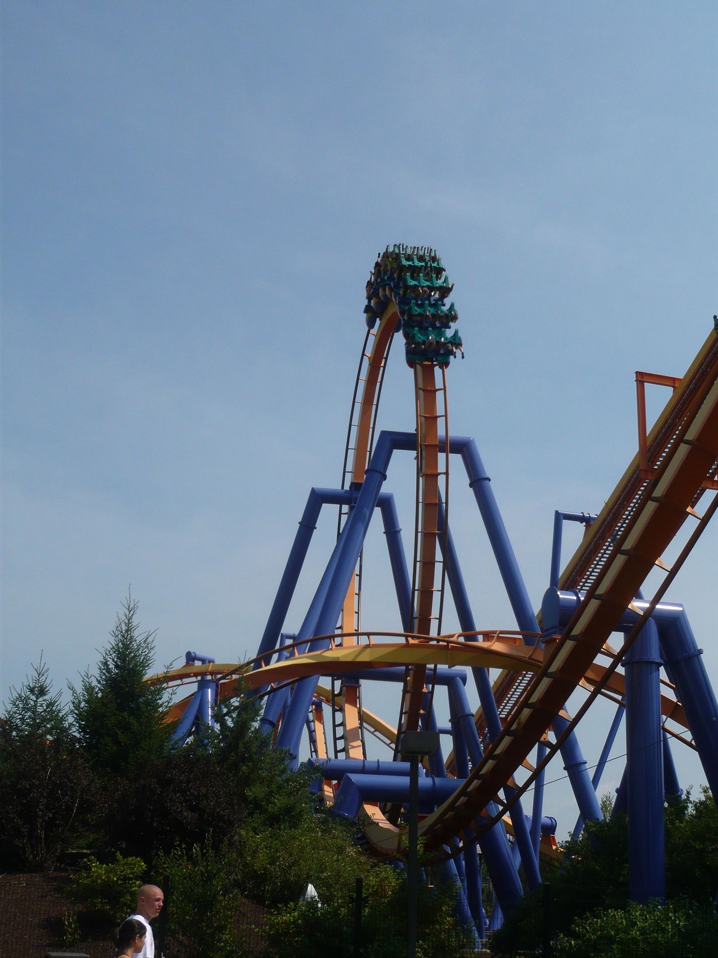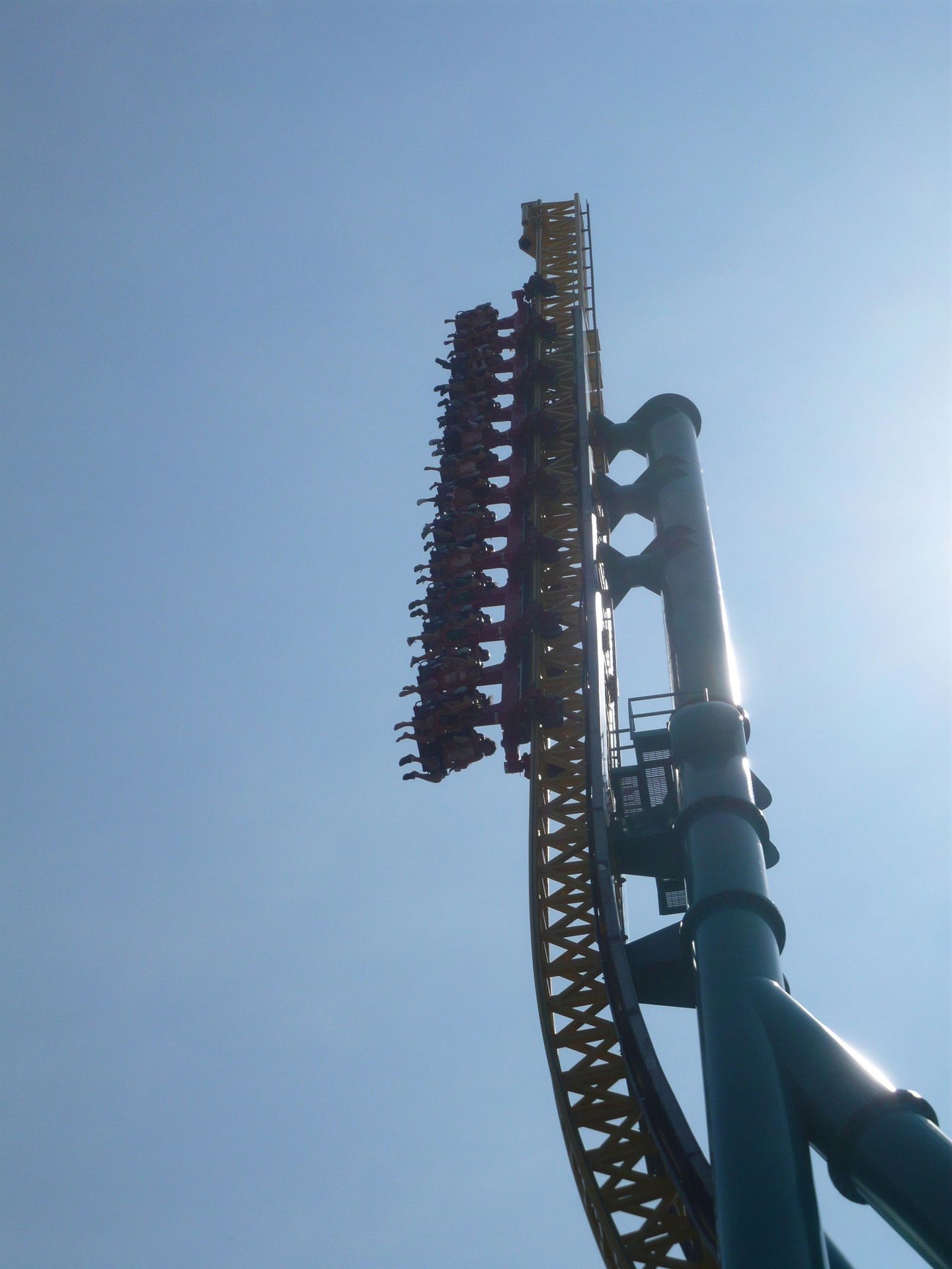 Airtime aufkommen zu lassen. Bloss in den hinteren Reihen erlebt man dank der lockeren Sicherheitsgurte doch so etwas wie ein Schweben. Hierauf ist dann die riesige Umkehrspirale an der Reihe, in deren zweiten Teil man ganz ordentliche positive