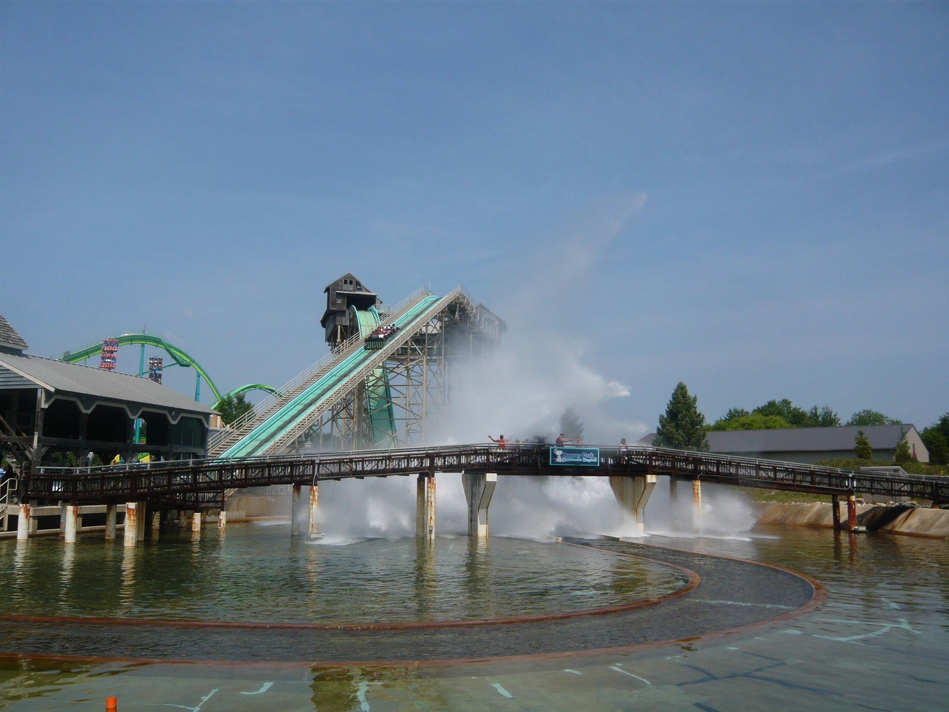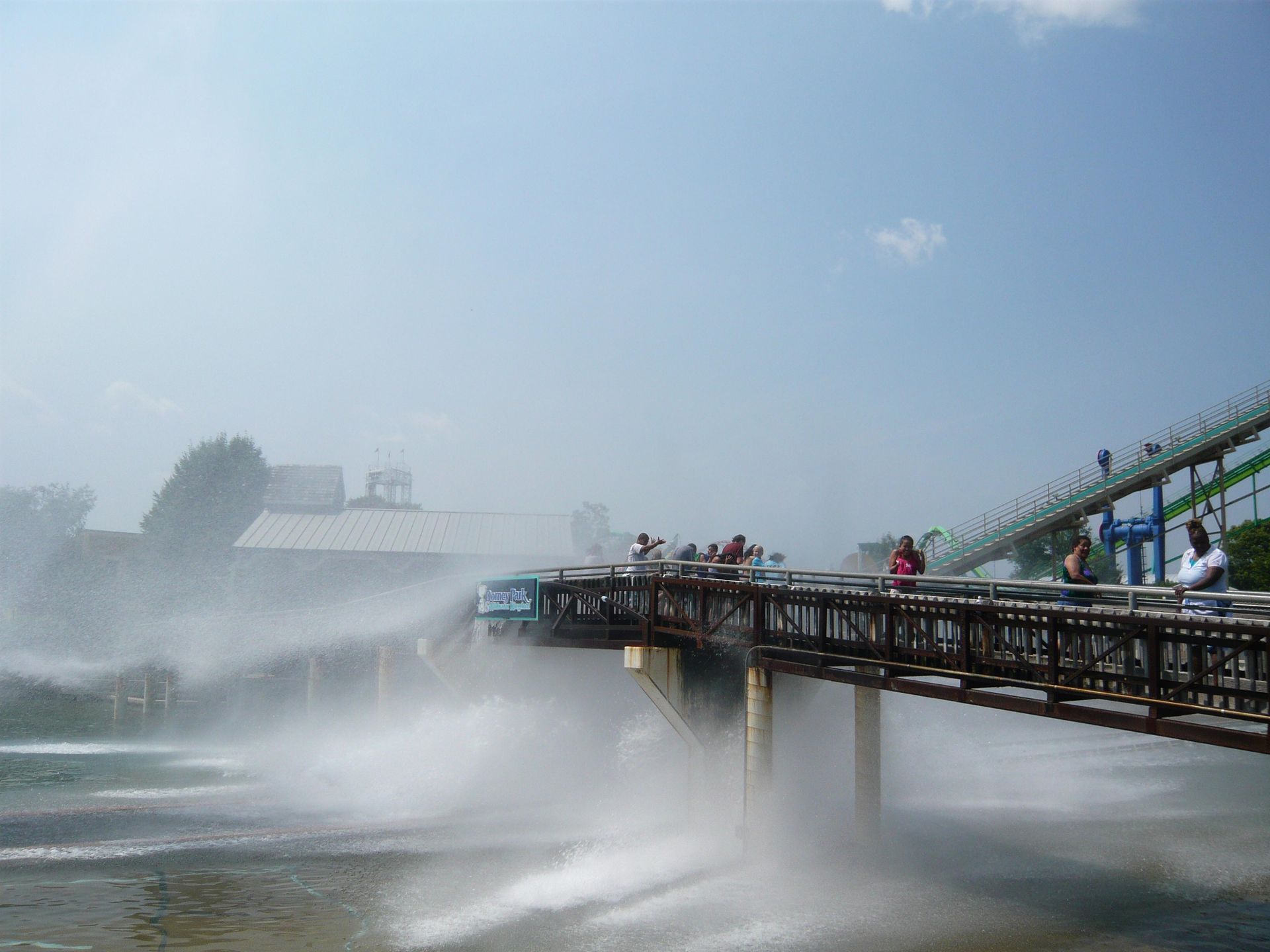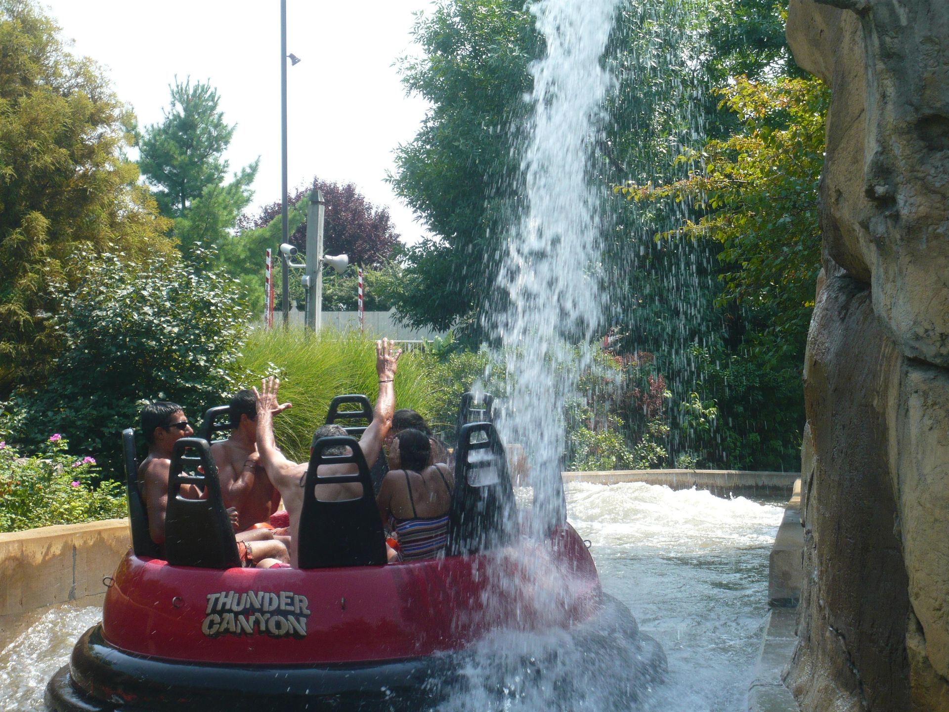 Die Wildwasserbahn Thunder Mountain Creek sah aus, als ob man sie auch in Strassenkleidung schadenlos überstehen konnte, also wagten wir eine Fahrt. Hier mussten wir zum ersten Mal etwas warten, aber nur fünf Minuten oder so. Die Fahrt macht enorm grossen Spass! Nach dem Lifthill mäandriert der künstliche Fluss auf dem Hügel oben ein wenig hin und her und führt danach unter der Kuppe des Lifthills durch. Wobei das überschwappende Wasser in einem Wasservorhang direkt auf die Passagiere herunter gelassen wird - das haben wir nicht kommen sehen!