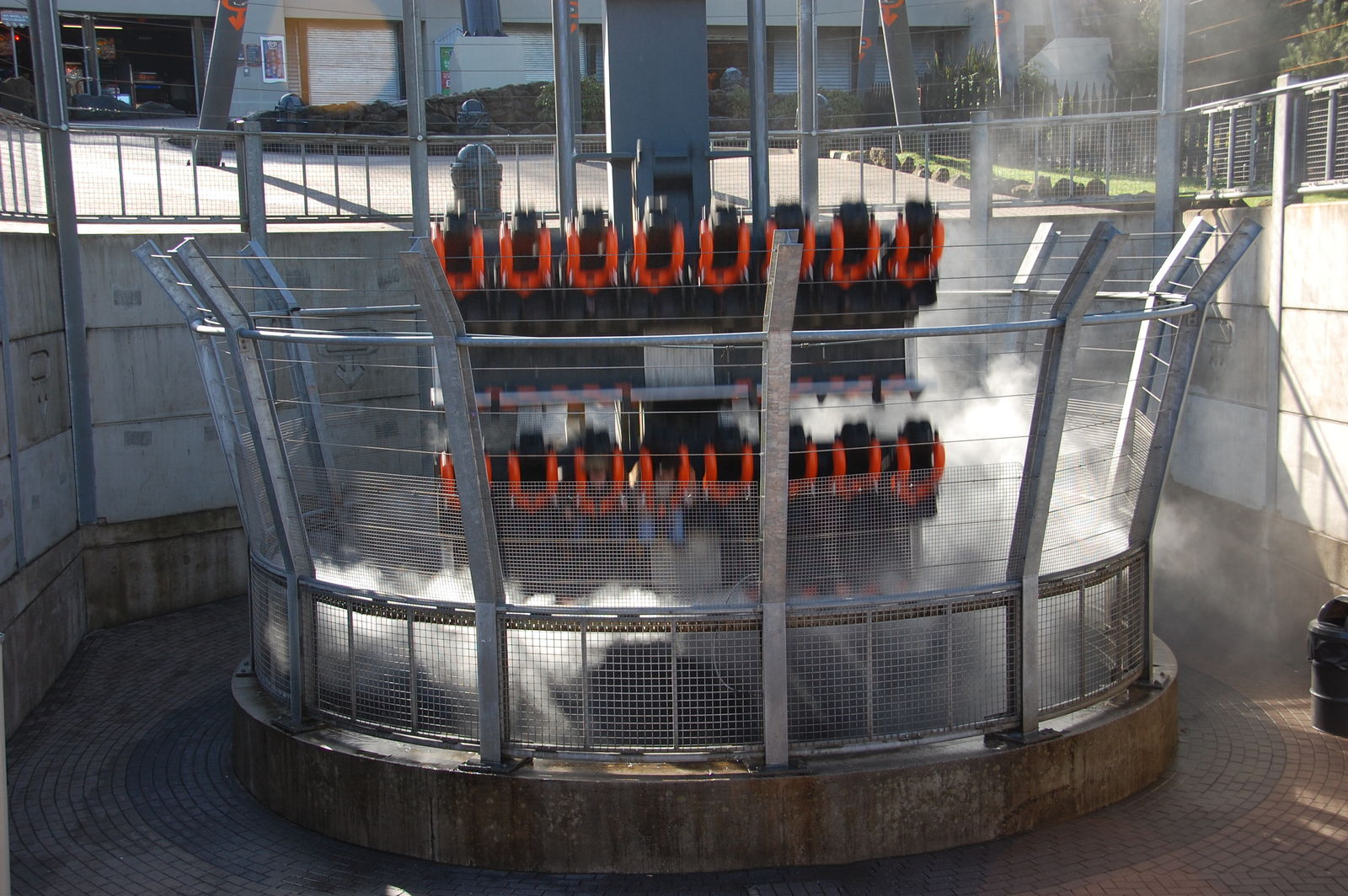 Die Warteschlange schlängelt sich mehrfach um einen kleinen Hügel, auf dem die Station liegt. Während des Wartens und in der Station hängen Monitore, welche von dem Experiment Unknown alias Oblivion berichten. Die Atmosphäre jedenfalls ist super, wenn auch die Thematisierung, vor allem in der Station schon etwas heruntergekommen wirkt. Doch fahren wir erstmal eine Runde. Natürlich gilt: First ride, first... "Go to line B please". Achja, dass man in England den Reihen zugewiesen wird, ist ja mittlerweile bekannt und es klappt auch gut. Die Abfertigung funktioniert hier sowieso schneller und unkomplizierter, also will ich da nicht stören. Schnell in die überhöhte Sitzreihe gesetzt, Bügel geschlossen und los geht’s.
