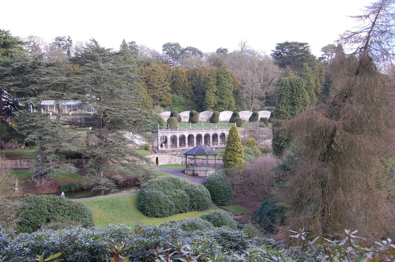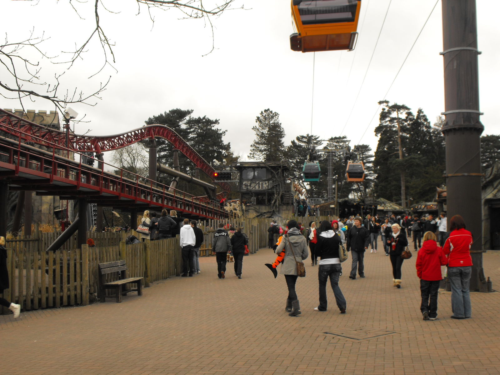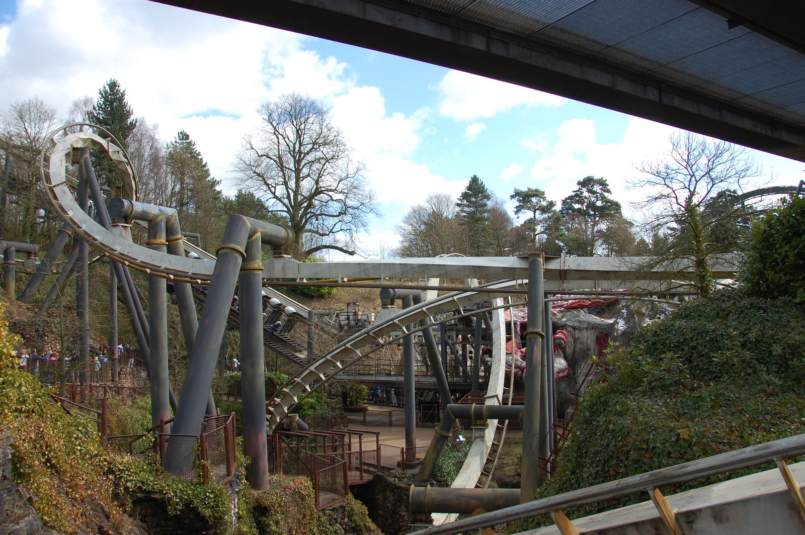 Wer Alton Towers kennt, wird wissen, dass es nun zwei Möglichkeiten gibt, um auf die andere Seiten der Gardens zu kommen, um mit den weiteren Highlights fortfahren zu können: Zu Fuß oder mit der Seilbahn. Da der Höhenunterschied bei +- 80 Metern liegt ist es wohl logisch, dass die Seilbahn genommen wird. Pech für uns, dass weder Gondeln an den Seilen hingen, noch es so aussah als würde sie gleich öffnen. Entweder man geht dann einen riesen Bogen um die Gardens oder Querfeldein. Wir entschieden uns für Zweiteres, auch wenn ich es noch bereuen sollte.