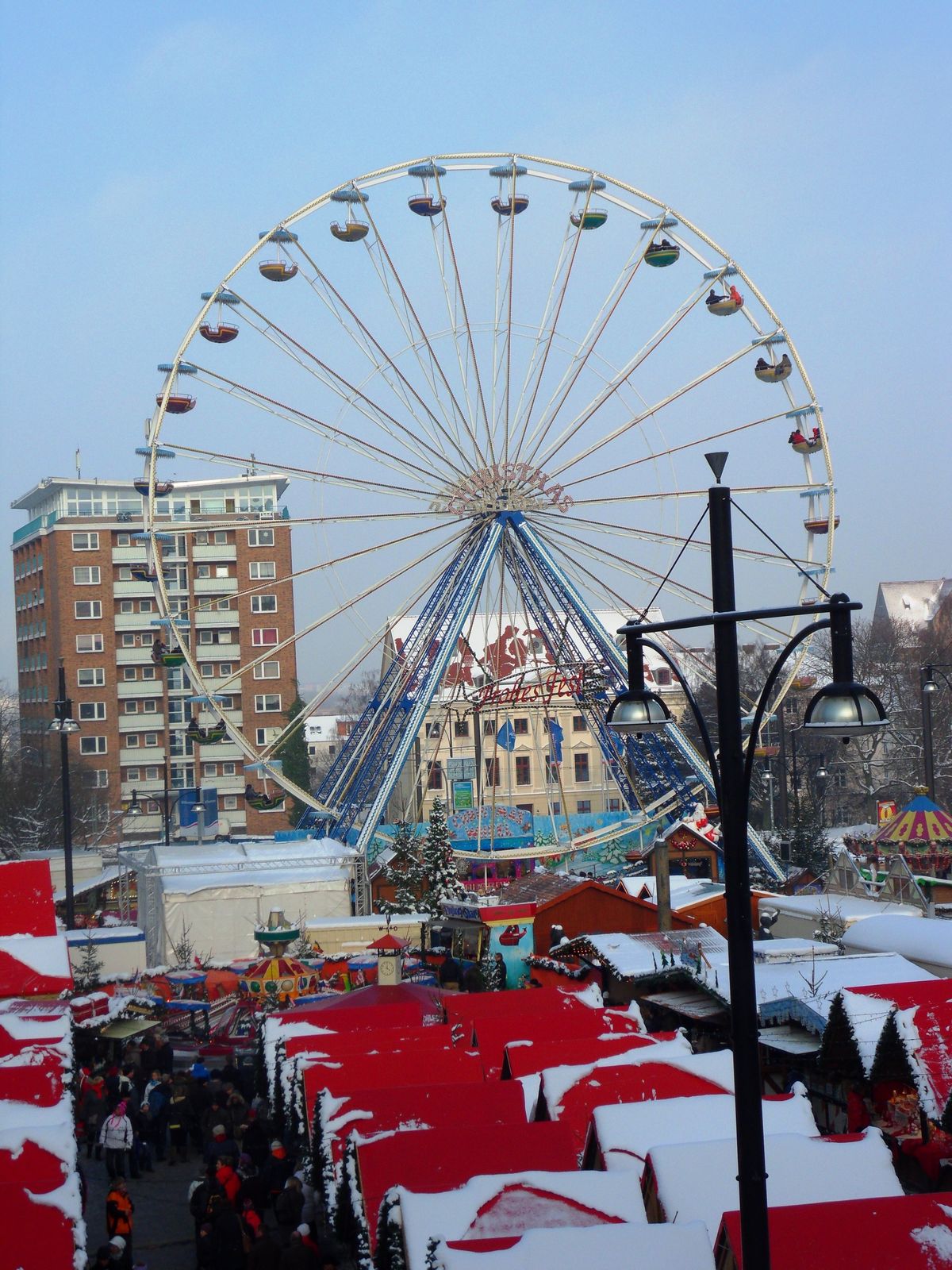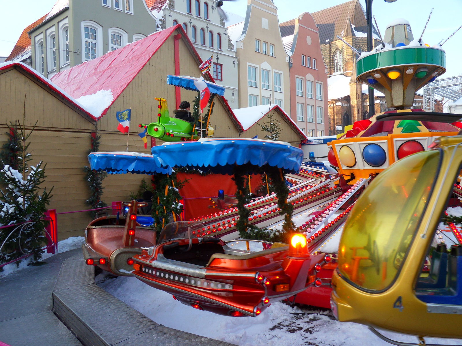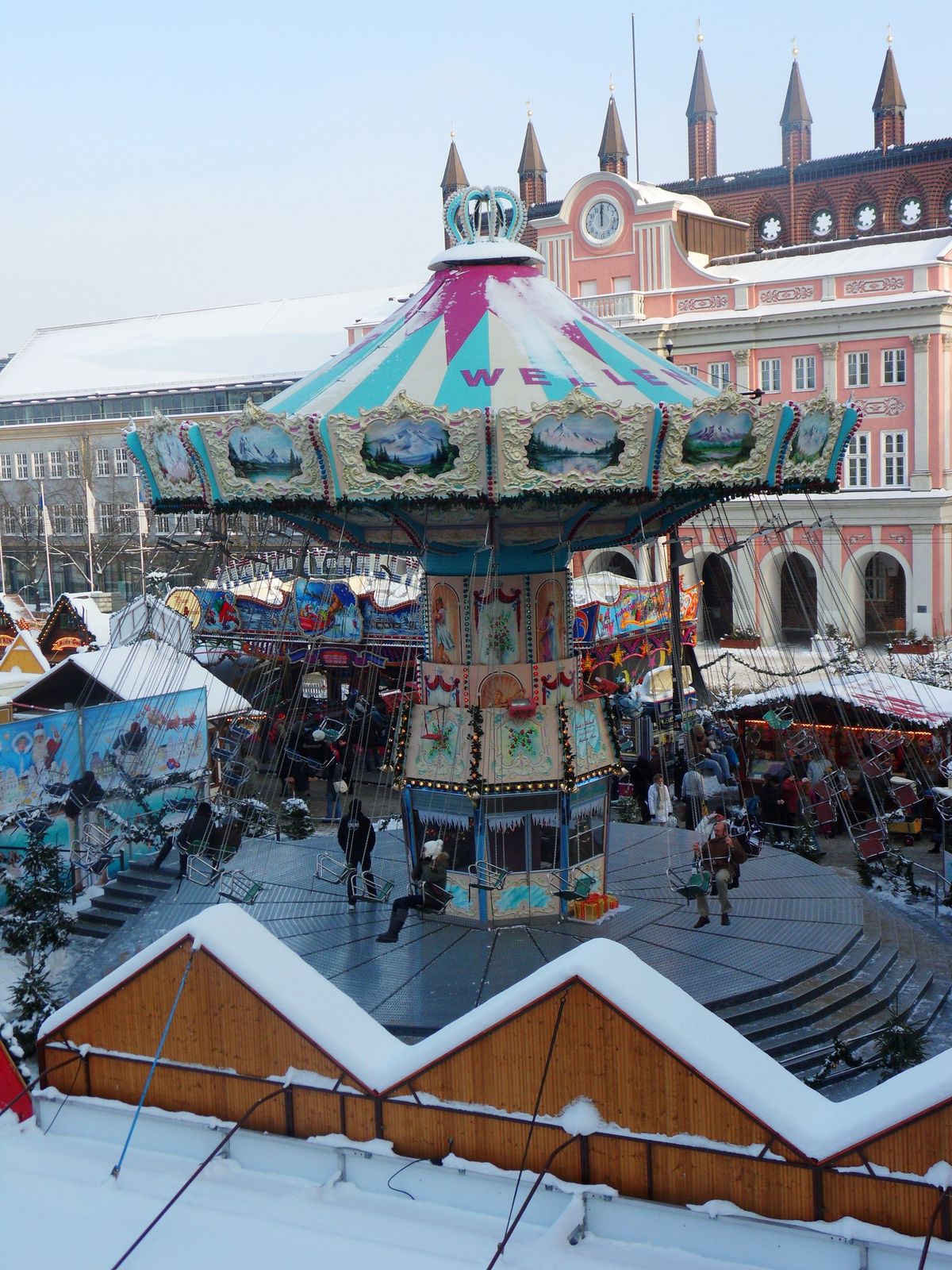 Mit Weihnachtsmarkt verbinden die meisten wohl eher Geschenkeläden, Kitschverkäufe und kleine Kinderkarussells. In Rostock werden im Dezember etwas größere Geschütze aufgefahren. Neben dem obligatorischen Riesenrad wurde eine ganze Kirmes aufgebaut- inklusive Achterbahnen, Starflyer und Breaker. Kein Wunder, dass der Aufbau schon teilweise zwei Wochen vor Beginn des Weihnachtsmarktes am 25.11.2010 begann.