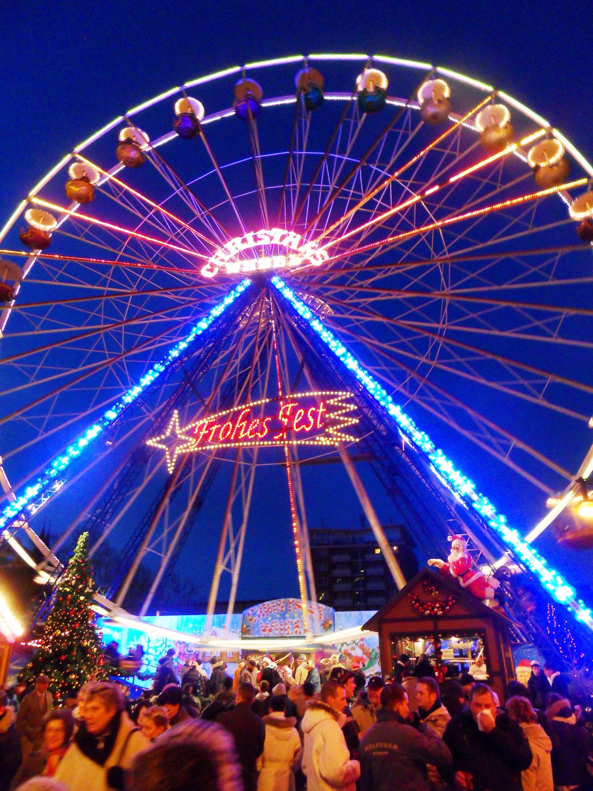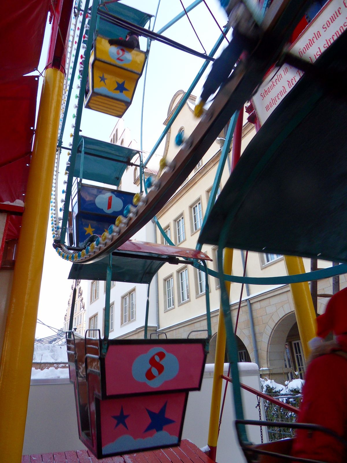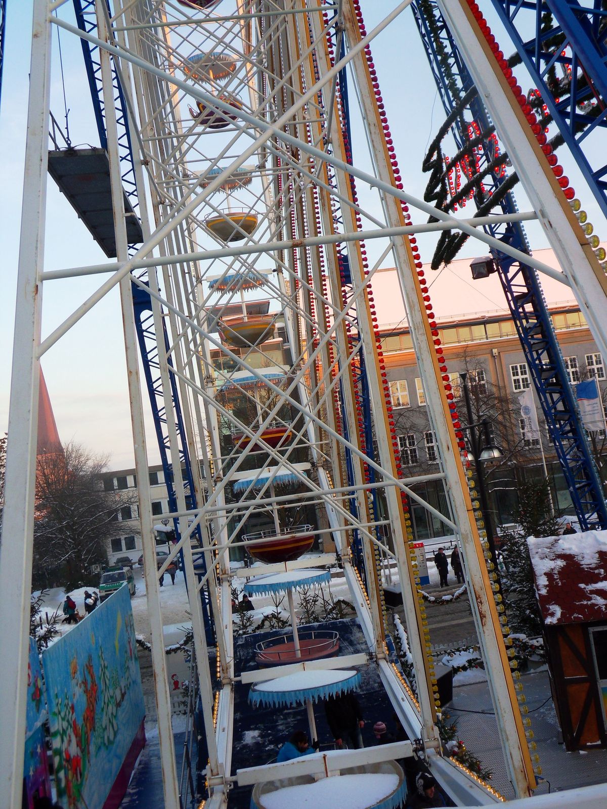Das klassische Riesenrad darf eigentlich auf keinem Weihnachtsmarkt fehlen. So hat man doch von oben einen traumhaften Blick auf die weißgeschneite Stadt und kann dem Vorweihnachtstrubel für ein paar Minuten entfliehen. Das man sich nebenbei den A**** abfriert, weiß man immer erst hinterher. Gut, dass es gleich nebenan diverse Glühweinbuden gibt. Irgendwie ein fieser Trick von diesen Riesenradleuten…