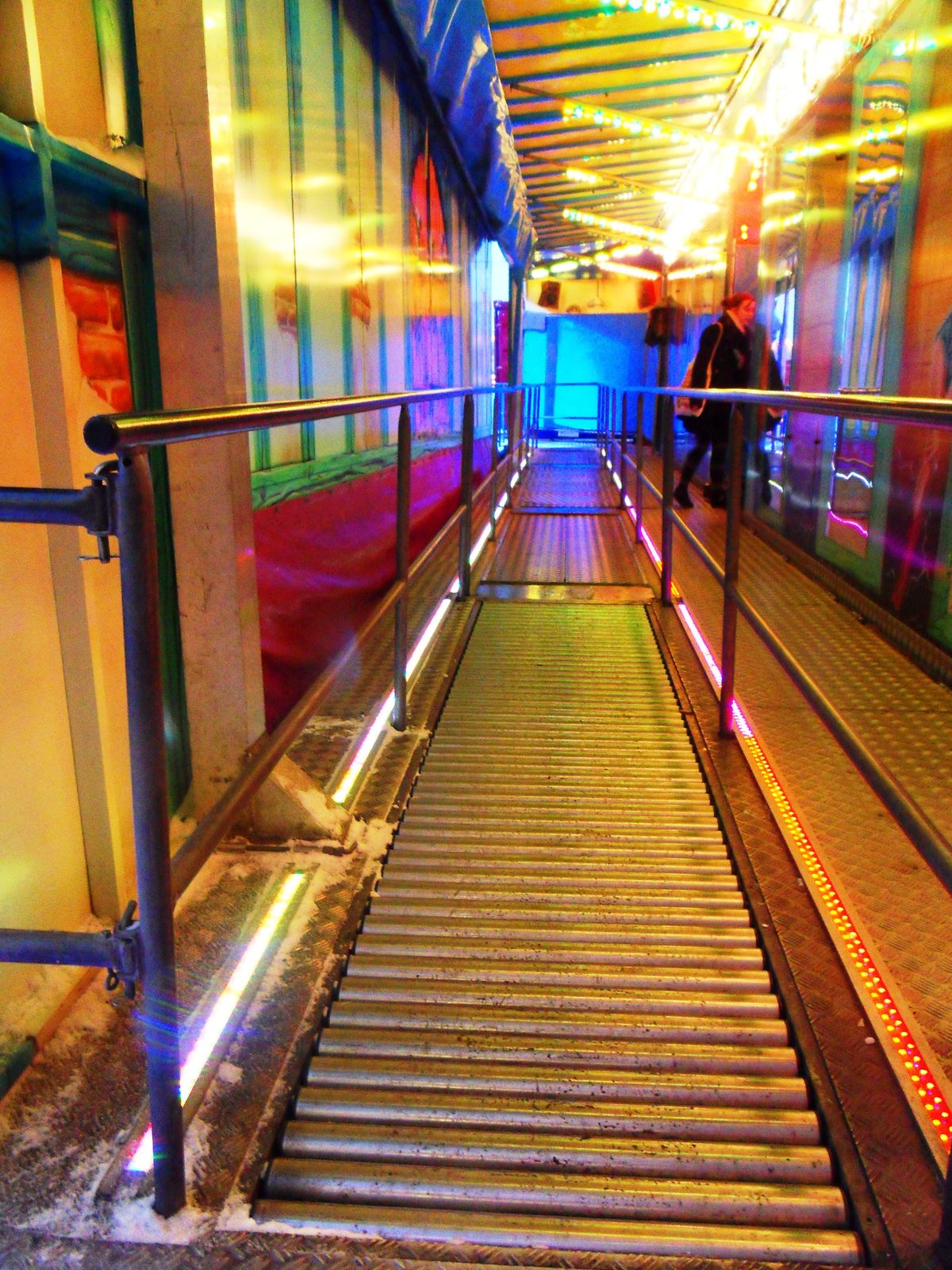 Das Münchner Lach + Freu-Haus war nicht zum ersten mal in Rostock. Bereits vor drei oder vier Jahren bescherte es mit bayrischen Späßen ein paar nette Minuten. Damals hatte das Haus aber noch nicht den Kuhstall-Anbau auf der linken Frontseite. Dieser beinhaltet einen drehenden Tunnel, der zu Freude der draußen stehenden „Zuschauer“ die Leute zu Stolperpartien einlädt. An der ehemaligen Stelle im Innern des schaukelnden (!) Hauses klaffte leider eine Lücke, die notdürftig mit Planen abgedeckt wurde. Ich bin aber sicher, dass den Distels noch irgendwelche kranken Ideen kommen.